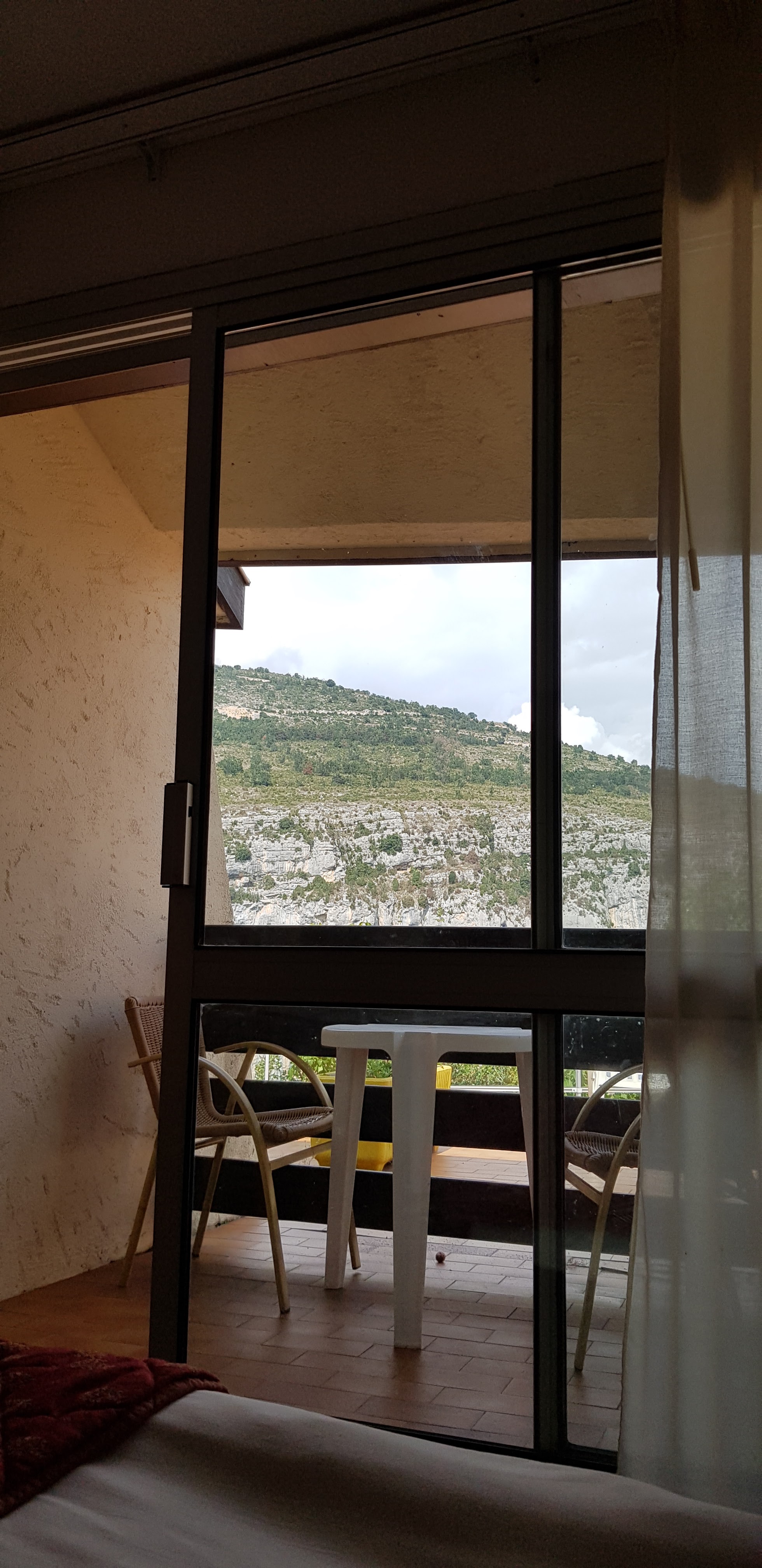 Belle chambre avec terrasse au soleil et vue sur les falaises du canyon. Équipe sympathique et accueillante. Salle de restaurant entièrement vitrée plongeant sur le Verdon.