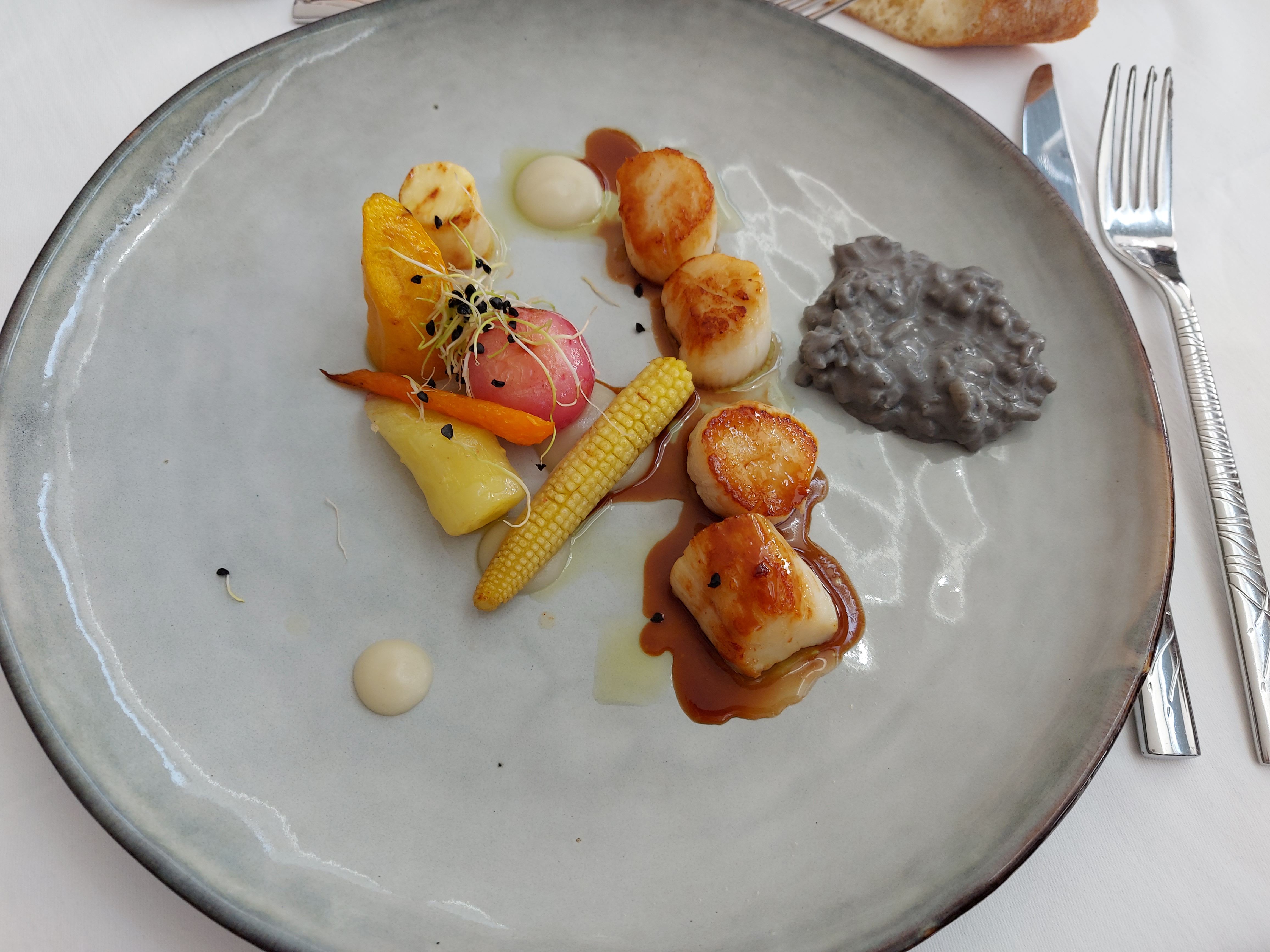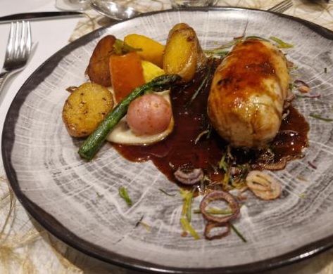assiette super belle et bonne, par contre ayant pris les noix de saint Jacques ,un peu plus de légumes aurait appréciable tout comme l'apéritif maison la coupe pas remplie et le verre de blanc servi même pas à la moitié vu les tarifs. le service très bien mais trop de manière ça nous a mi mal à aise sachant qu'on était dans une auberge pas dans un château