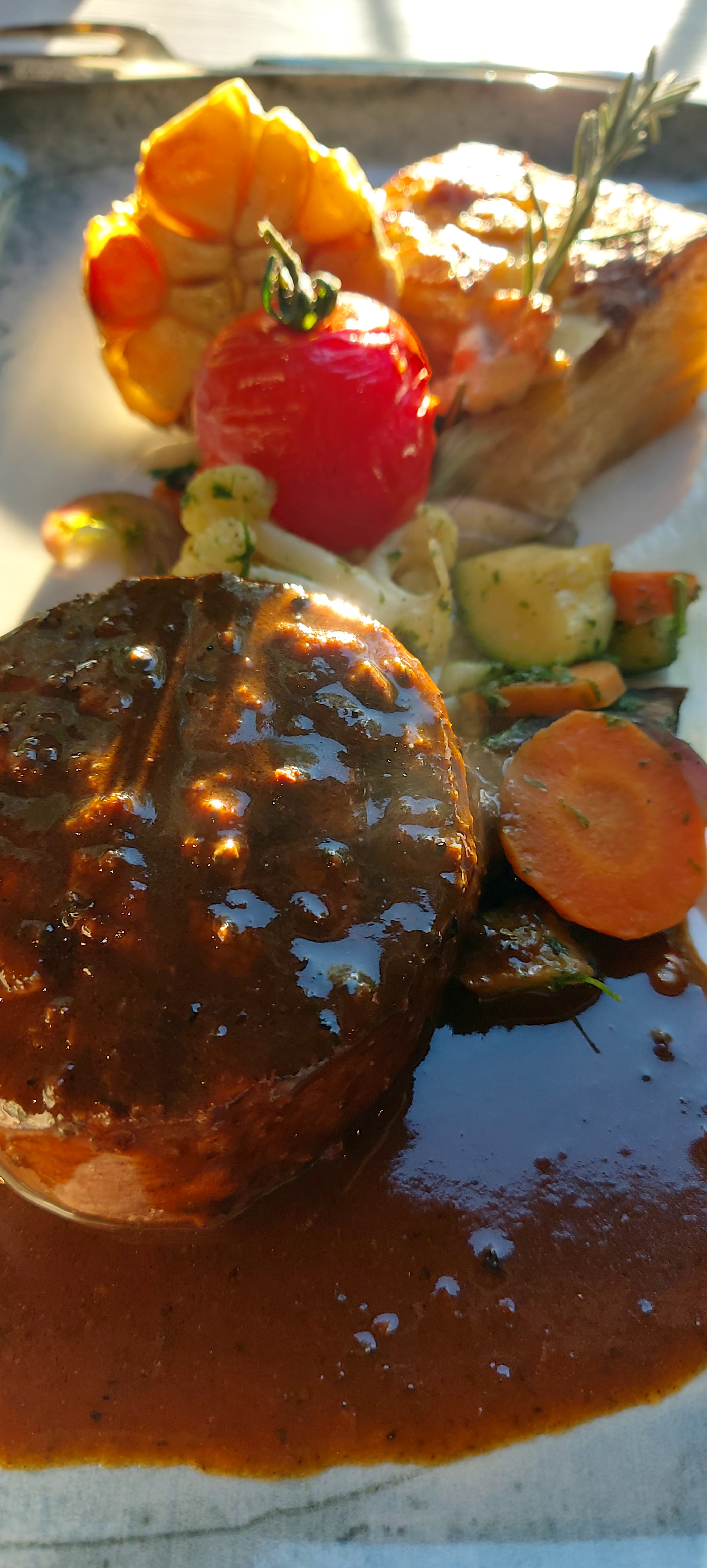Nourriture absolument délicieuse, surtout les entrées et les desserts. La nourriture est aussi bonne que savoureuse. Belle terrasse. On m'a même proposé une couverture lorsqu'il faisait froid sur la terrasse.