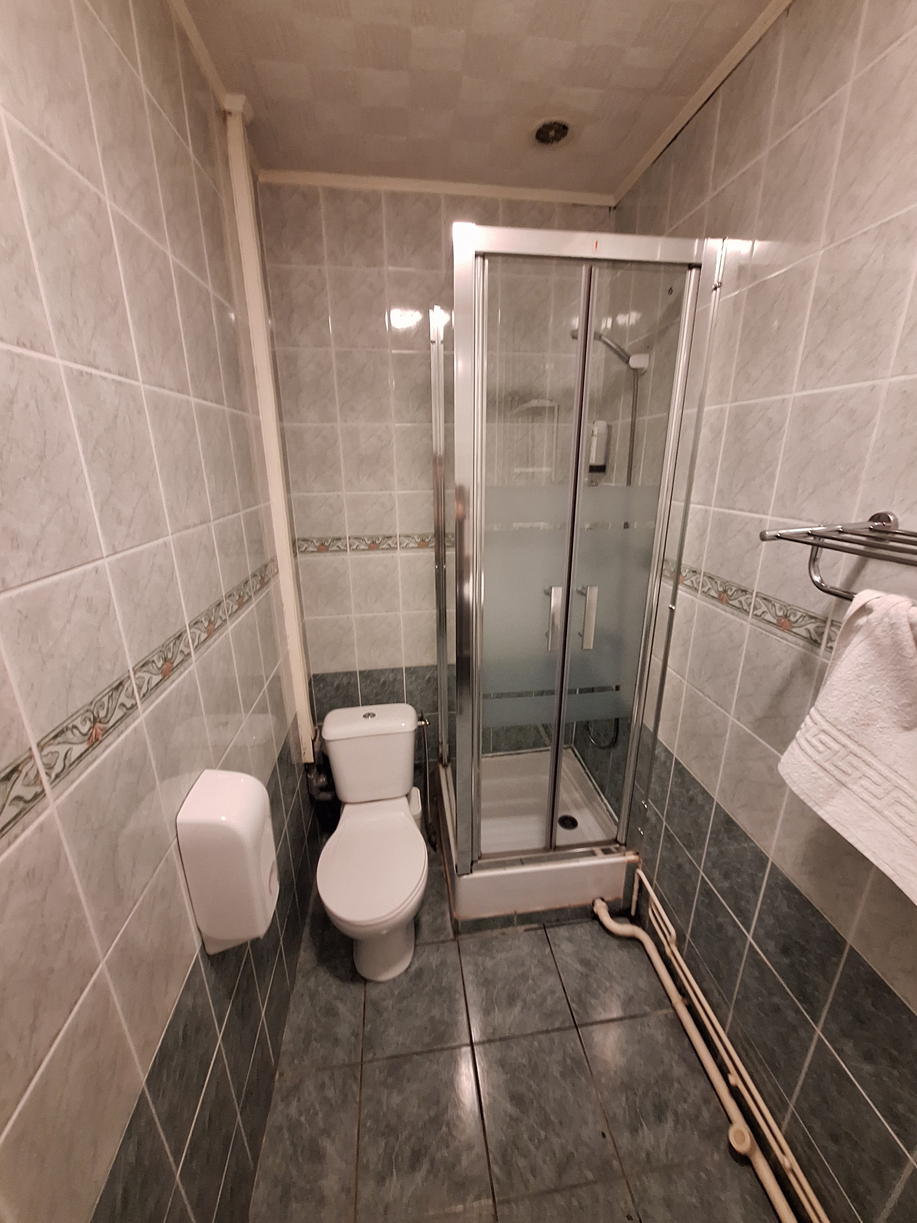 Chambre de petite taille, salle de bain vraiment trop petite , surtout le toilette collé à la paroi de douche n'est pas pratique. WC bruyant, chambre mal insonorisées, on entend la route et les voisins qui toussent ou autre . Côté restauration, ça ratrape un peu la soirée étape. Bref pour une nuit ça peut passer si on a que ça.