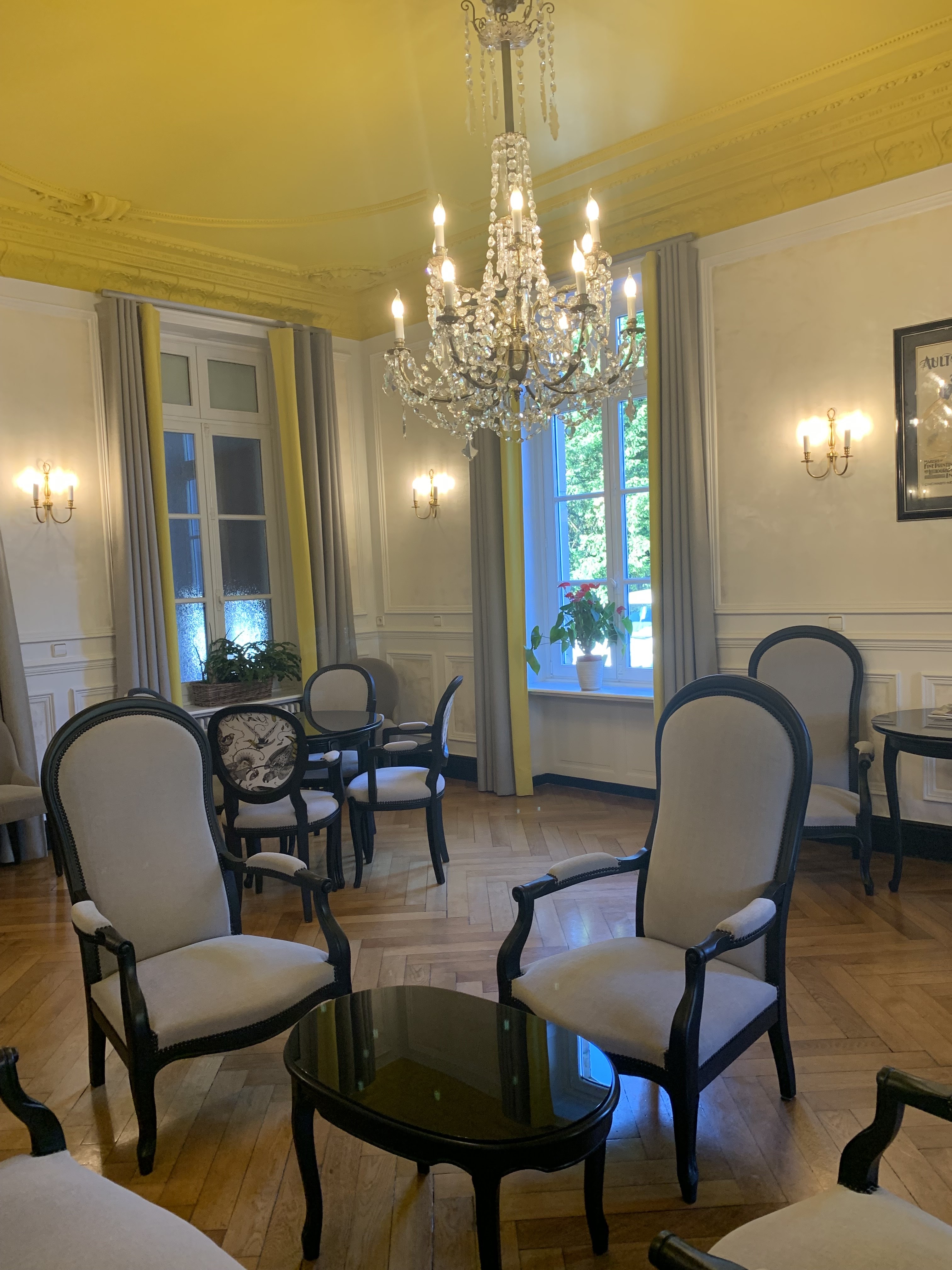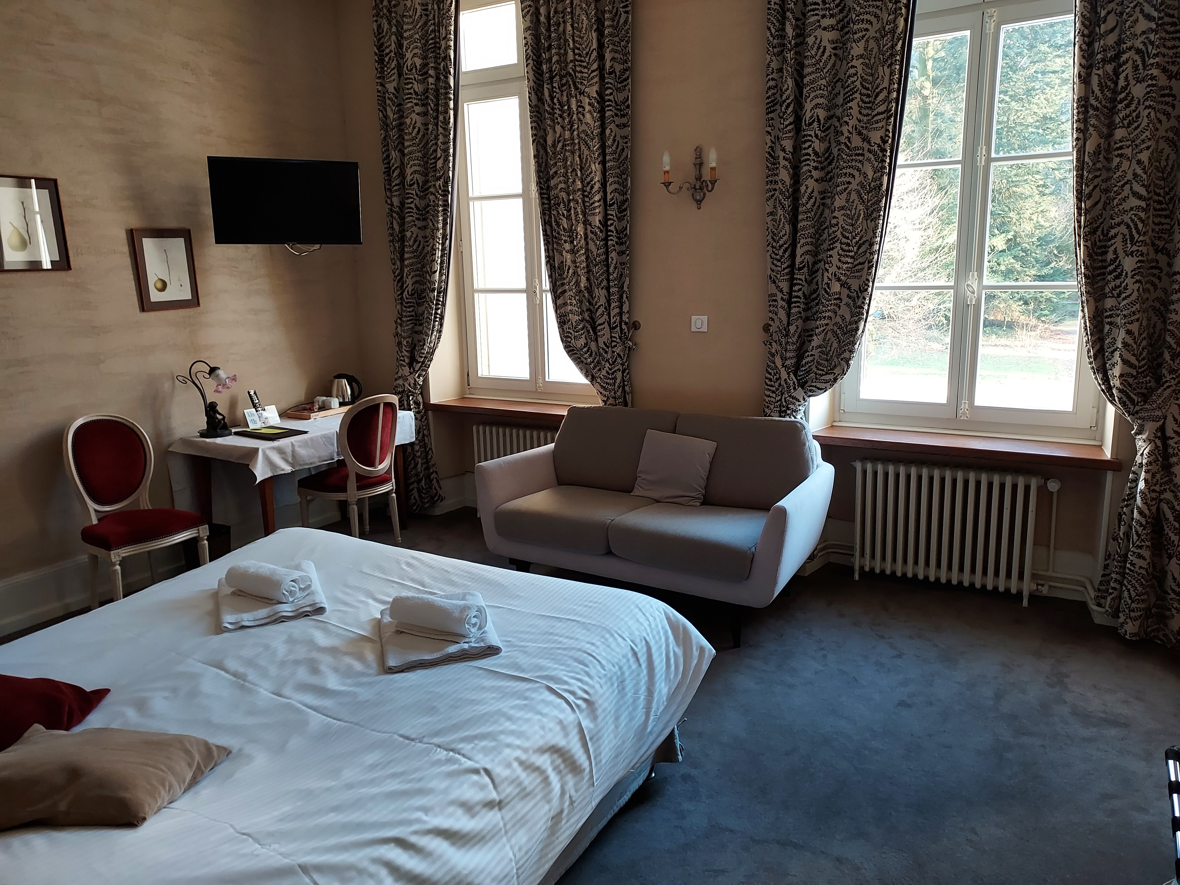 Nous avons passé une nuit dans une chambre supérieure, qui donnait sur le parc. Très jolie demeure, grande chambre qui respecte la décoration traditionnelle de la bâtisse, très propre, très calme. Le repas du soir au restaurant était un réel plaisir : des mets de qualité, très bien cuisinés et superbement présentés. Un service de grande qualité avec 2 personnes aux petits soins. Le buffet de desserts est incroyable ! La salle moderne et très agréable, avec sa jolie cheminée. Une table remarquable ! Notre séjour s'est terminé avec un petit déjeuner avec beaucoup de choix et un délicieux cake fait maison. Seul bémol : nous aurions aimés être avertis lors de la réservation que l'espace bien-être était fermé pour restrictions énergétiques. Sur le site il est écrit fermé en janvier alors que nous sommes venus en février.
