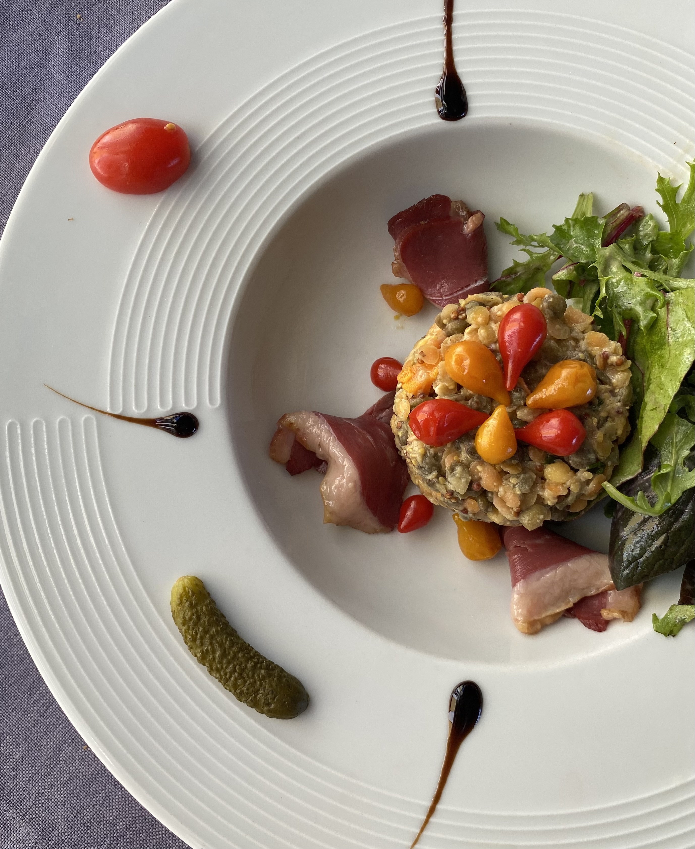 Moment parfait! Delicieux repas sous le regard d'un incroyable cèdre quadricentenaire. Plein de couleurs et de goûts dans des assiettes composées avec l'intention manifeste du chef et de la pâtissière de faire plaisir à leurs hôtes. La personne chargée du service est souriante et sympathique. Et à la fin l'addition est on ne peut plus raisonnable. Rapport qualité/prix au top