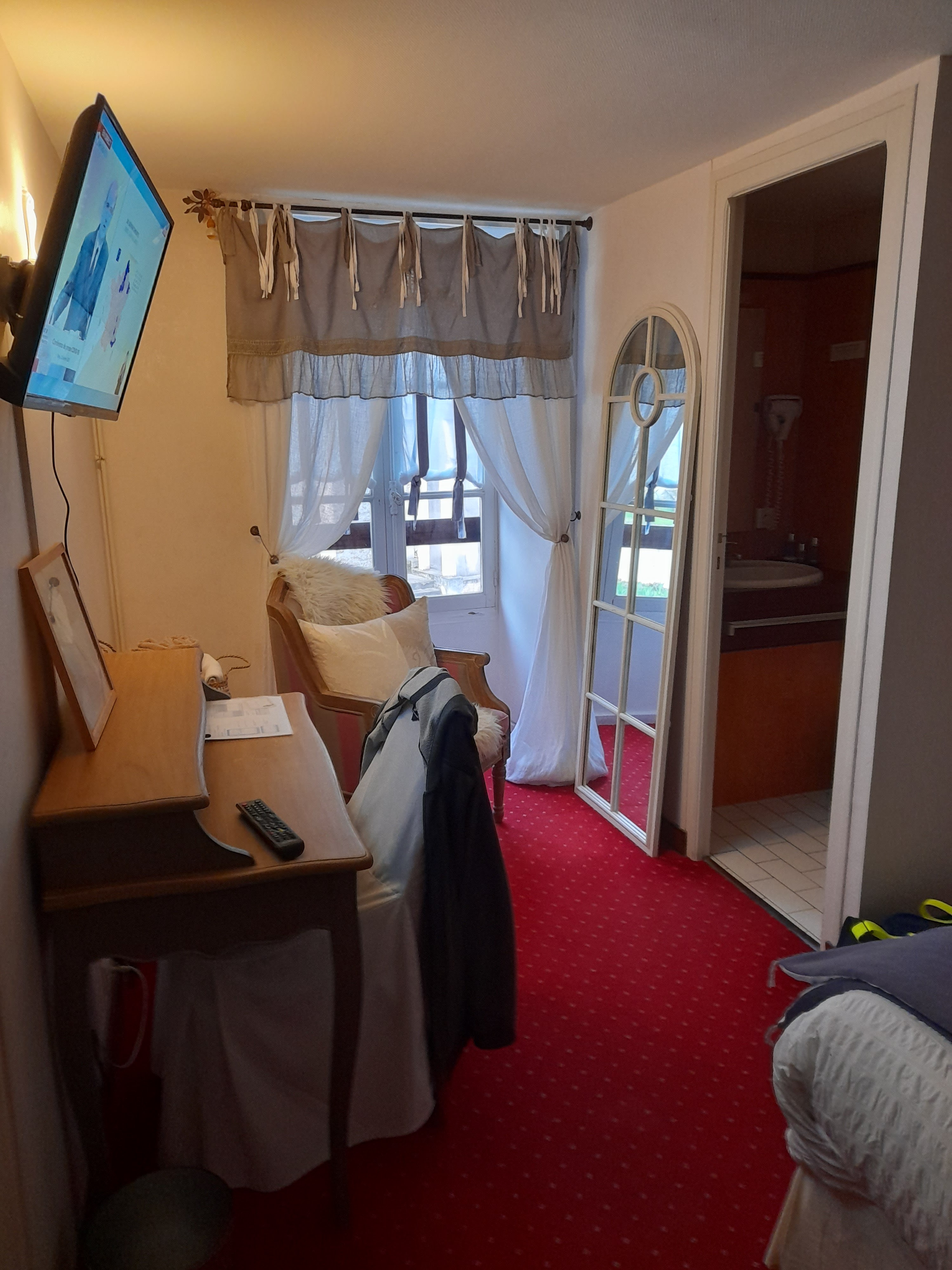 Accueil par téléphone parfait. Toutes les informations étaient claires et concise. Chambre confortable et cosy. Grande télé 📺, salle de bain propre avec tout le nécessaire. Douche trop exiguë et insonorisation entre chambres un peu limite. Ceci dit tout est calme après 22h. La restauration est excellente servie en chambre (Covid oblige) Petit déjeuner de qualité (merci pour le service avant l’heure) Je recommande pour la gentillesse et la qualité général.