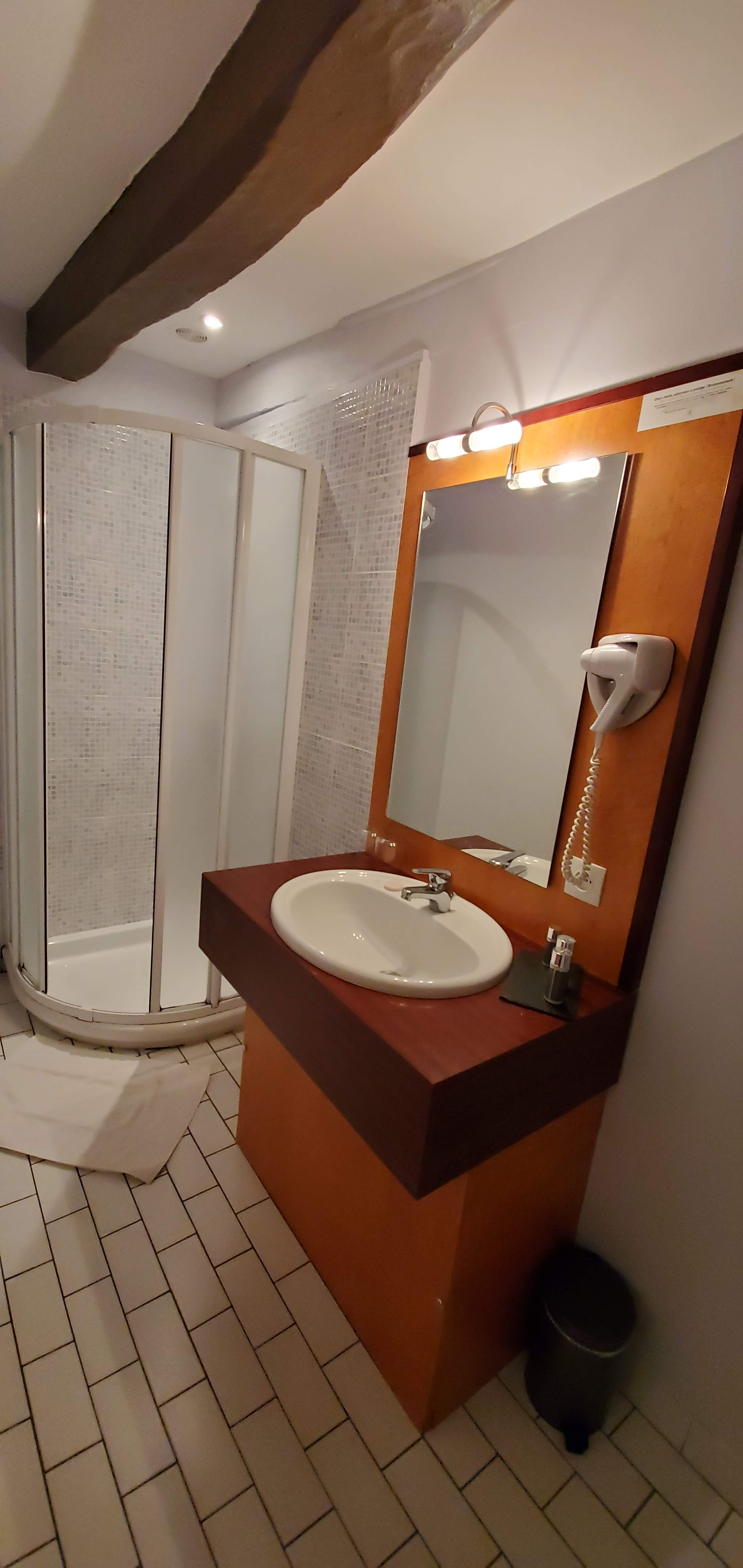 Pas de rideau de douche, salle de bain trop petite donc on ne pouvait se doucher que dans la baignoire. Les toilettes étaient dans un coin très exigu. Il manquait un porte-rouleau de papier toilette. Le petit déjeuner était insuffisant, nous avons retrouvé les restes. Plus de baguette, plus de lait avec du café, plus de fruits, plus de fromage. Il y avait des croissants brûlés. Seul le yaourt d'une tasse d'une marque bien connue était savoureux. Il restait un demi-verre de jus d'orange. Nous étions 2 personnes et avons payé 9 € par personne.