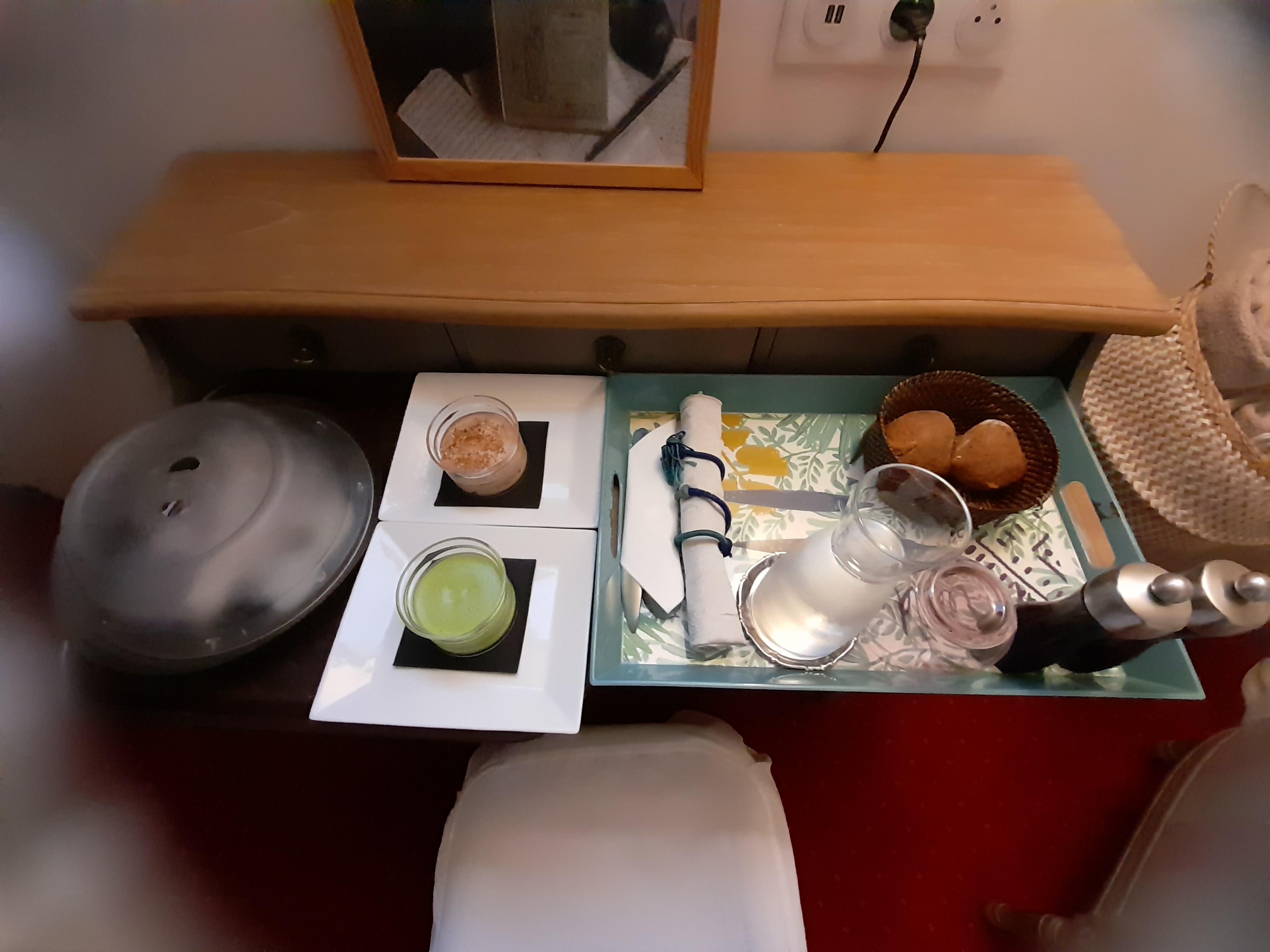 Repas du soir : Ceviche de daurade ; trop d'épices, on ne sent plus le goût du poisson. Seiche (cuite à point) mais galette de polenta brûlée. J'ai enlevé le dessus carbonisé pour le mettre sur le bord de l'assiette et le montrer à la serveuse : aucune excuse, pas de proposition de remplacement… Chambre n°10: Pas de serviettes de toilette ! (j'ai dû redescendre pour en demander), réveil lumineux pas à l'heure et impossible à régler ! Fenêtre ancienne en bois avec simple vitrage qui permet d'être réveillé à 5h15 par le chant du coq qui ne termine son récital qu'1h1/2 plus tard