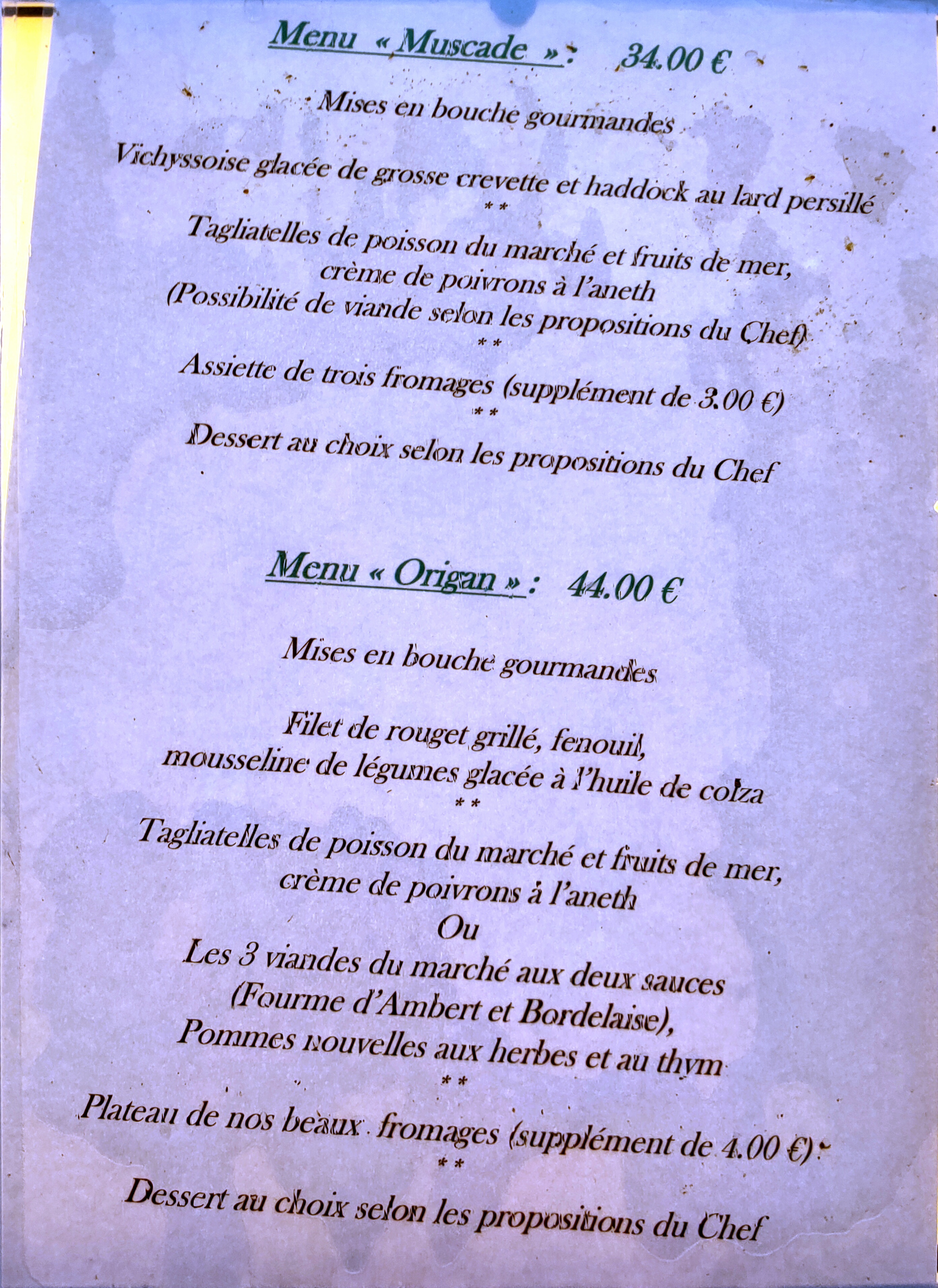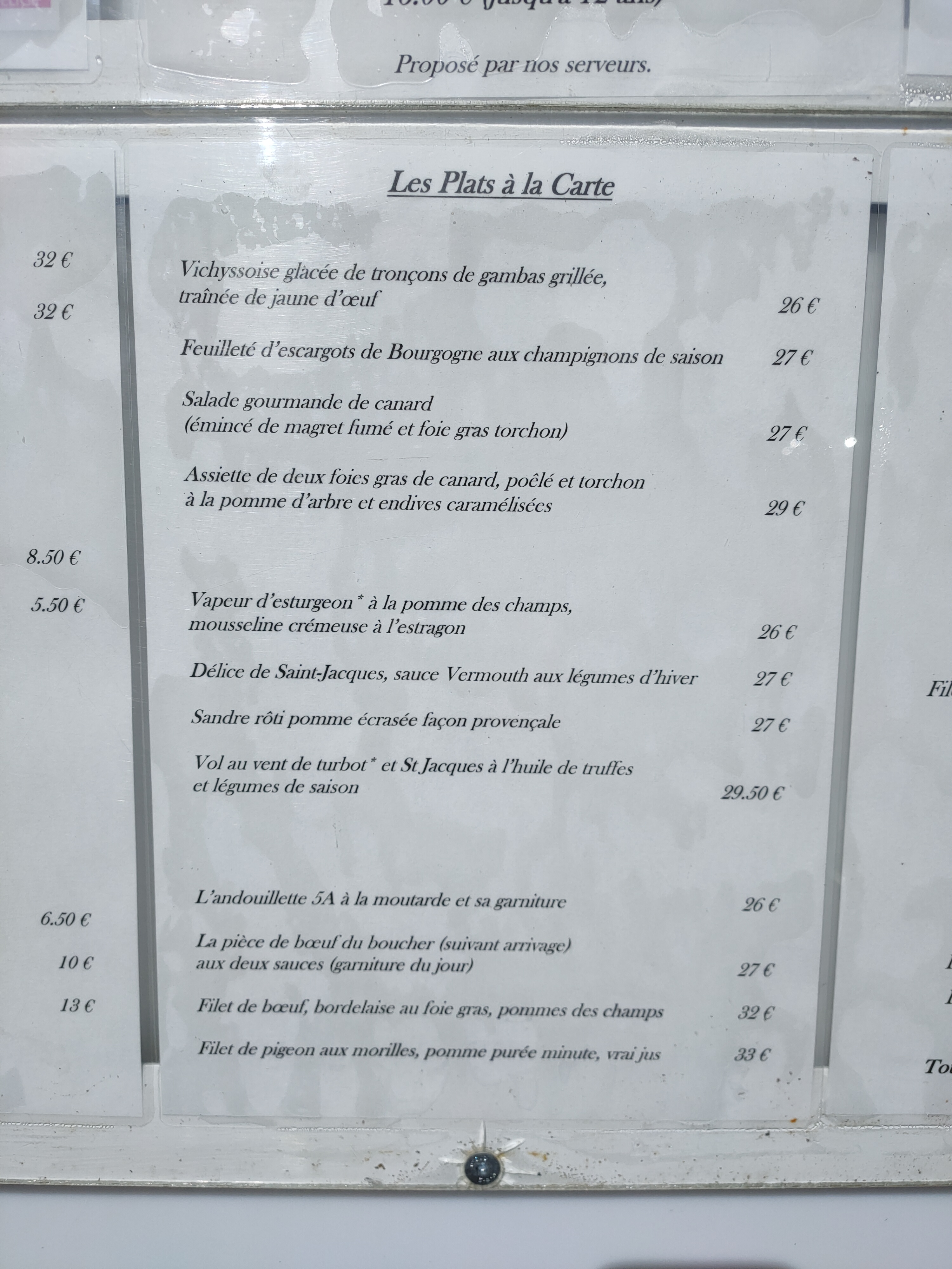 Repas de famille en semaine. Premier menu à 22 euros. En dehors du plat principal qui était de bonne facture (de la bonne viande Charolaise avec des champignons de saison) Il faut oublier l'entrée et les desserts. Je déconseille ce restaurant.