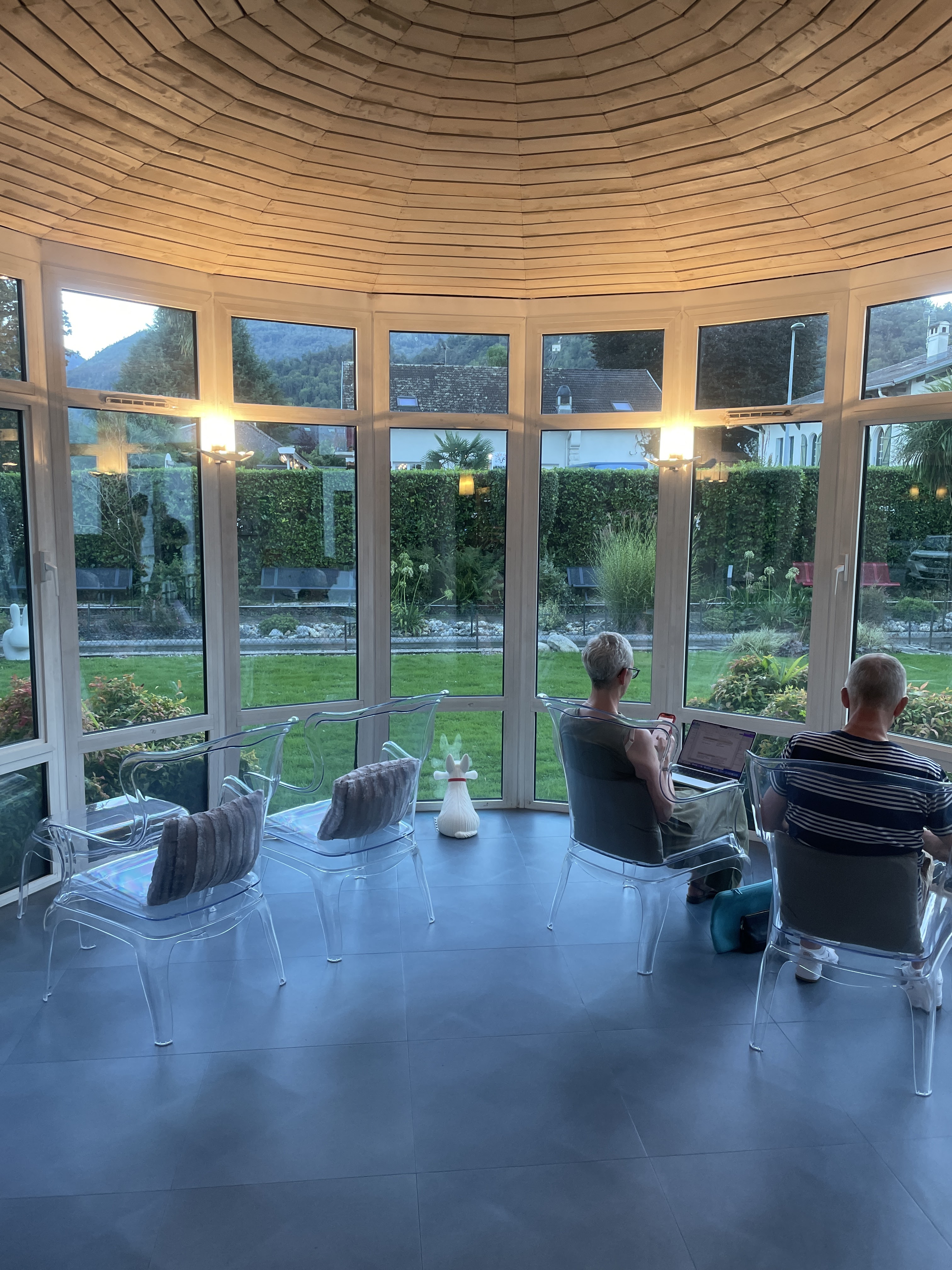 Idéalement placé en face du parc des thermes, une équipe de direction aussi efficace que conviviale, et un restaurant de grande qualité.Cerises sur le gâteau, il y a une borne pour voiture électrique, une salle de fitness et un local pour vélo de randonnée. Séjour parfait .