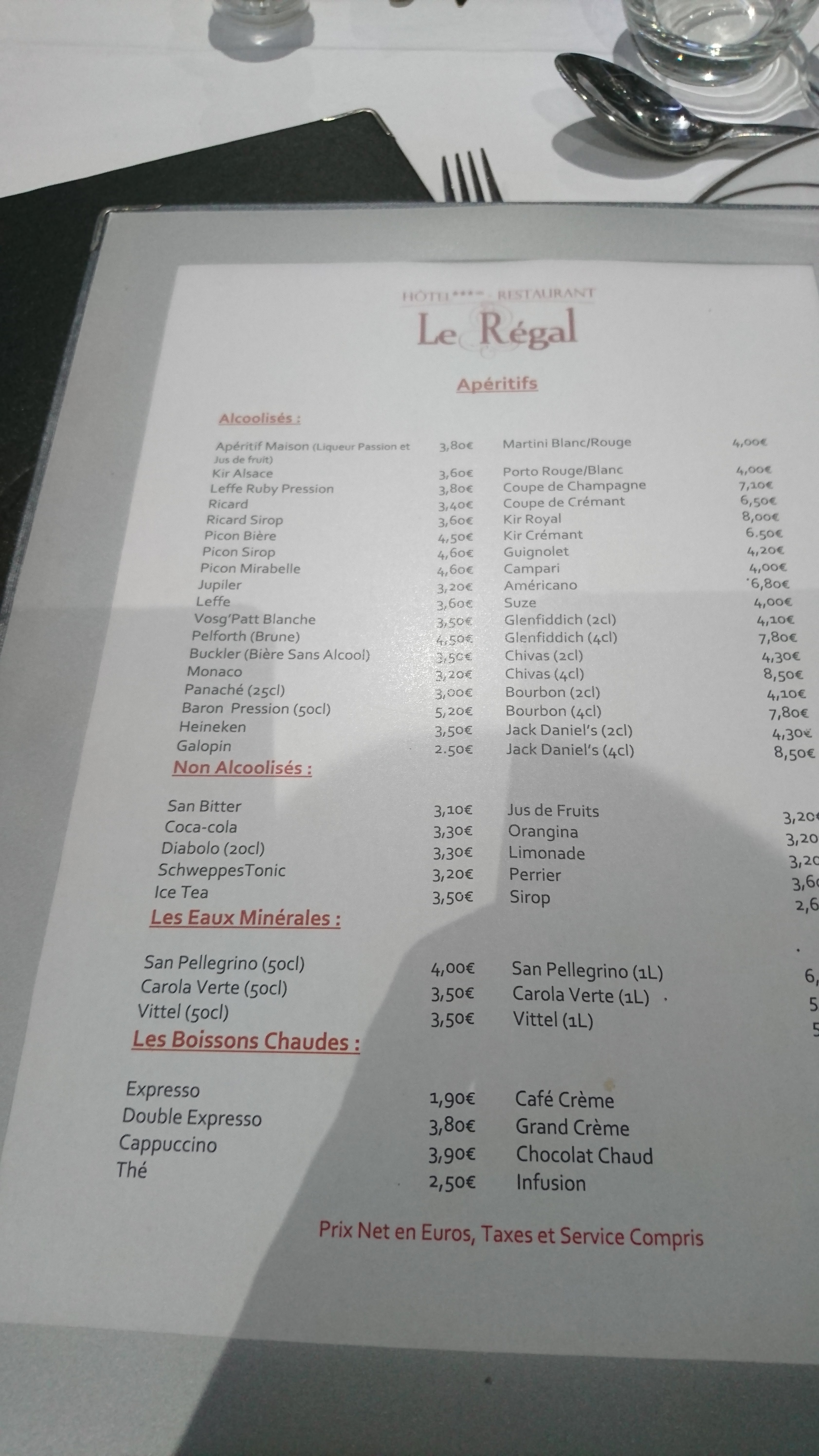 S'il est bien un lieu qui porte bien son nom, c'est le Regal L'accueil est vraiment chaleureux et notre hôtesse nous a précédés dans la salle de restaurant tres élégamment décorée de noir et argenté. Moquette moelleuse, tables élégantes, vaisselle chic, et sièges médaillons garnis de tissus noirs a papillons multicolores. Vraiment classe, sans ostentation. Nous avons choisi un menu gourmand à 45 euros. Pour commencer des filets de cailles avec une sauce crème et figues magnifiquement présentés. Jamais je n'avais mangé volaille aussi extraordinairement tendre et juteuse. Un régal qui restera dans mes annales. Puis un risotto d'asperges crémeux à souhait accompagné de St Jacques snackees et nappees de sauce. Plat exquis, réalisé parfaitement et présenté artistiquement. Enfin un café gourmand très généreux, plein de petites bouchées sucrées délicieuses. Vraiment, le Regal vaut le détour à lui seul . Ajoutez à cela, le parc autour du restaurant avec son étang, ses cygnes et ses wallabies et tout est réuni pour passer un merveilleux moment. St Die et ses environs sont très beaux et après un bon repas, arpenter les allées moussues de l'arboretum du col du Haut Jacques, juste à côté, a ajouté une touche finale idéale à une journée délicieuse.