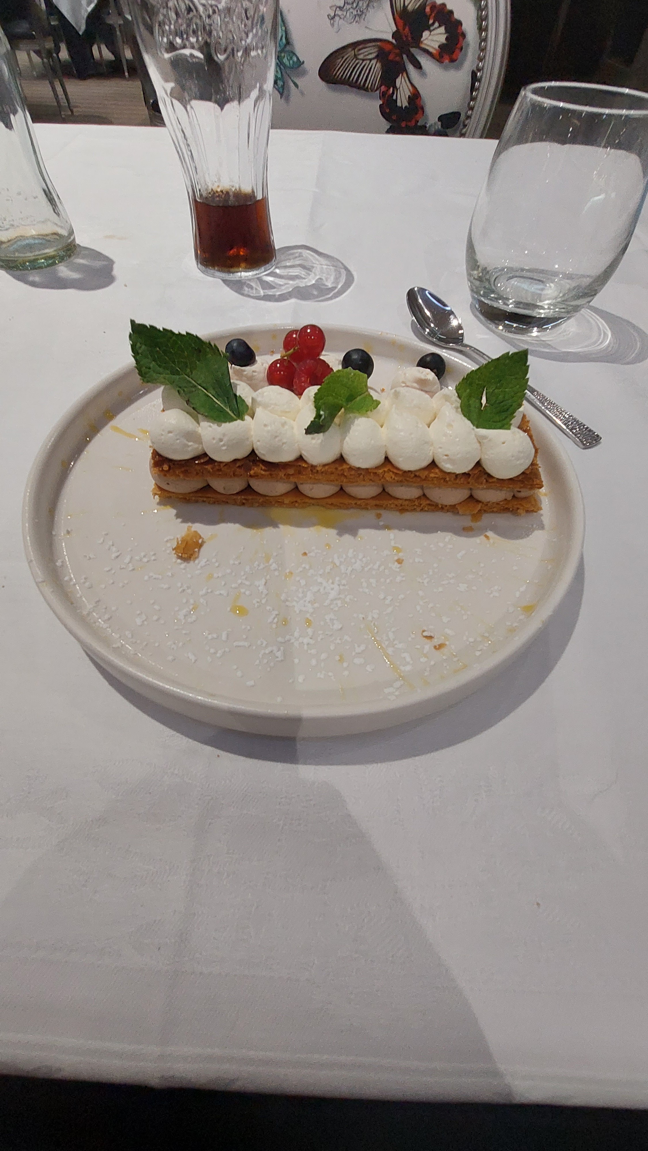 Merci à Sandrine, super moment convivial, très bonne cuisine, service de qualité...le top ! Petit clin d'oeil pour la revisite du mille feuilles 👍 Signé Mark Zuckerberg 🤣