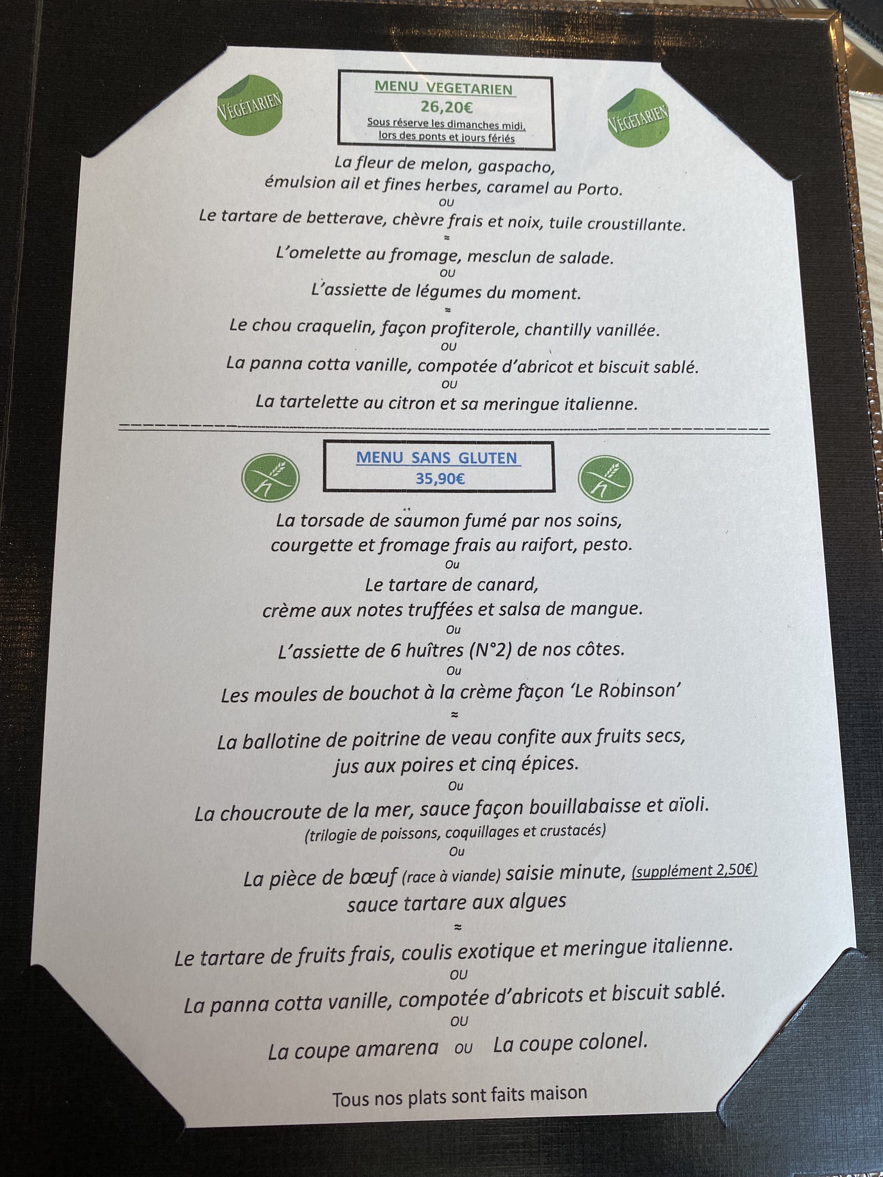 Cela fait 3 fois que nous allons manger avec des amis. Repas au top! Félicitations aux cuisiniers, nous n'avons jamais été déçus, personnel très agréable. Nous recommandons vivement ce restaurant.Changement de menu régulièrement afin que nous puissions avoir des produits frais dans notre assiette...