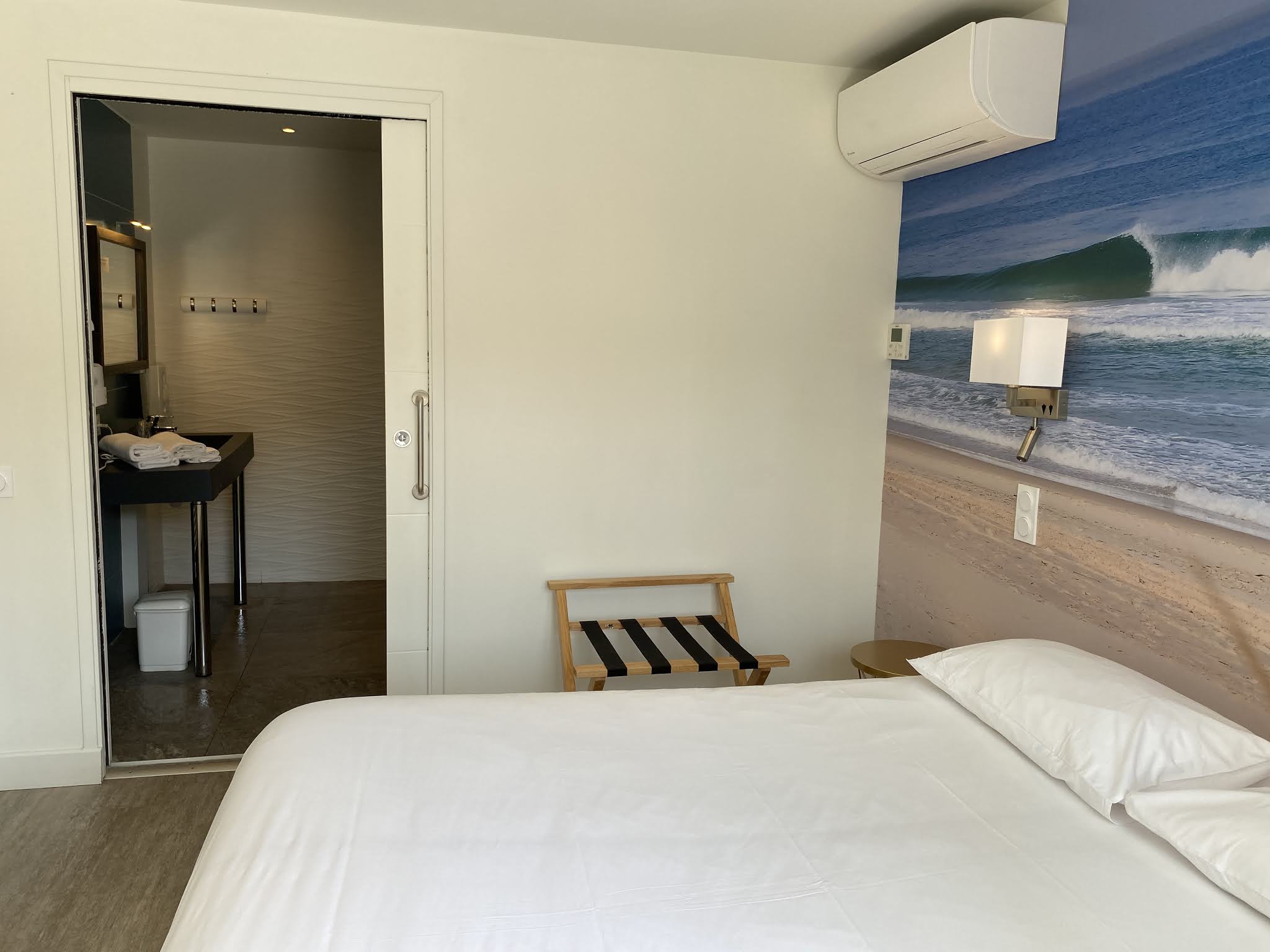 Nous avons été déçu car la chambre très petite. Nous avions réservé une chambre fenêtre 2 adultes, grand lit, douche. On nous a donné une chambre porte donnant sur terrasse au RDC, partant d'une bonne intention. Aucune place pour ouvrir nos valises, donc obligation de les poser sur le lit. Pas de possibilité d'ouvrir la fenêtre car nous avions une porte au rez de chaussé. Ne pouvant pas dormir avec la clim toute la nuit, nous avons eu très chaud toute la nuit. Salle de bain, très grande et aucune protection pour la douche, donc de l'eau partout. La literie, matelas très mou et creusé. Très bon accueil de la part de la réceptionniste. Un grand merci. petit déjeuner parfait. Dommage car l’hôtel est très bien situé. Très calme et très agréable sous les pins. Possibilité d'aller à la plage à pied.
