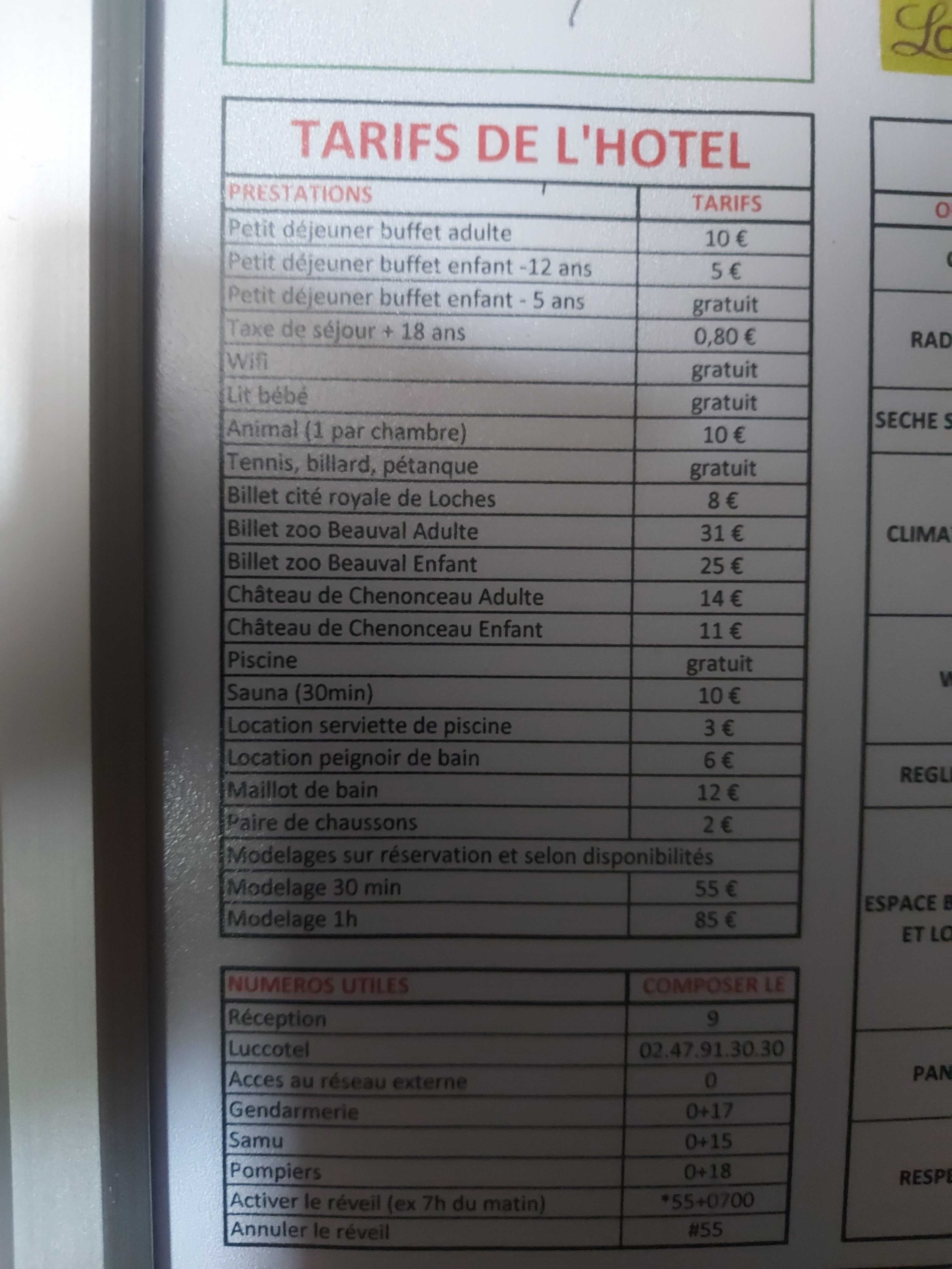 Les + : emplacement idéal pour découvrir le centre de Loches, parc arboré avec magnifique vue sur Loches, l'accueil, parking et la piscine. Les - : pas de volets aux fenêtres (rideaux) donc dur de faire la grasse mat et couloir bruyant et raisonnant, donc réveil à partir de 7h (bon les clients qui font claquer leurs portes y sont aussi pour qq chose.)