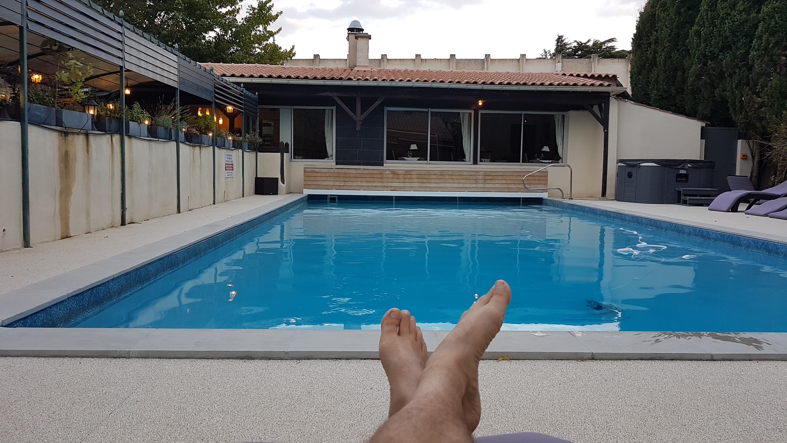 J’adore ce « concept à l’américaine » (du moins ce que j’en avais vu là-bas début des années 80) à savoir ma voiture garée (à l’ombre) tout près de la chambre, elle-même face à la piscine. Il y a une terrasse bien agréable devant notre chambre (17), avec un mini salon, et une mini salle à manger. Le petit déjeuner est royal, beaucoup de choix, sucré et salé, vous pressez votre orange vous-même, vous le savourez sous la tonnelle, près de la piscine. Le dîner est un véritable régal. Christophe, le Patron, est constamment aux petits soins pour ses clients, avec une gentillesse incroyable. Un temps de pause dans la piscine et le jacuzzi vient couronner le séjour.