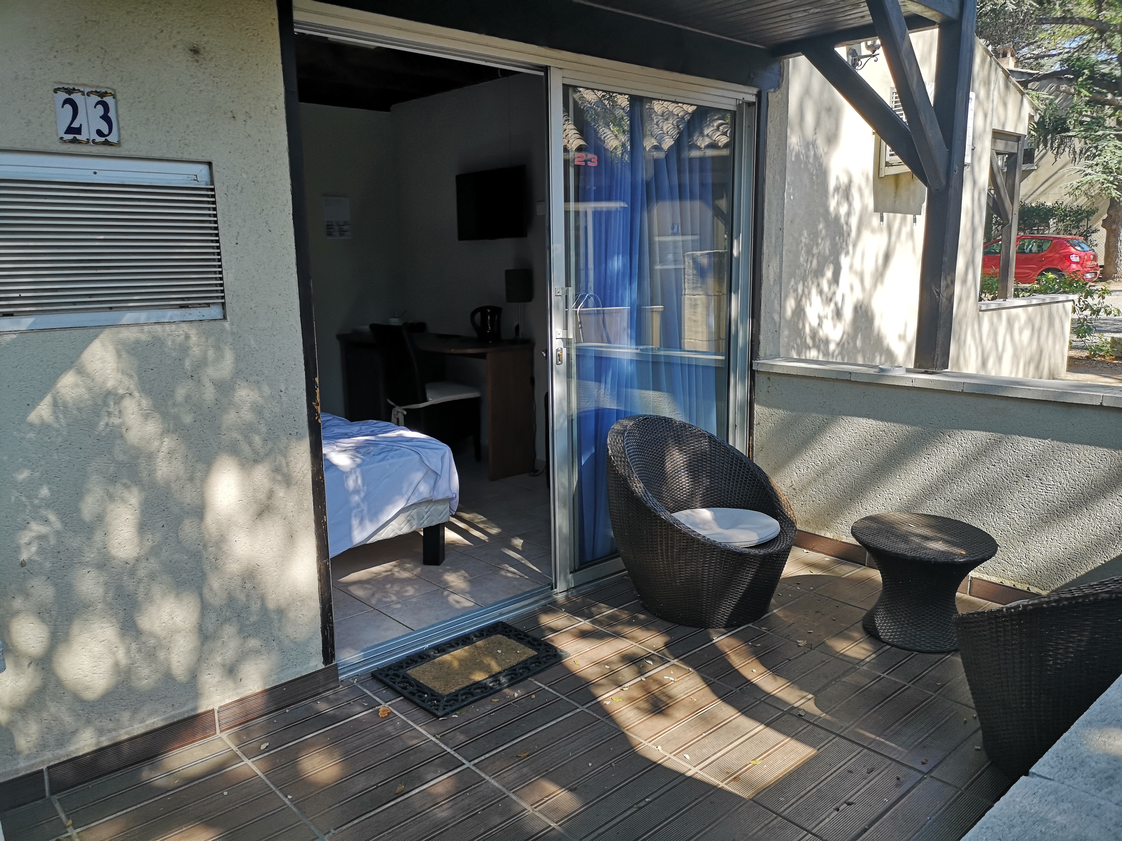 Très belle chambre dans son propre petit bungalow.. Très calme, petit déjeuner très bon et copieux selon les standards français.. Personnel sympa.. Le seul inconvénient est qu'il se trouve à environ trois kilomètres de la ville d'Avignon et que l'hôtel est sur une colline. . Mais c'est de la pure détente... Et il y a une piscine.