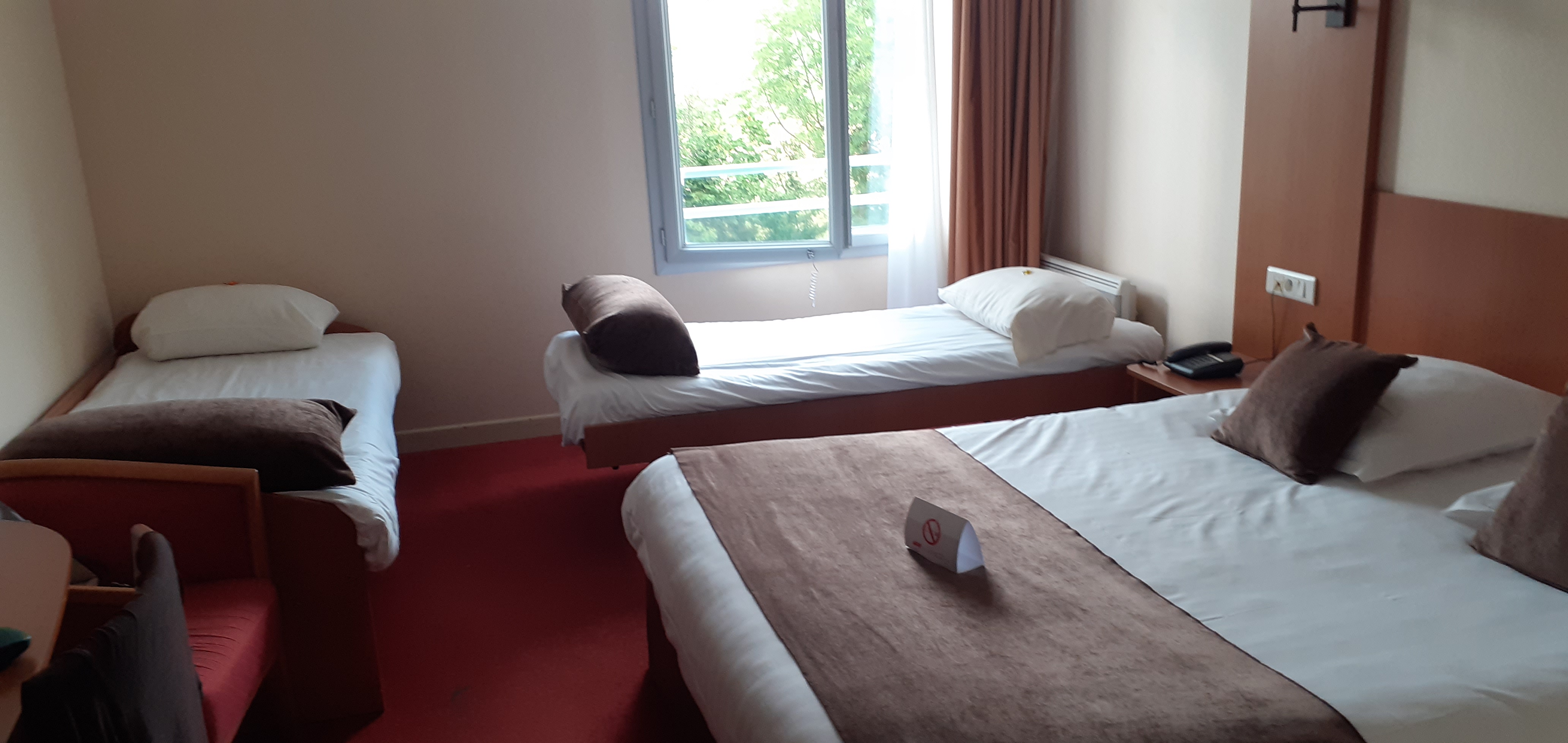Nous avons été agréablement surpris d avoir une chambre avec 4 lits alors que nous avions reservé pour une chambre triple. La chambre était propre, agréable et climatisée. Nous avons apprecié l arrivée en toute autonomie de nuit et la situation géographique de l hôtel par rapport au Puy du Fou. Nous gardons précieusement cette adreesse pour nos futurs séjours au Puy du fou