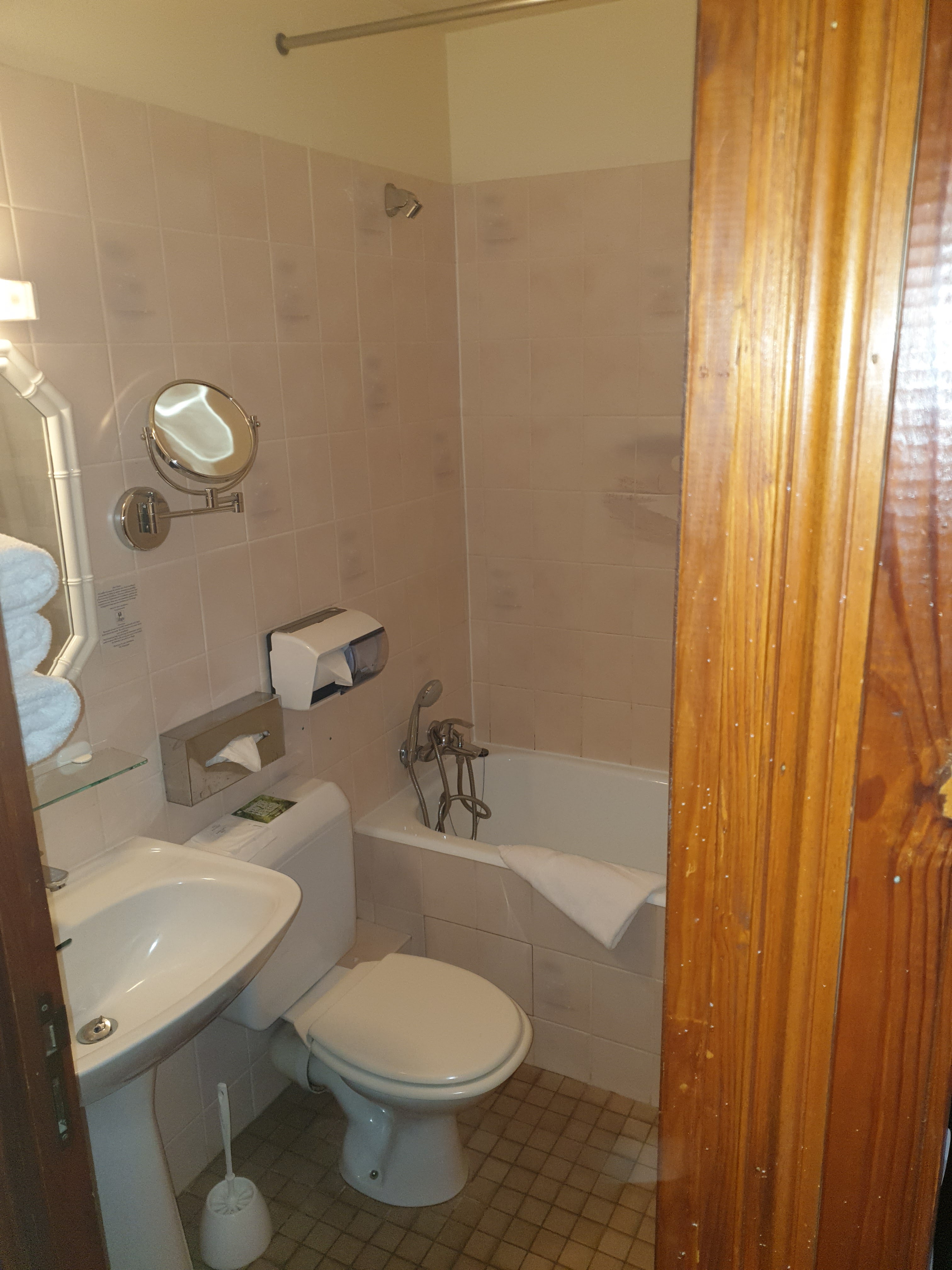 Hôtel sans charme, vieillot et qui aurait besoin d’une profonde rénovation . Nous étions logés dans une chambre minuscule dans une sous~pente sans ascenseur pour y accéder (escalier raide et étroit. Éviter les valises un peu lourdes) - Moquette tachée dans la chambre. - Lit ancien standard de 140 pour deux personnes (ceci dit, un lit plus large risquerait de ne pas entrer dans la chambre). - Literie peu confortable (matelas dur), oreillers plats et bosselés. - Pas de volets mais des rideaux qui laissent passer la lumière y compris par les trous et les déchirures de la doublure. - Salle de bain mouchoir de poche (on ne sait pas où accrocher sa serviette, on peut faire pipi tout en se brossant les dents et en prenant un bain de pieds dans la toute petite baignoire 😉). - Petit déjeuner : correct - Et le jour du départ on se garde bien de nous demander comment s’est passé le séjour….. Conclusion : nous regrettons cette étape (château mis à part bien sûr). Rapport qualité prix très défavorable.
