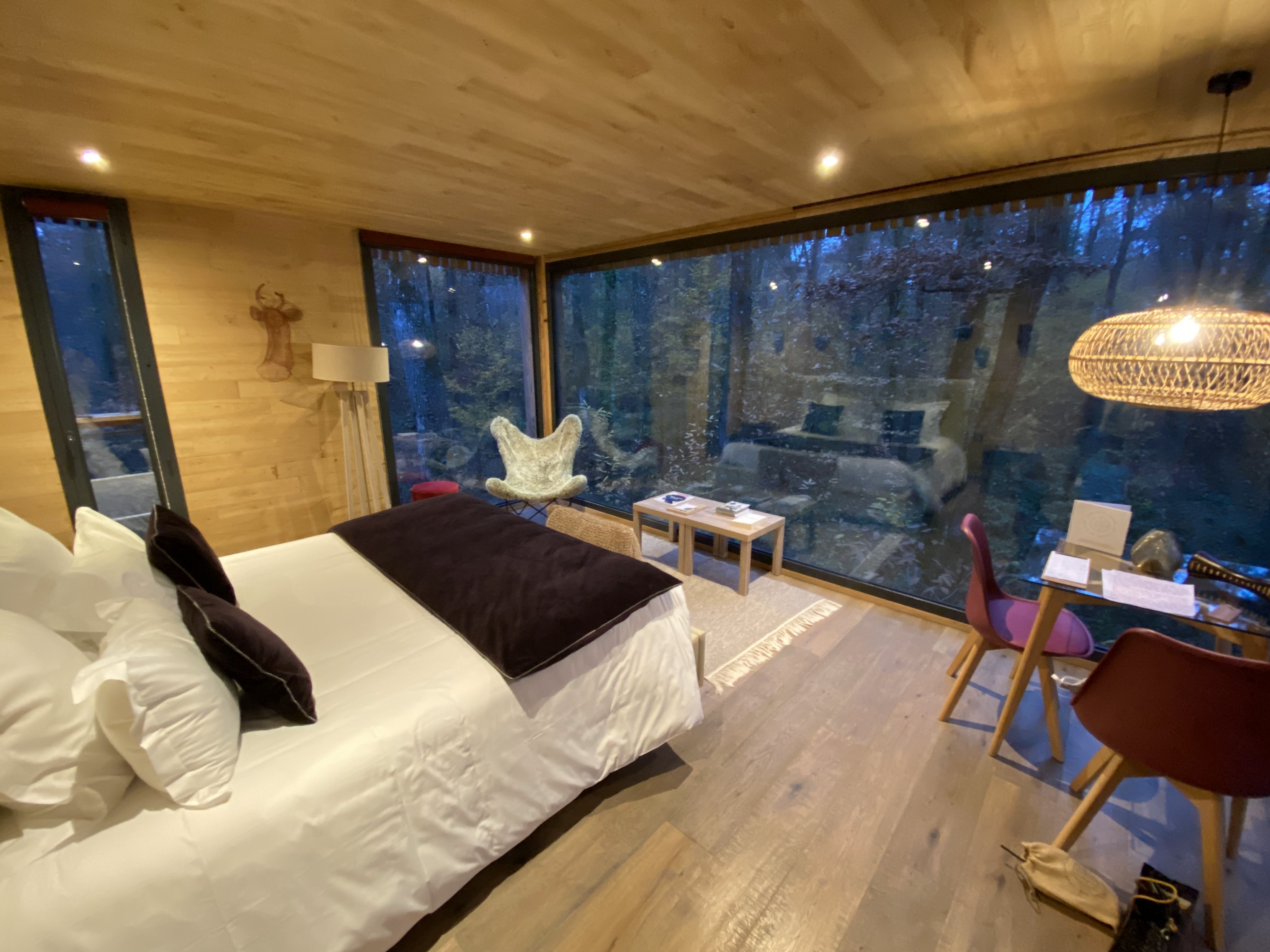 Malgré le temps variable fin octobre, l'expérience fut pleinement immersive et l'accueil et le confort au rendez-vous.Et surtout, quel bonheur que de réveiller le matin avec le spectacle de la forêt apparaissant sur la grande baie vitrée placée en face du lit.Du grand spectacle en 4D garanti !