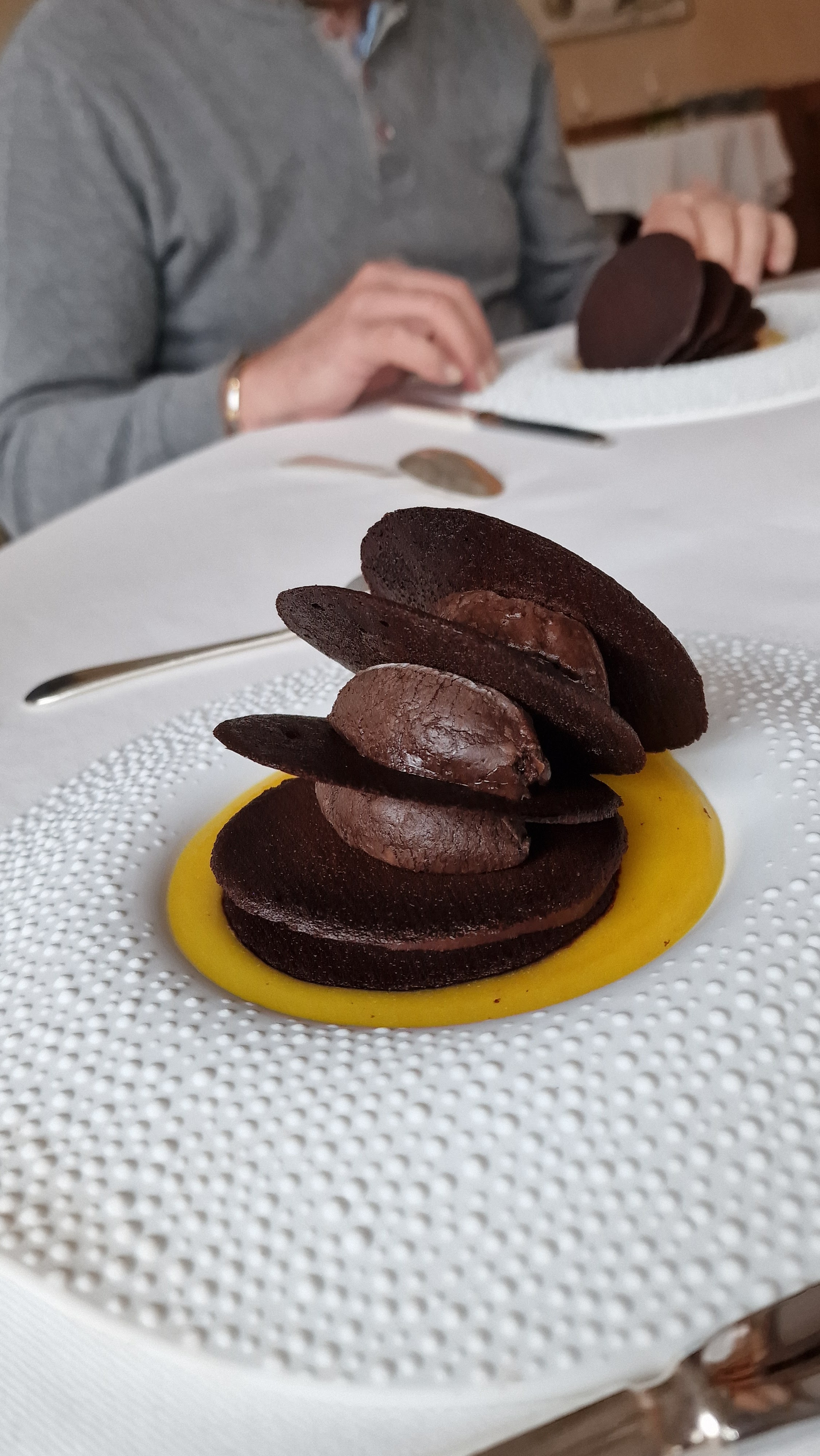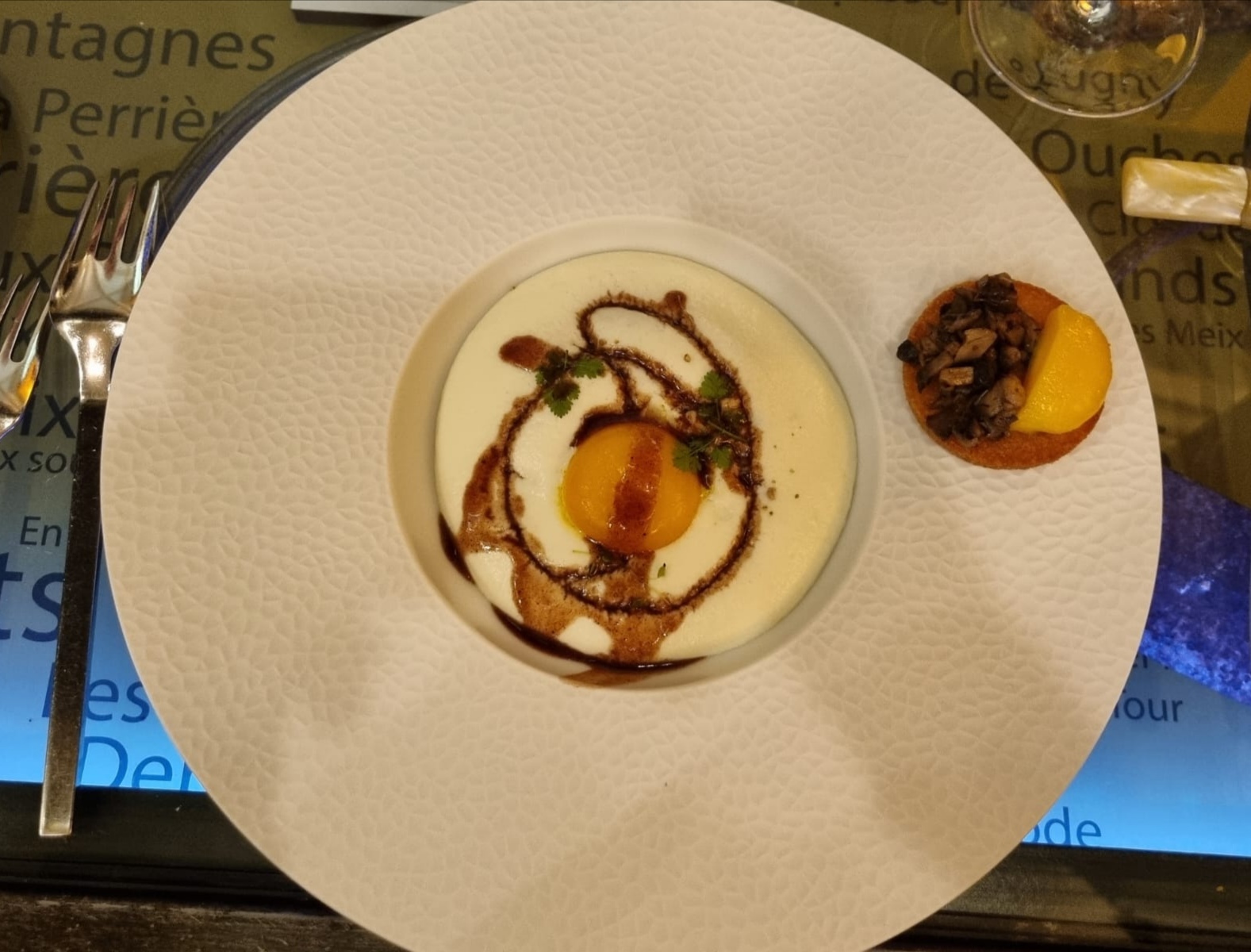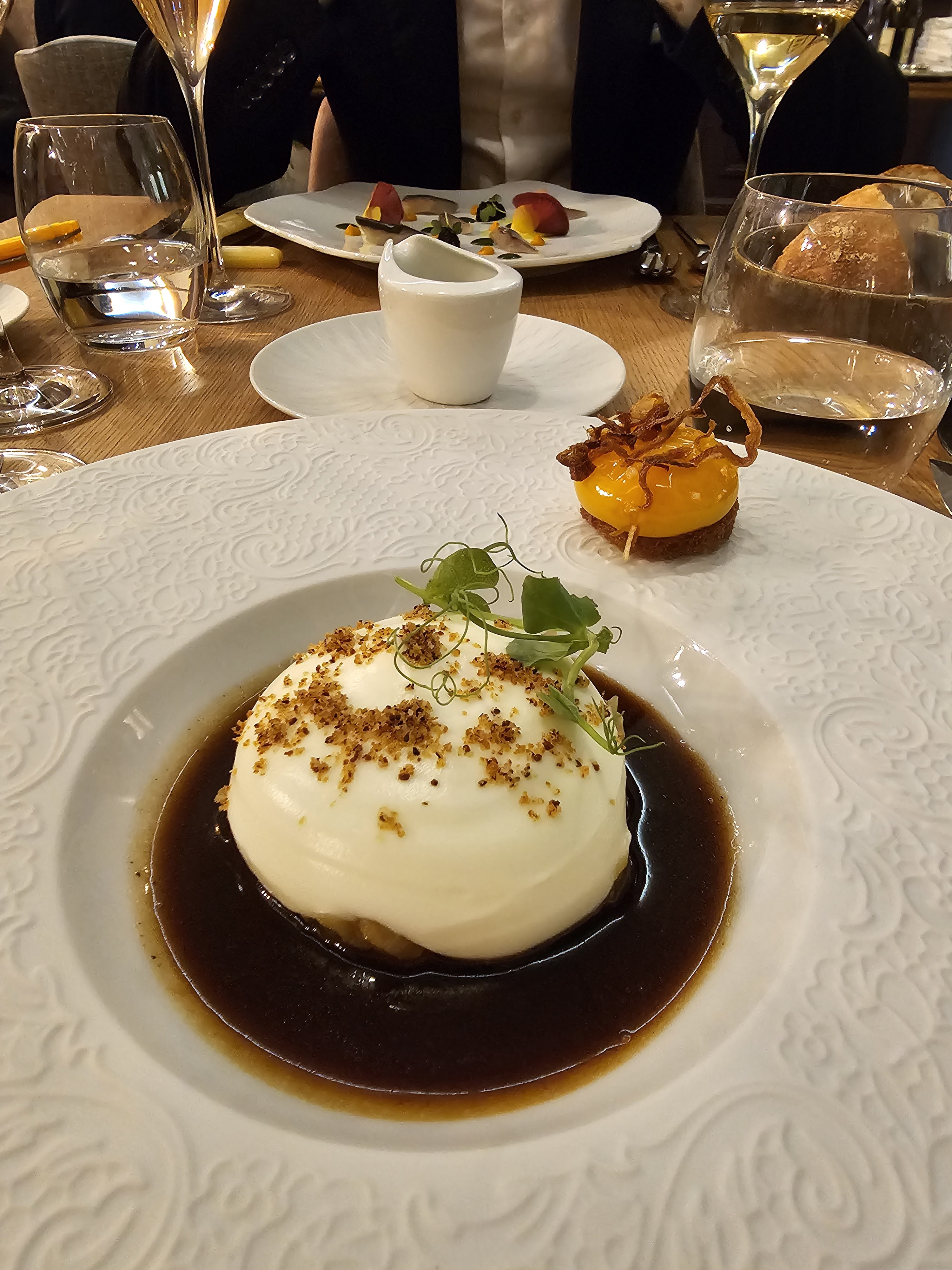 La réduction accompagnant les œufs très salés, le veau beaucoup trop cuit, pas de fourchette pour manger la viande, le verre de Chassagne du Dne de la Vougeraie 2020 avec une oxydation prématurée et surtout vraiment très dérangeant le responsable et le sommelier qui n’ont pas arrêtés de discuter avec la table derrière nous et pendant la quasi-totalité du dîner. Le dîner avançant la dame parlait de plus en plus fort et vous finissez par n’entendre que la conversation. Au tarif du dîner cela est loin de correspondre à ce que l’on attend d’un étoilé digne de ce nom.