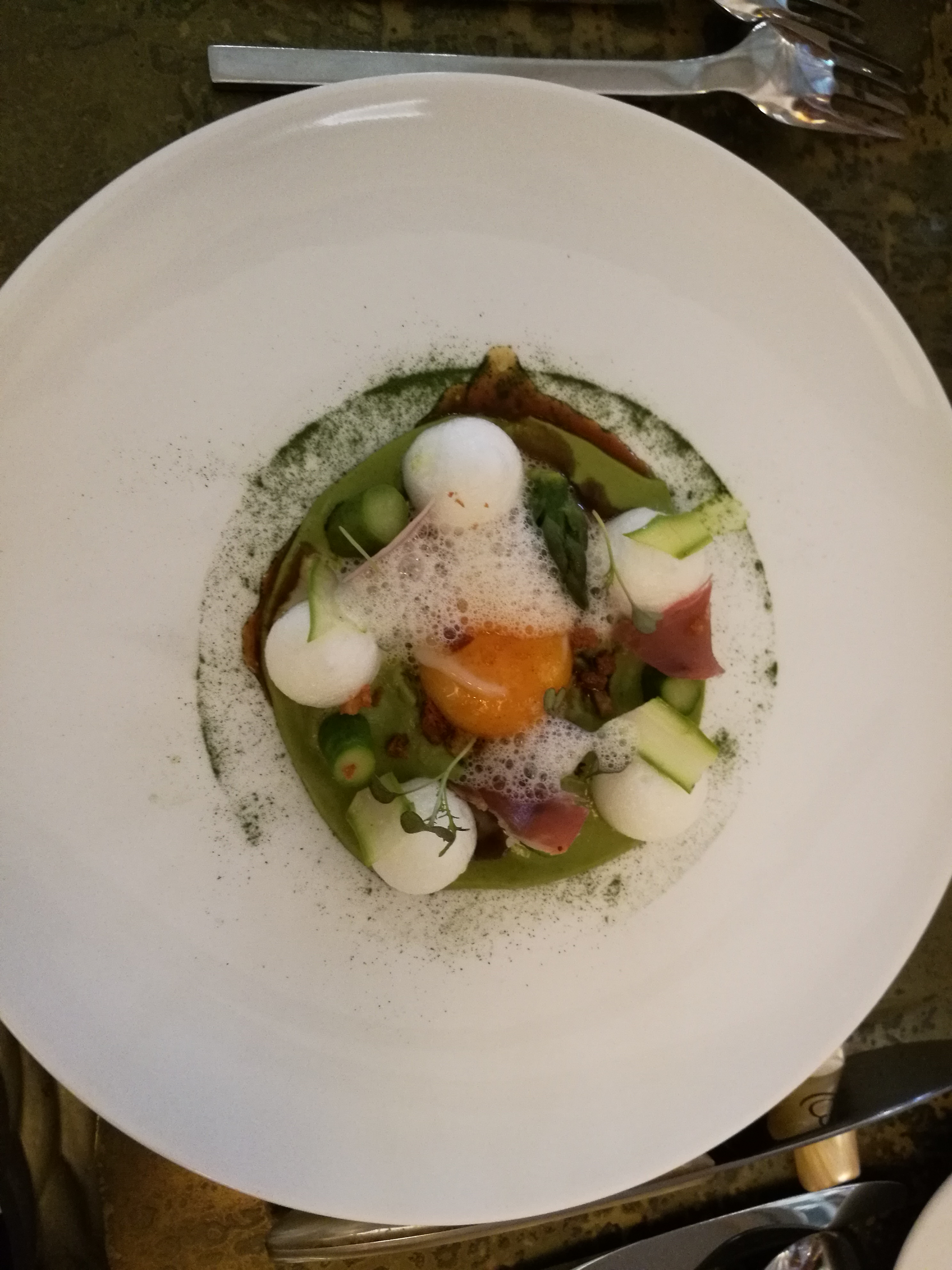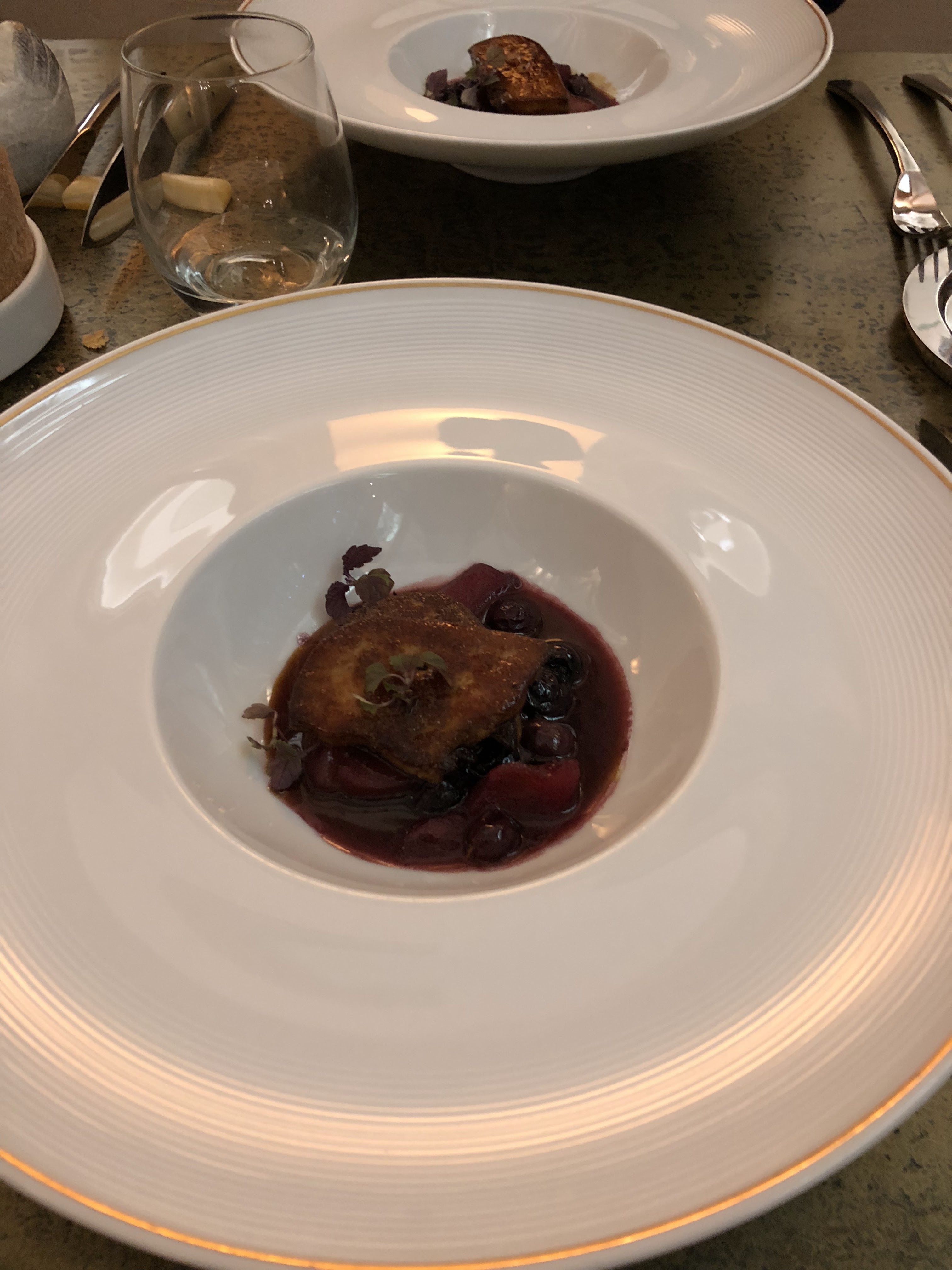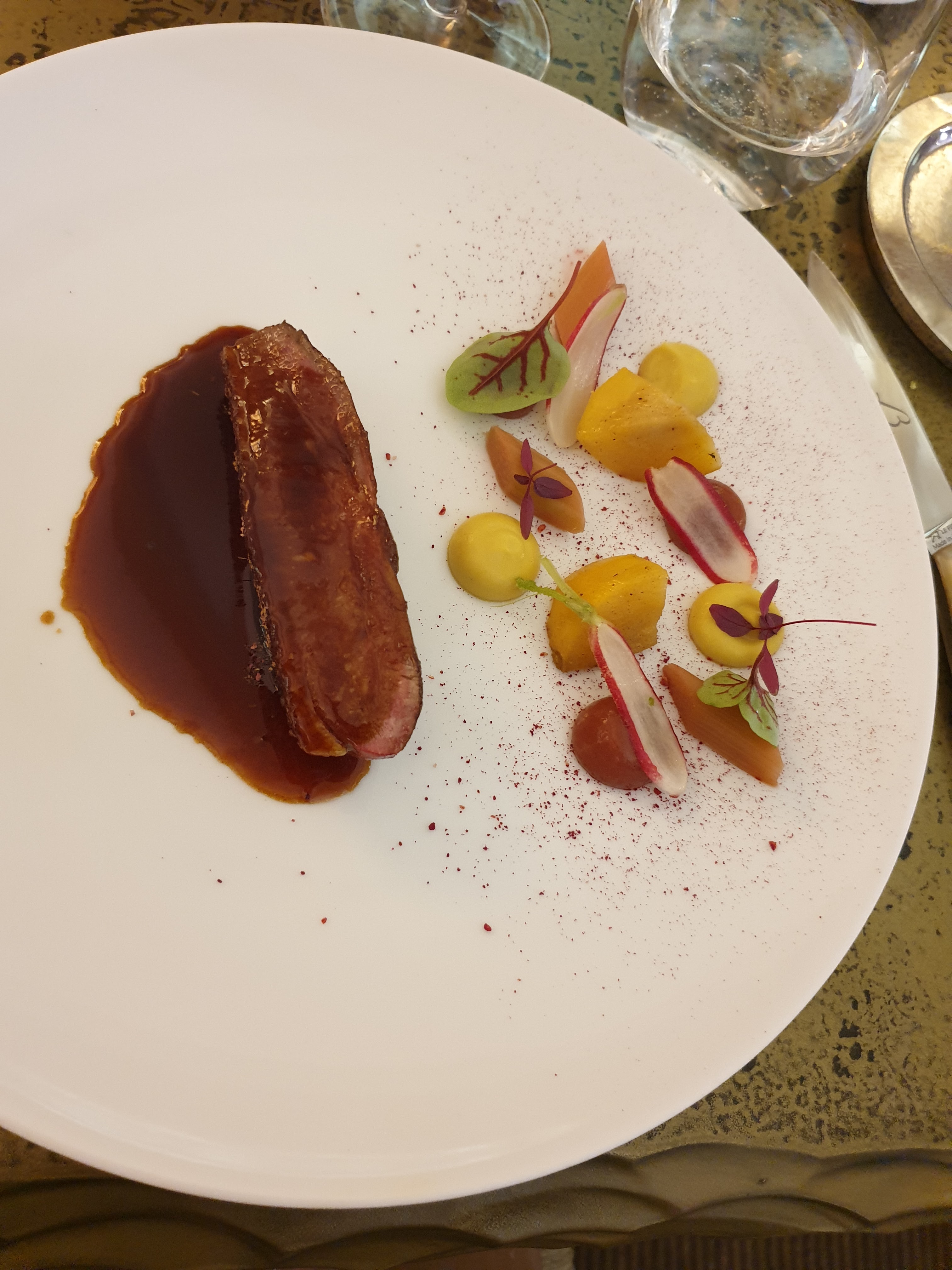 Expérience mitigée à Loiseau des Ducs. Nous ne voulions pas de fromages et le serveur ne nous a pas proposé le service en 3 fois mais uniquement le service en 4 fois, en remplaçant les fromages par une boule de sorbet coco. Décevant de manger du sorbet dans un restaurant étoilé. L'amuse bouche était simple et comportait une crème de burrata, de petits pois et de jambon séché. L'entrée était bonne mais les herbes l'emportaient sur le goût du poisson. La lotte et le veau étaient malheureusement trop cuits. Le dessert au chocolat était excellent, bravo au Chef Pâtissier. Cependant le dessert aux fraises était congelé par endroits. Les mignardises étaient bonnes. Le service était bon.
