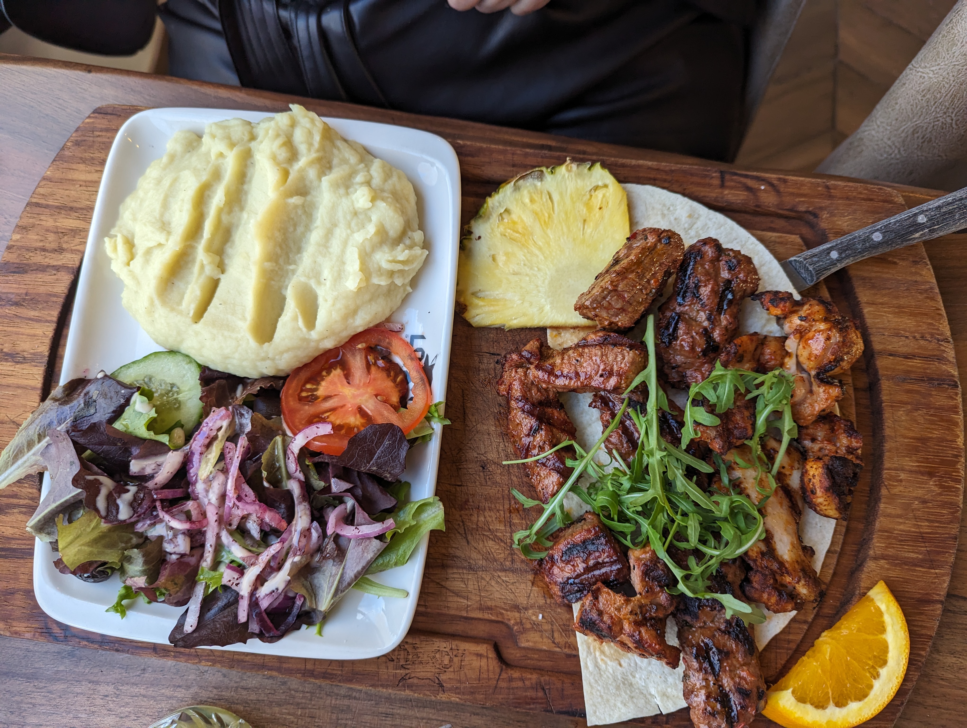 Beau restaurant mais sans plus. Je m attendais à plus de saveurs. Brochettes au poulet encore rosé a l intérieur mais grillée à l extérieur pas top, le boulgour trop sec.