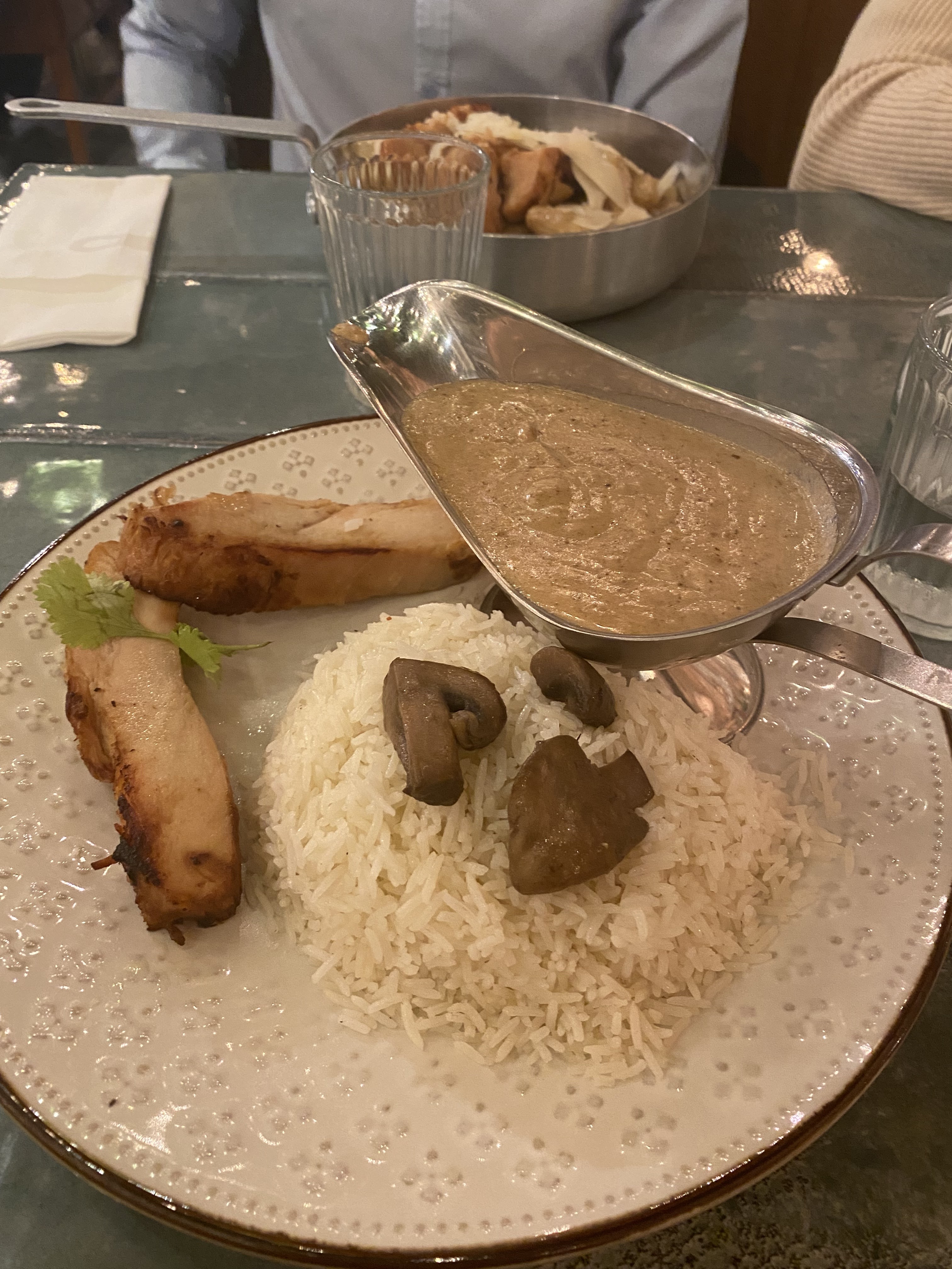 Ce restaurant semble faire partie d'un groupe d'entreprises plus vaste, et ça se voit. J'ai eu le poulet à la forestière (coup de cœur de l'équipe), et c'était le riz blanc avec du poulet et quelques champignons le plus simple que l'on puisse imaginer. Je pourrais le faire à la maison en 10 minutes. Ma femme a pris les raviolis aux champignons et en a mangé environ un tiers. Le service était médiocre et pas particulièrement sympathique. Cela dit, le quartier est vraiment amusant ici. Je recommande donc totalement de venir dans ce quartier, mais de trouver un autre endroit pour manger. This restaurant seems to be part of a larger group of businesses, and it shows. I had the poulet à la forestière (the “staff favorite”), and it was the simplest white rice with chicken and some mushrooms you could imagine. I could do this at home in 10 minutes. My wife had the mushroom ravioli and ate about a third of it. The service was only so-so and not particularly friendly. That said, the neighborhood is really fun here. So I totally recommend coming to this area, but finding somewhere else to eat.