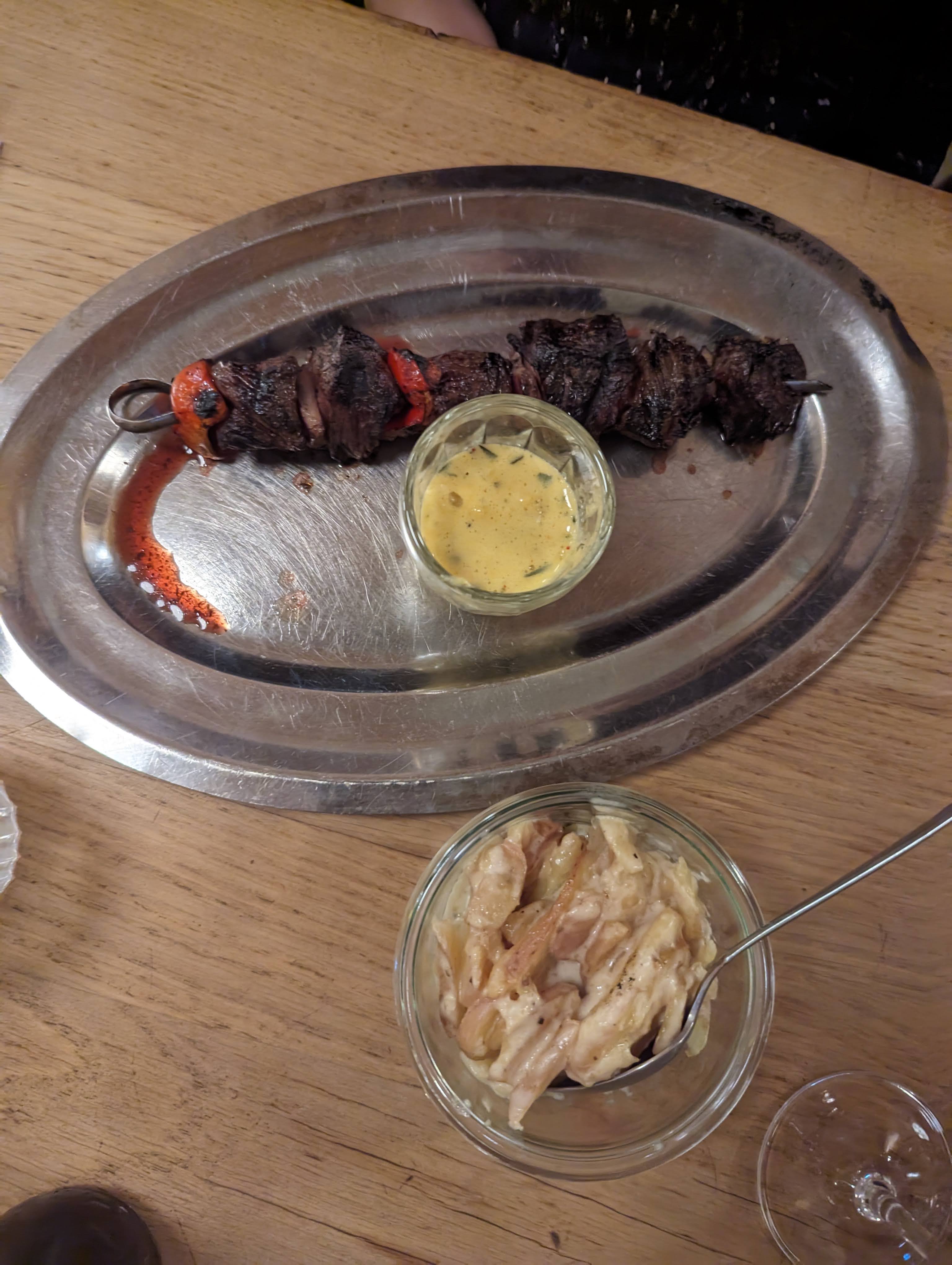 Cadre sympa, accueil cordial sans être non plus des plus chaleureux mais on ne vient pas pour avoir des câlins Carte simple mais efficace Testé la brochette : le premier morceau de viande était assez ferme et m'a un peu déçu, le reste de la brochette était assez tendre. Les pommes frites maison sont très bonnes. La sauce chimichuri bonne mais pas révolutionnaire. En dessert une brioche très bonne. Un petit côte du Rhône pour accompagner le tout. Très bon repas mais au final un peu cher sur le rapport qualité/prix. La quantité est au RDV (bien sans être gargantuesque)