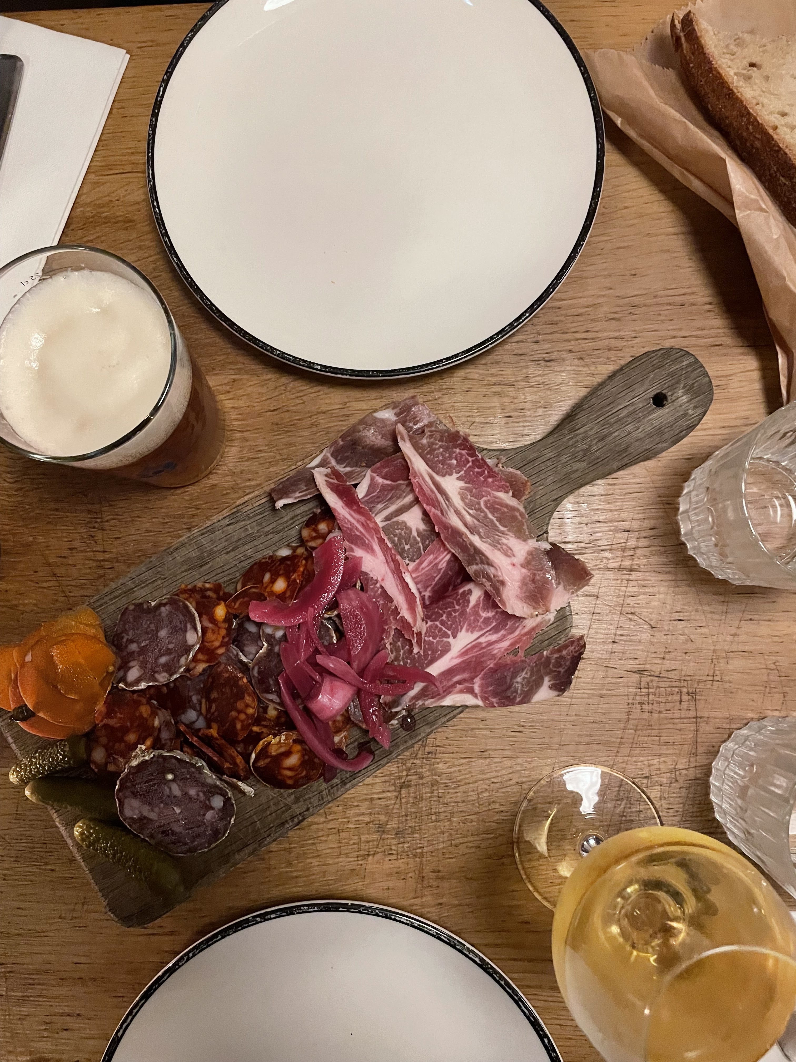 Nous sommes venus à 3 pour déjeuner à 21h30, seulement 2 tables remplies dans le restaurant alors que les horaires précédents celui ci étaient complets.. En arrivant, je suis obligée de rentrer jusqu'au fond du restaurant car la serveuse ne m'a pas vu (sur son téléphone, (qu'elle gardera à l'oreille une grande partie de la soirée)).. La serveuse a le tutoiement facile (ce qui ne nous dérange absolument pas habituellement, mais là, on sent que c'est simplement de la nonchalance). Ni elle, ni le cuisinier ne connaissait le poids de la viande, ni son prix (69€ pour une entrecôte..) L'assiette de charcuterie à partager était bonne (malgré des crudités qui jutaient et donnaient donc un goût de carottes au chorizo). Les viandes étaient parfaitement cuites et les frites un délice ! Les brioches perdues ne valent pas spécialement le détour.. Dans l'ensemble, le restaurant à un cadre magnifique, une viande cuite comme il se doit mais le service/accueil est déplorable, et bien que ça ne soit pas le critère principal (d'où mes 3 étoiles), il contribue grandement au moment passé en restaurant...