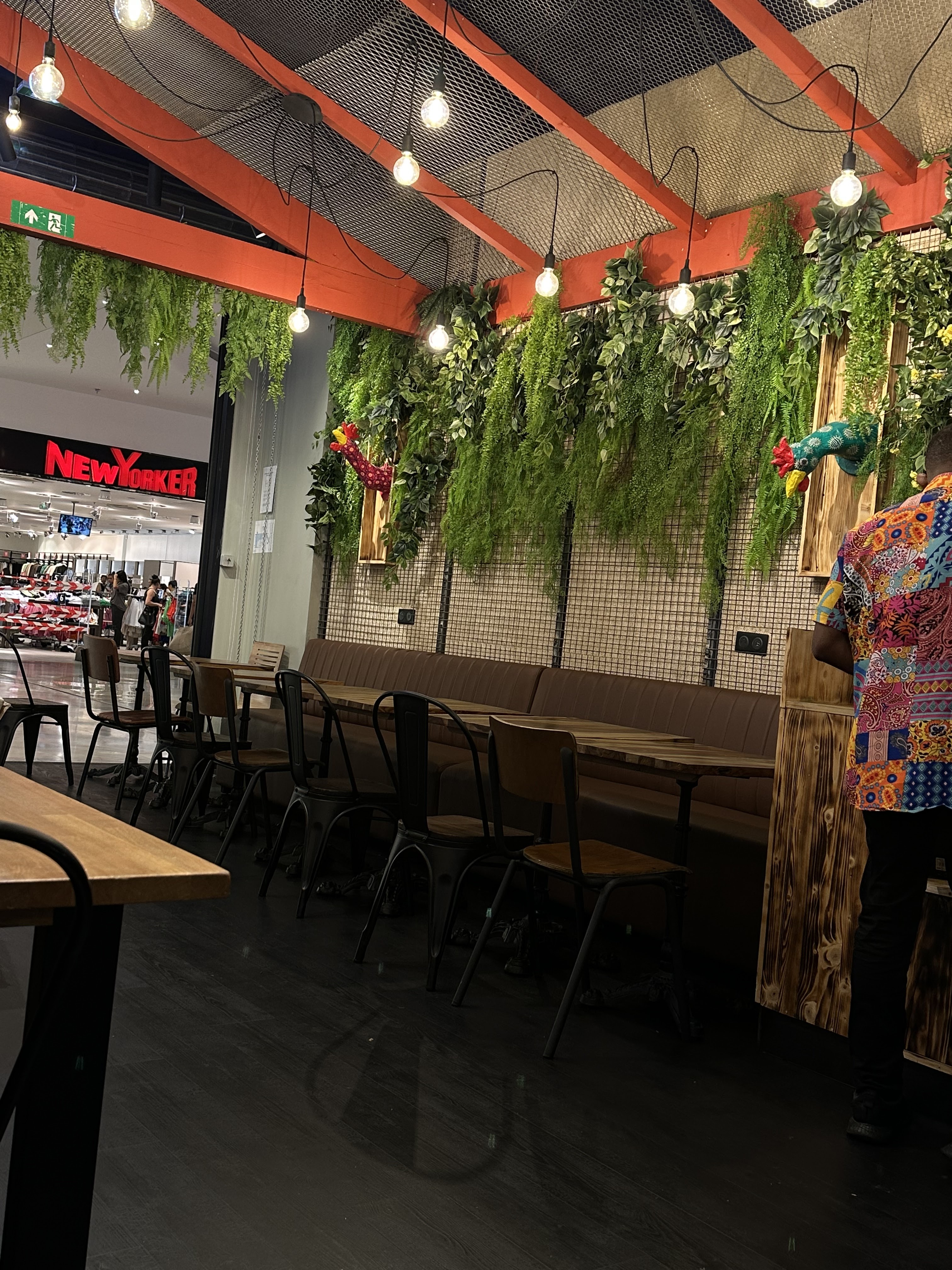 Le resto est situé au rdc côté Primark, le poulet entier, les haricots verts et les bananes allocos étaient excellents !! Très jolie décoration à l’intérieur, super service également. Je recommande !