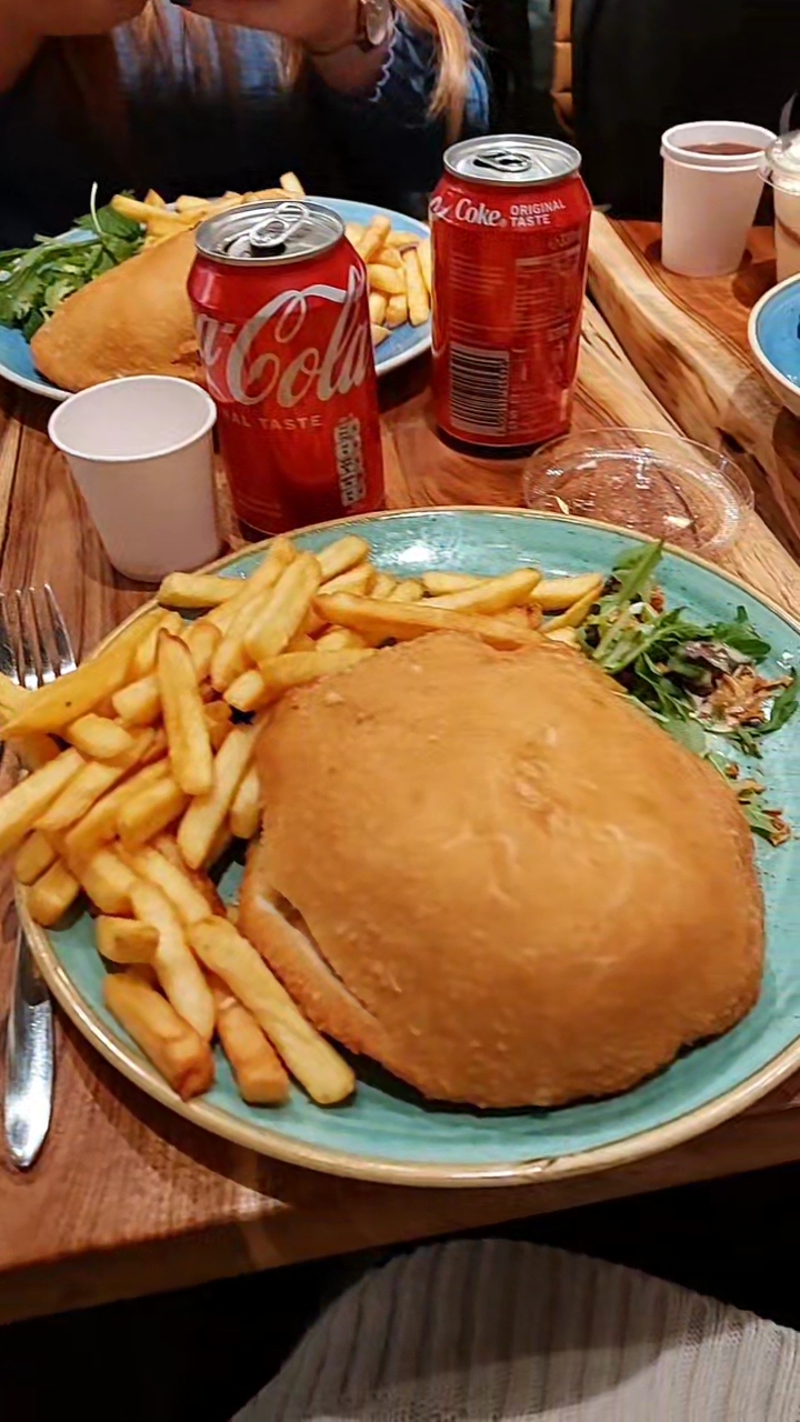 Enchilladas avec frites excellentes et bien salée et burger poulet crispy avec frite de patate douce excellente également. Personnellement au top !