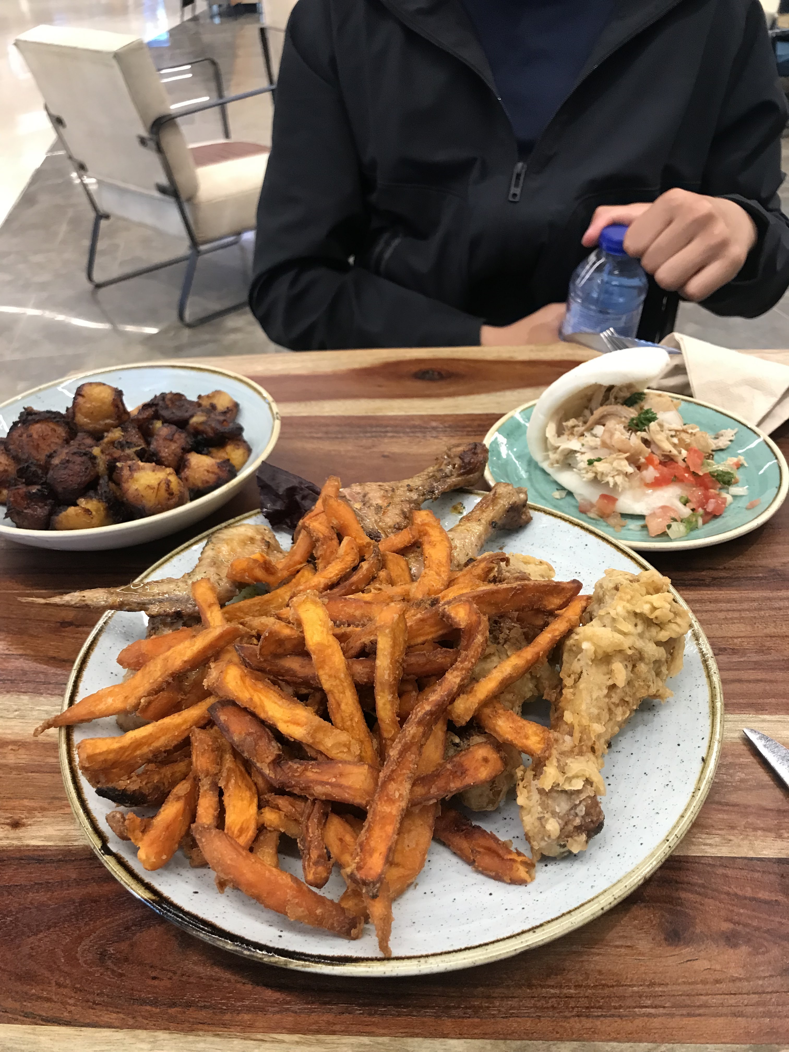 Une bonne découverte. La salle est agréable et les tables ne sont pas les unes sur les autres contrairement à d'autres restaurants du food court. Musique diffusée mais pas de ressenti bruyant. Côte salle, le personnel s active et le nettoyage est fait en permanence. Mention spéciale à Mikael, très sympa 😉 Un coin pour les enfants et des WC à disposition L accueil est sympa. Côte food. Ça tourne autour du poulet. Mais du choix :entier ou en morceaux, brochettes, burger, poke et même enchilladas. Egalement du poulet pané. J ai craqué pour ce dernier choix. Et une bonne surprise. Le morceau de viande est généreux. Semble frit mais ne ressort pas comme gras. J ai fait dans le basique en accompagnement avec des frites mais je me laisserai tenter la prochaine fois par les frites de patate douce ou les plantains. Pour les frites un petit conseil : faites des frites maisons et votre plat aura 5* Le menu avec accompagnement et boisson est à 12.90€, très abordable