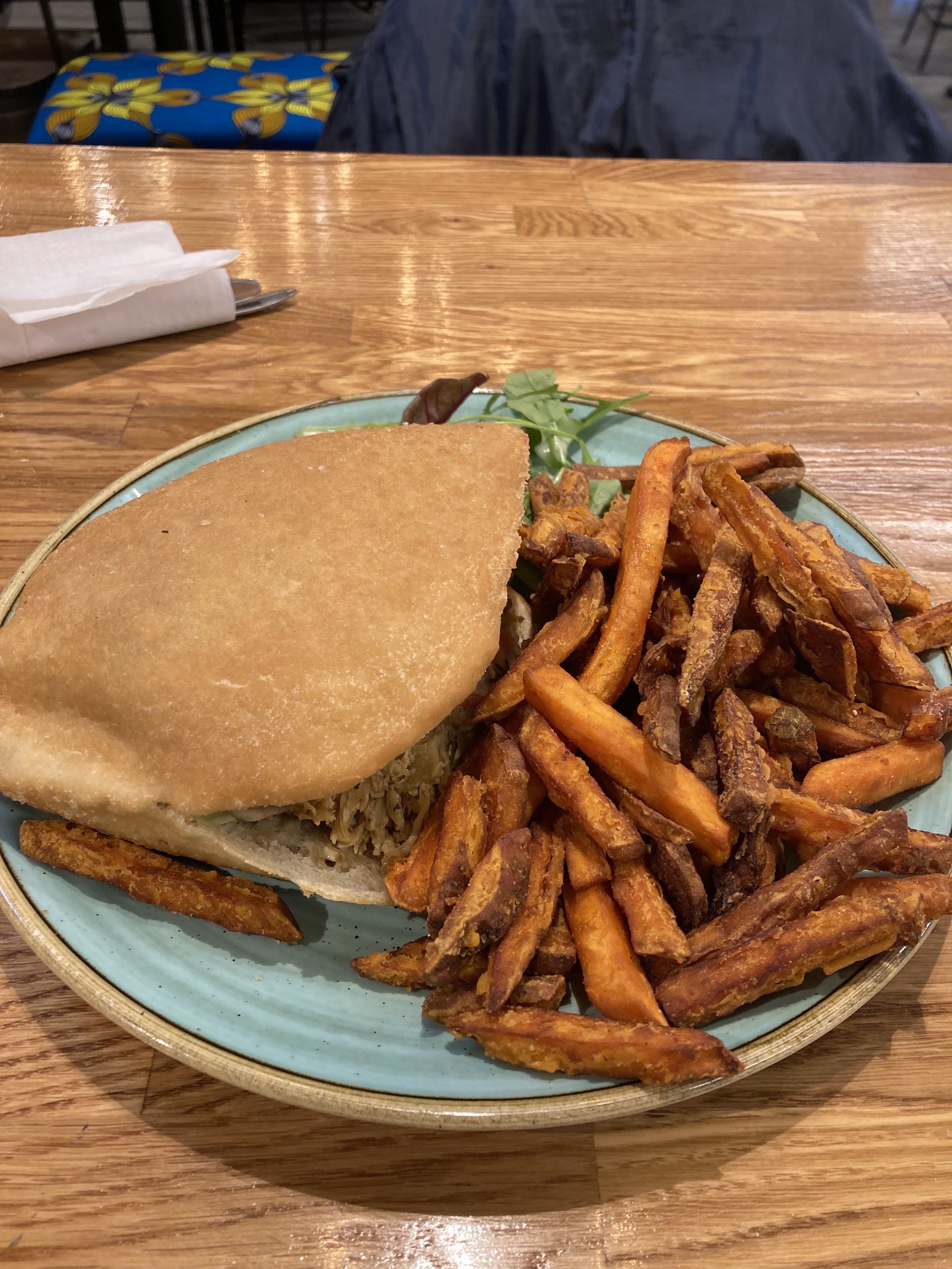 Mohamed et son équipe nous ont merveilleusement accueillis et renseignés. La cuisine est une tuerie. Le burger au poulet braisé est à se damner, l'enchilada l'est tout autant. L'accompagnement est tout simplement sublime, que ce soit les frites de patates douces ou les bananes frites. Impossible de tout terminer, mais ce n'est pas grave car on vous propose immédiatement d'emporter ce qui reste. Je ne parle pas des desserts maison qui sont tout simplement délicieux. Tout est frais et de grande qualité. On va être obligé de revenir goûter le reste. Je recommande vivement ce restaurant, c'est atypique et délicieux. Philou