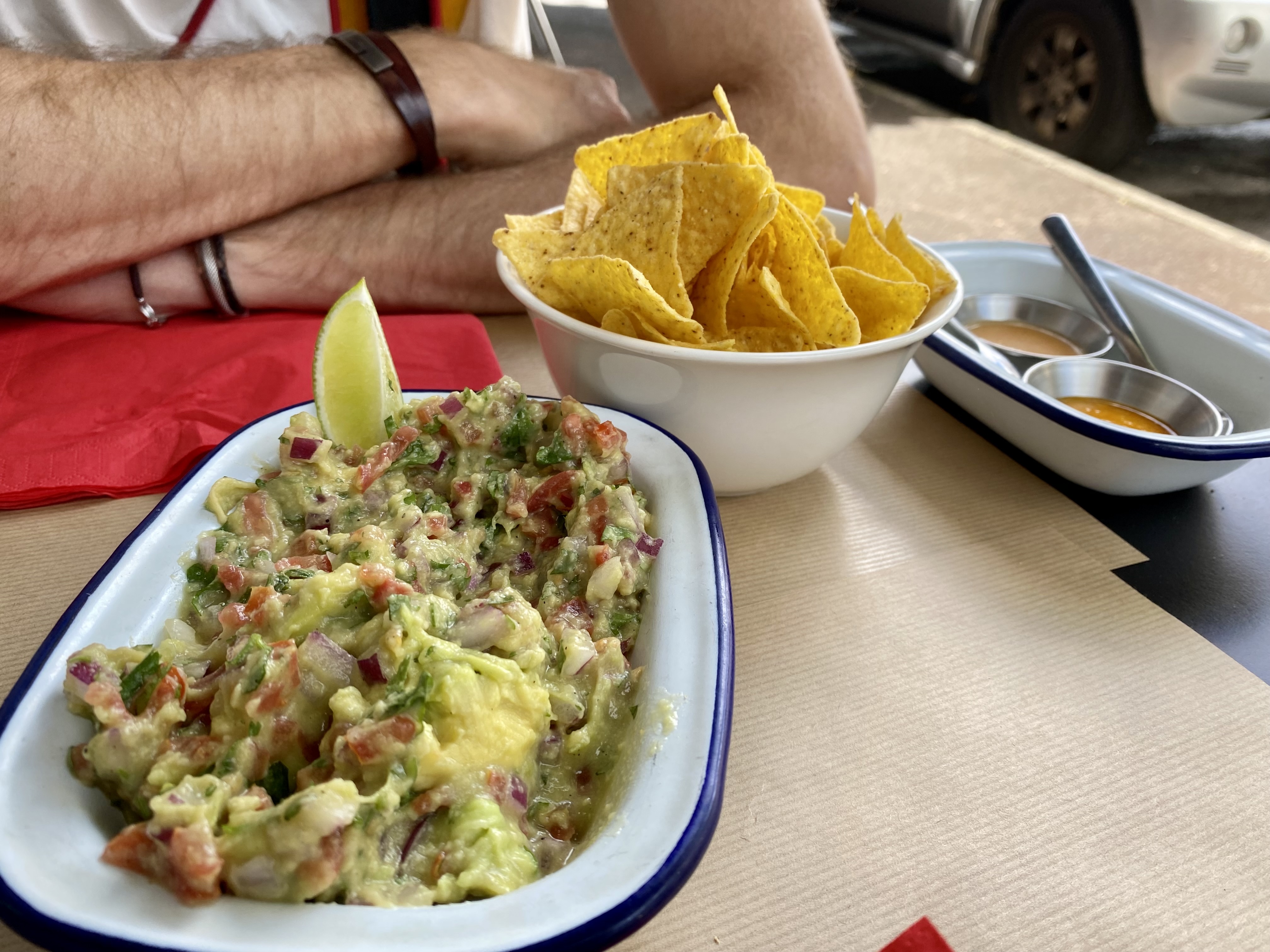 Je pense que nous avons dû venir ici lors d'une mauvaise nuit. Les tacos étaient très moyens, les margaritas surgelées avaient le goût de la limonade et n'étaient pas congelées, et il semblait que tout le monde autour de nous renvoyait également sa nourriture. Je ne sais pas comment il a reçu d'aussi bonnes critiques auparavant, mais je suppose que nous n'avons tout simplement pas eu de chance ! Voici une photo du « guacamole » qui n’était en réalité constitué que de trois morceaux d’avocat.