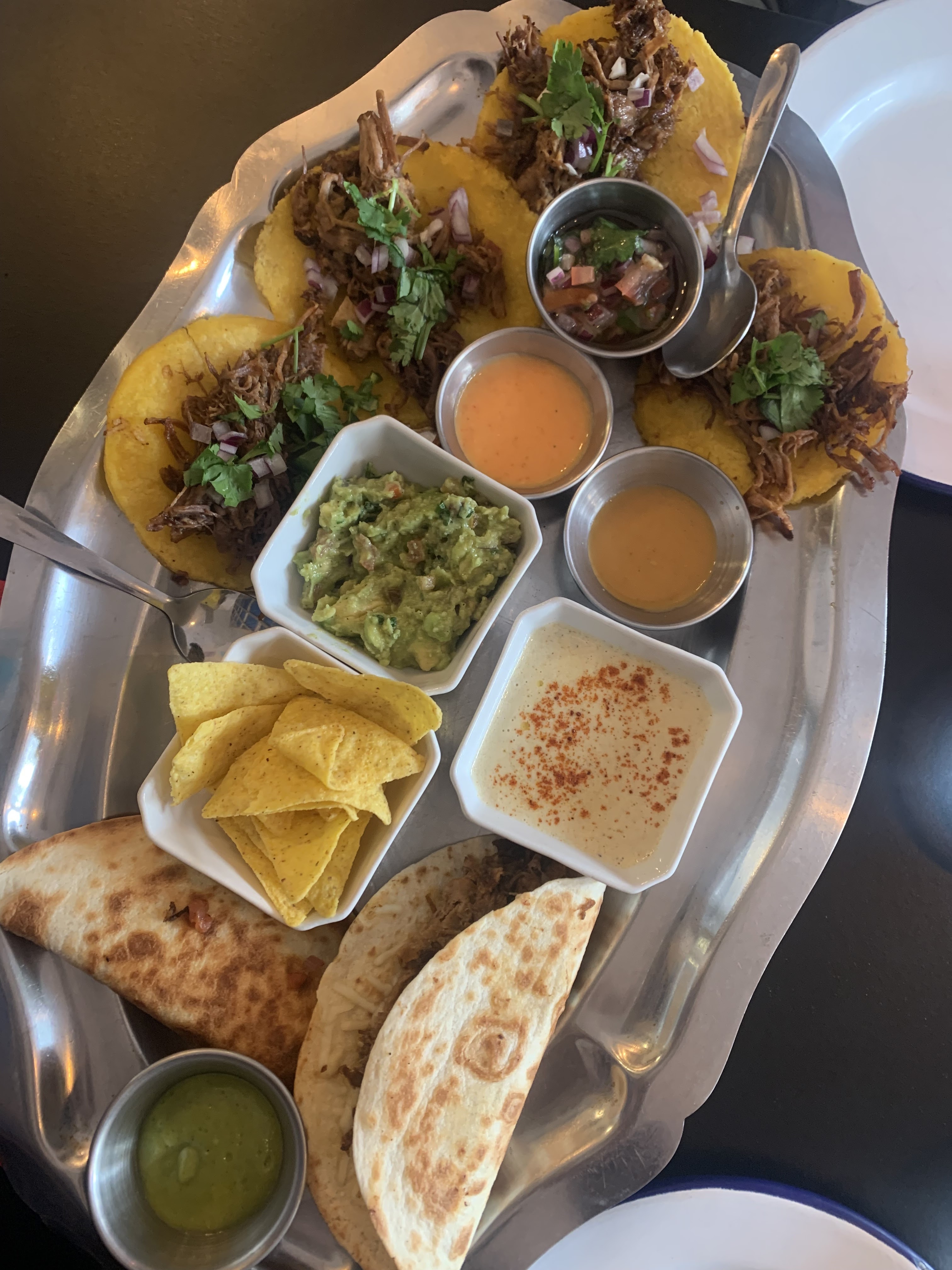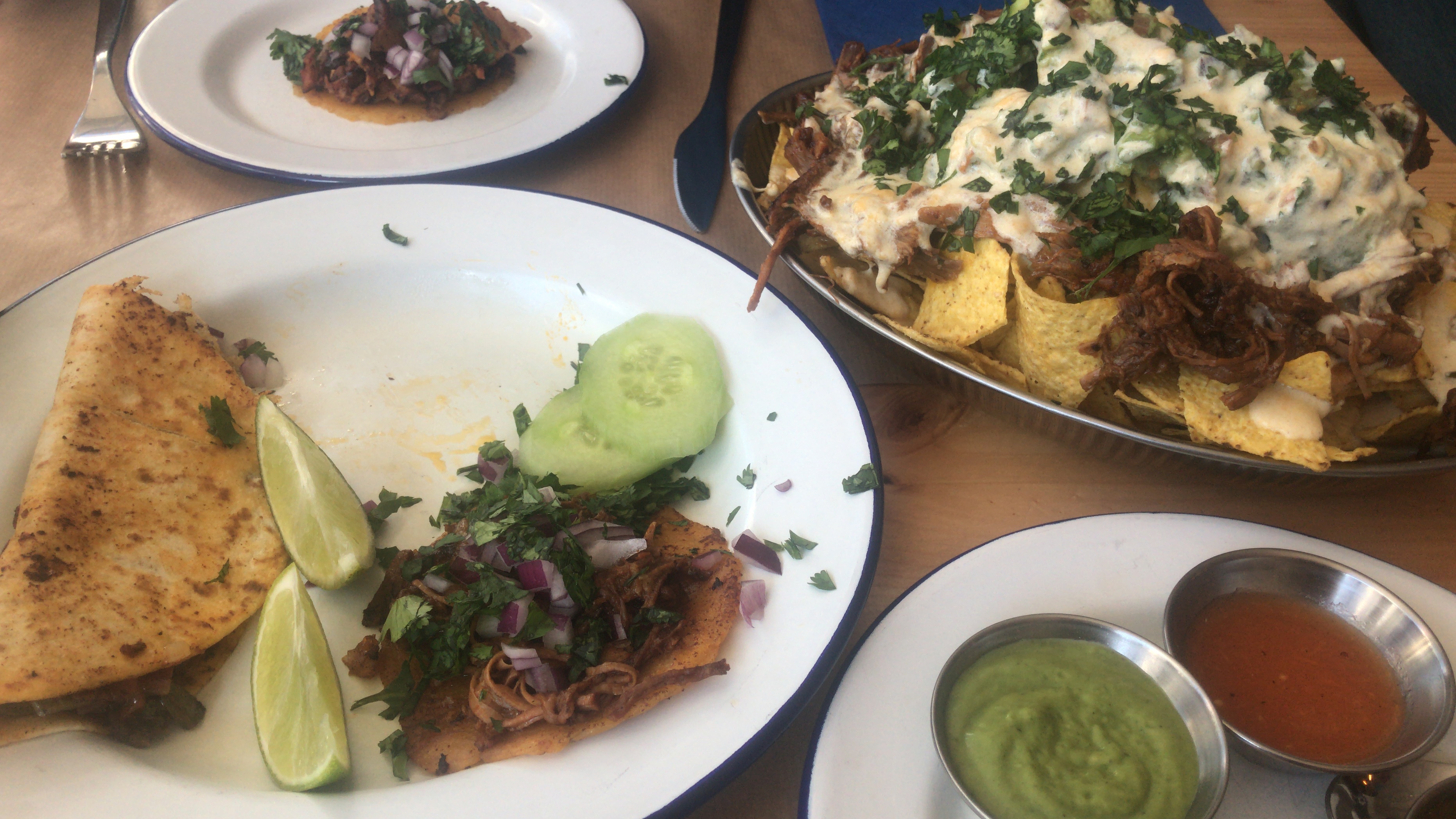 Todo muy bueno//tout est très très bon, tacos, quesadillas y nachos.