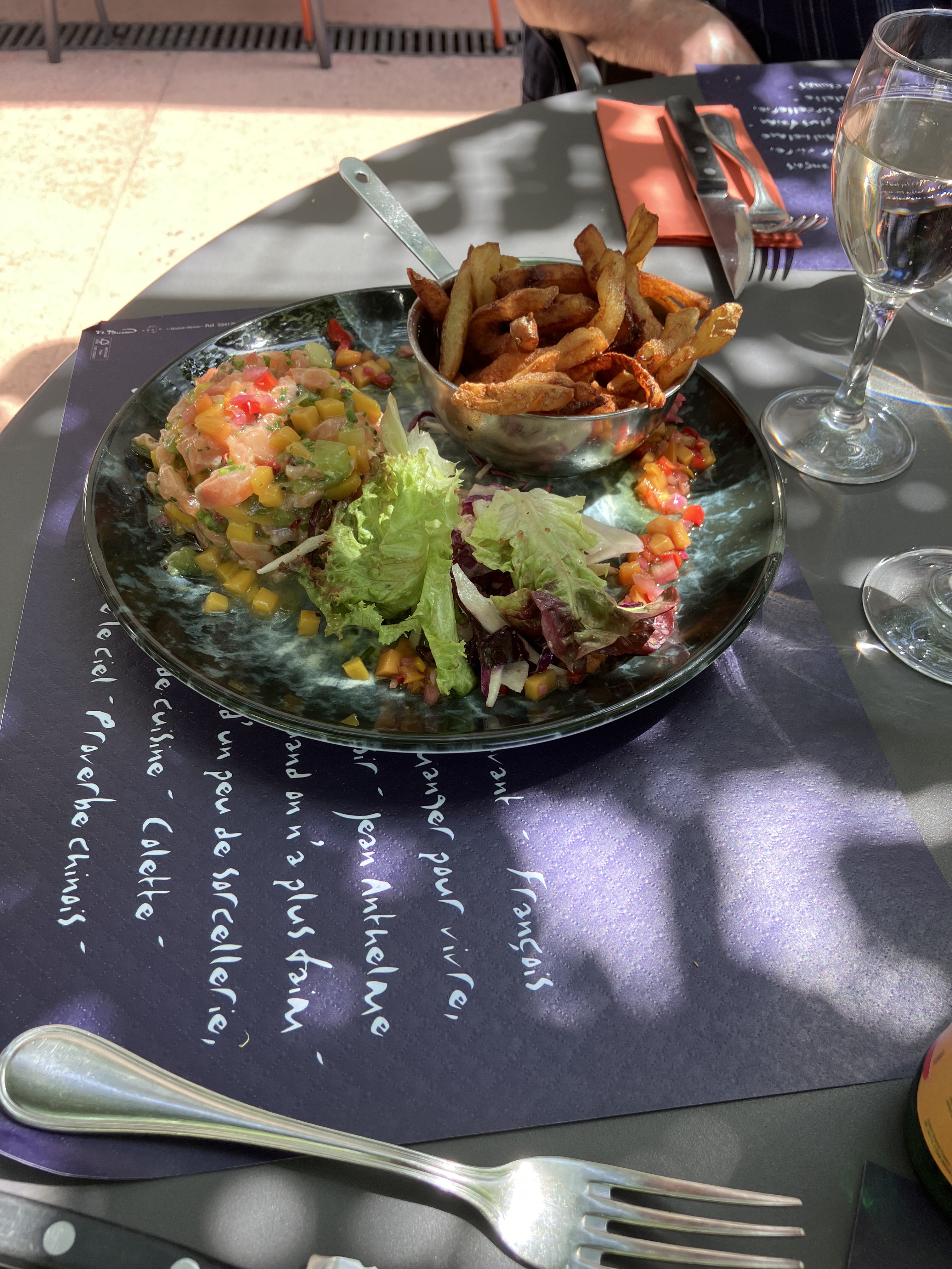 Sortie de confinement et premier moment terrasse. Il faut trouver une solution rapide et efficace. Lotentique offre sa belle terrasse ombragée sous les platanes...ombragée si le soleil avait été de la partie. Des formules midi très abordables avec une cuisine simple et bonne