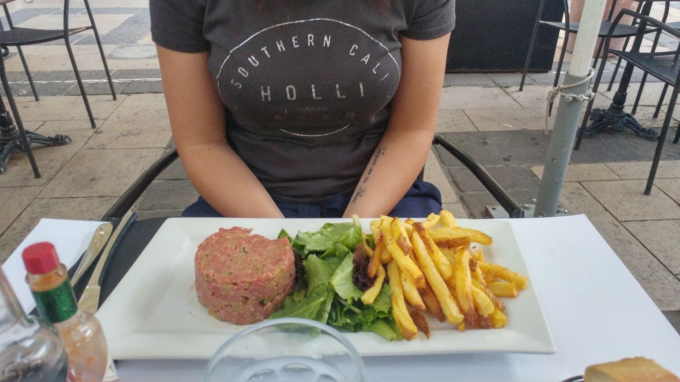 Nous avons déjeuné ici avec les gens. Le steak de papa était plus dur que l'enfer, maman a apprécié sa salade César (ils l'ont fait selon sa demande (sans anchois)), et le carpaccio de mon amoureux était médiocre (ce qui est difficile à rater, faites quelques câpres là-dessus, donne-lui un peu d'amour). Quant à ma salade niçoise : un embarras pour un aliment de base français par excellence... un tas très triste et très sec de thon en conserve, de grosses tranches de poivrons rouges, un énorme tas d'olives noires, de ciboulette séchée et de laitue. Assez décevant. La seule chose positive à laquelle je peux penser est l'emplacement qui est niché avec quelques autres cafés sur une petite place (Place Crillon) près de l'entrée du mur NW. Oh, et les frites étaient bonnes.