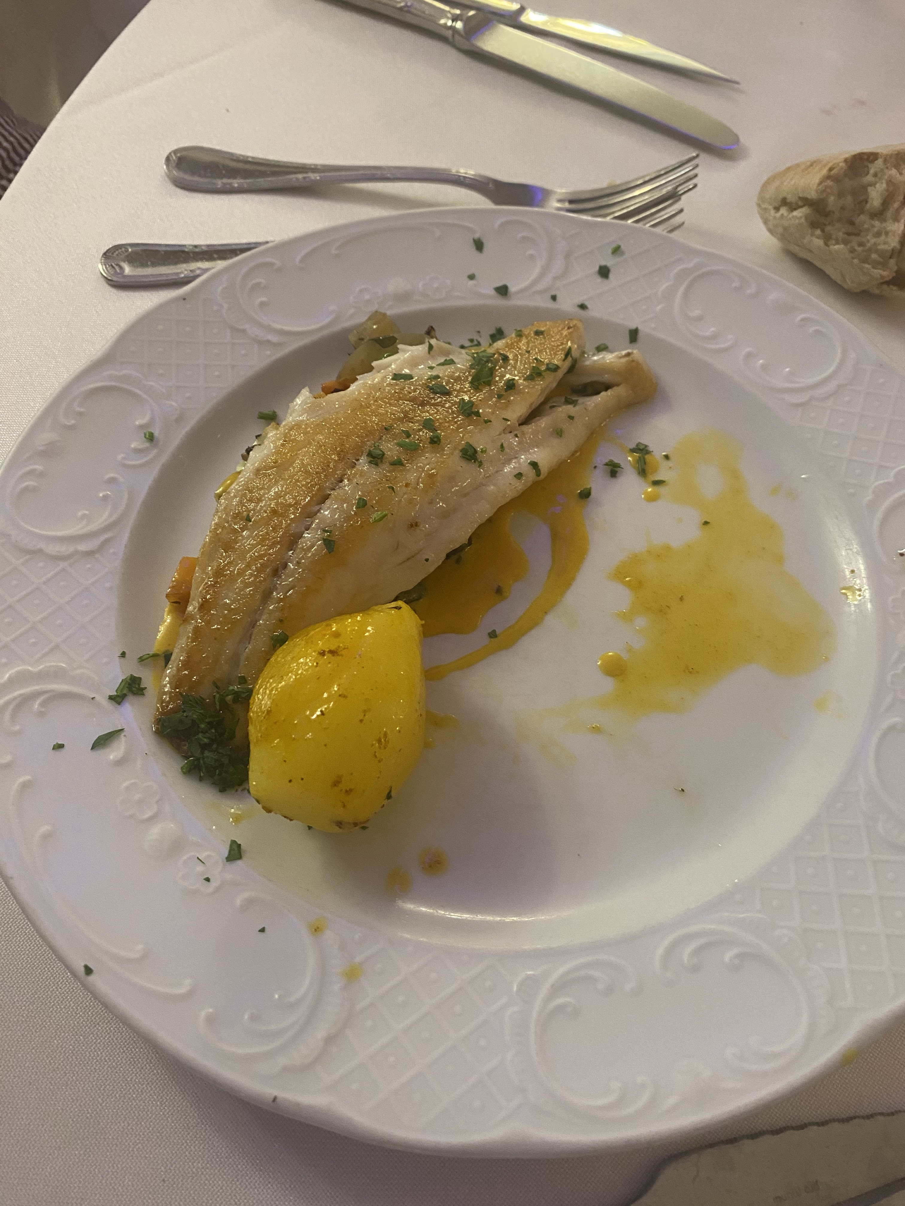 Délicieux moment. Je n'ai pris qu'un plat (filet de loup, poêlée d'artichauts et purée), Je me suis régalée et je n'avais plus de place pour le dessert. Le personnel est très attentionné. Je recommande egalement le buffet.