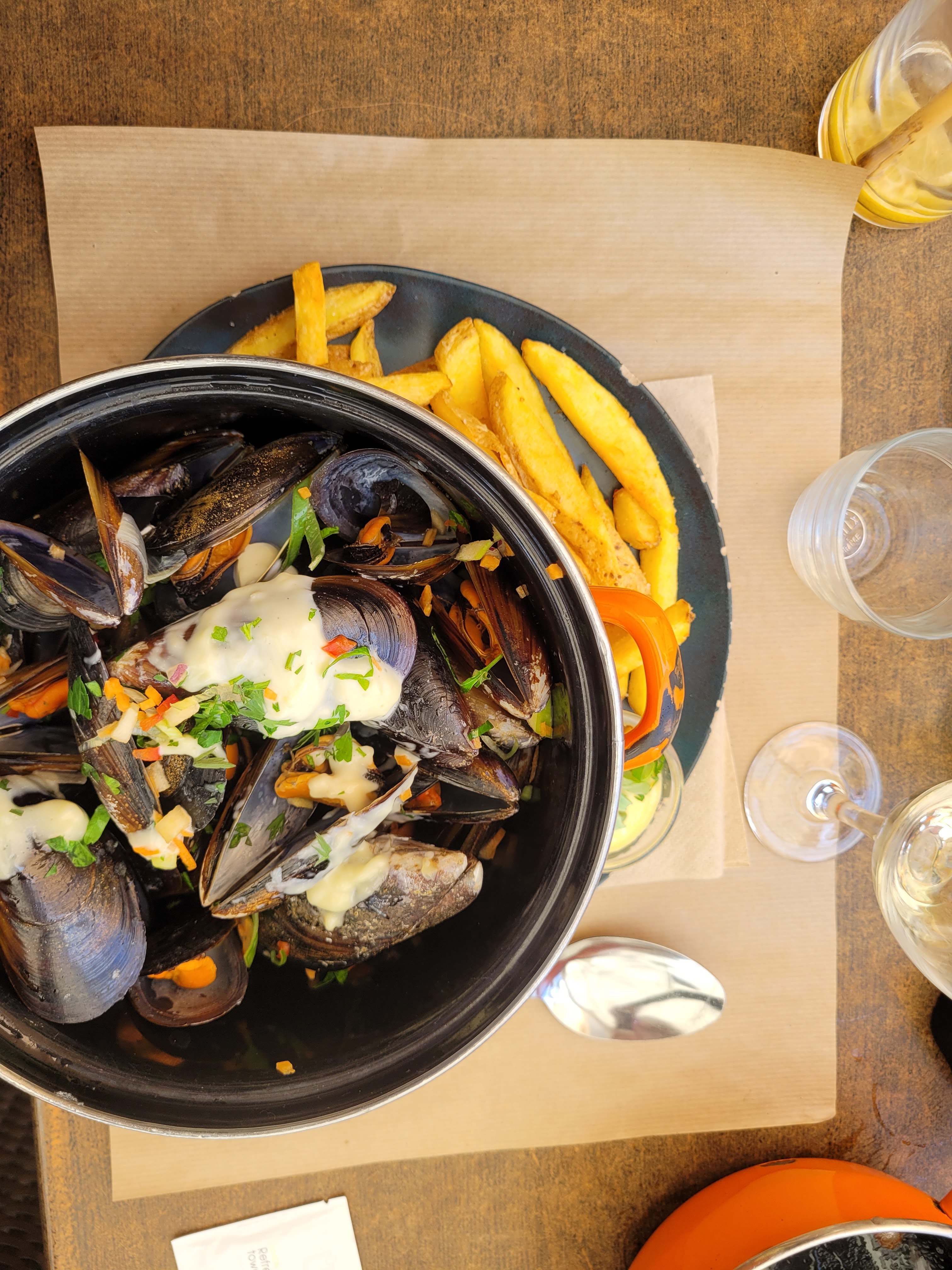 Temps d'attente très très long. Sauce sur les moules et non pas dans le vins blanc. Ce qui gache un peu le plat. Dommage. Du potentiel.