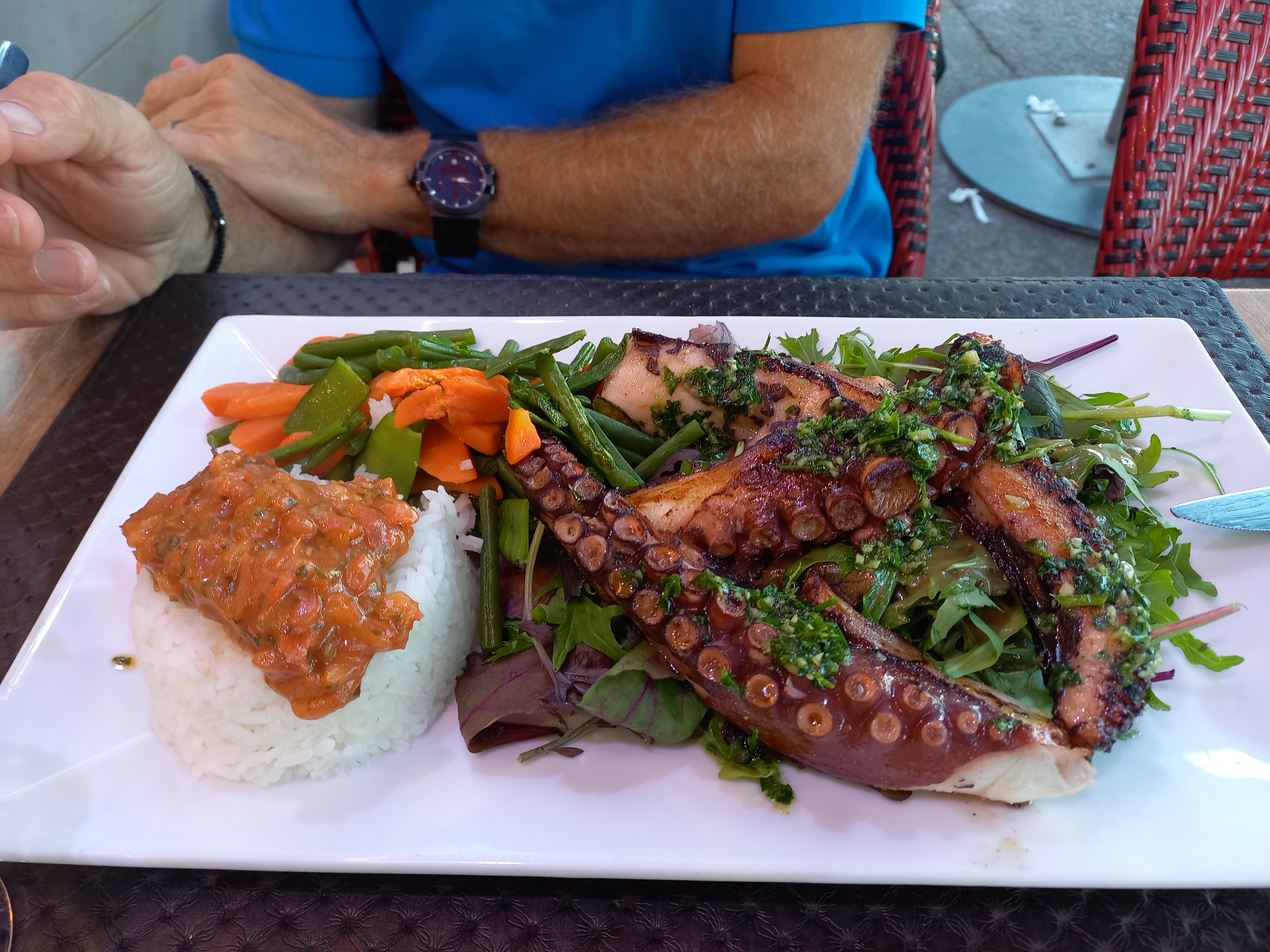 Steak de thon aux riz safrané et petits légumes excellent! Juste le service un peu plus long en fin de repas sinon c'était très bien, nous y retournerons.