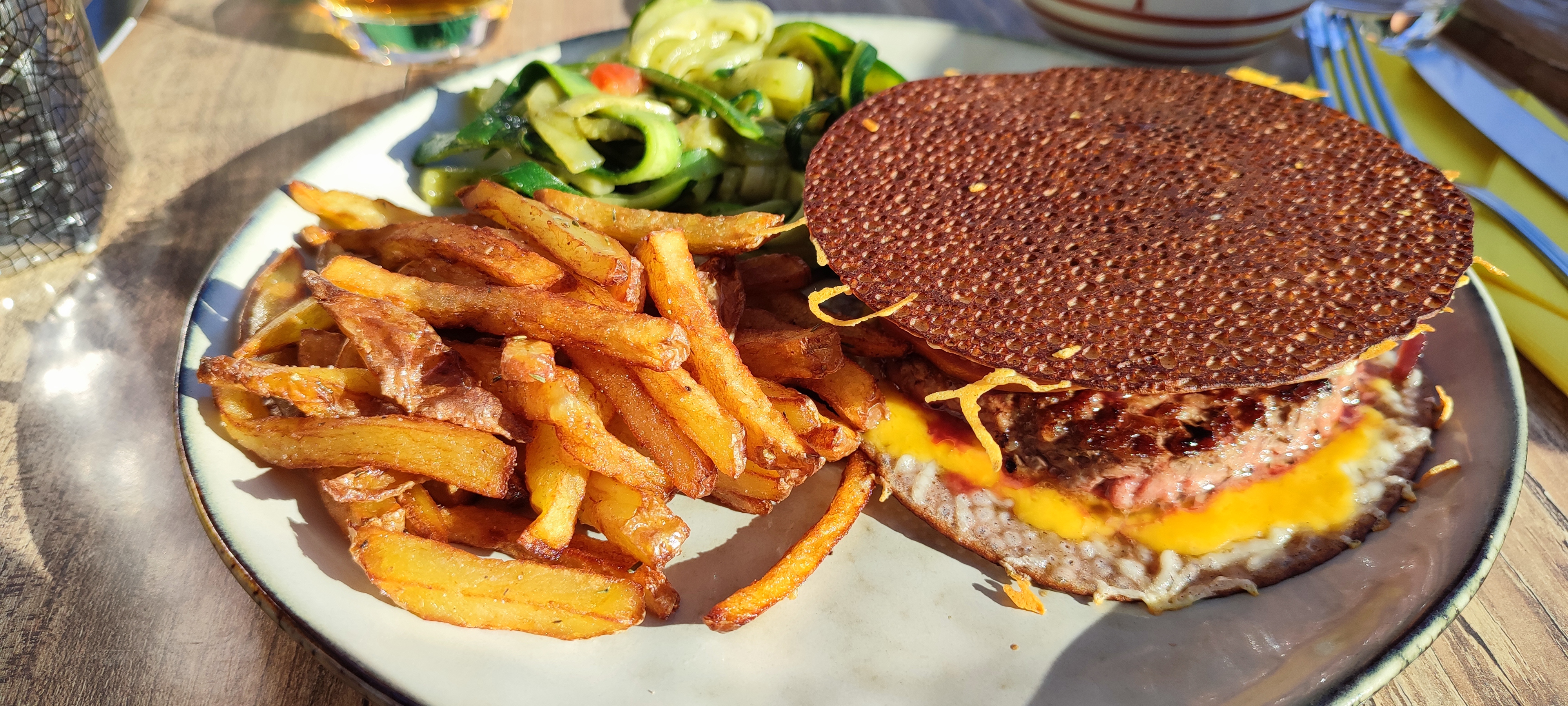 Une galette toastée fait office de pain Burger. Ça surprend mais c’est bon et différent. Le Veggie est top! « Viande » Beyond the meat » qui fait son effet. Prix de ce Burger 15,90€. Personnel agréable. Frites maison.