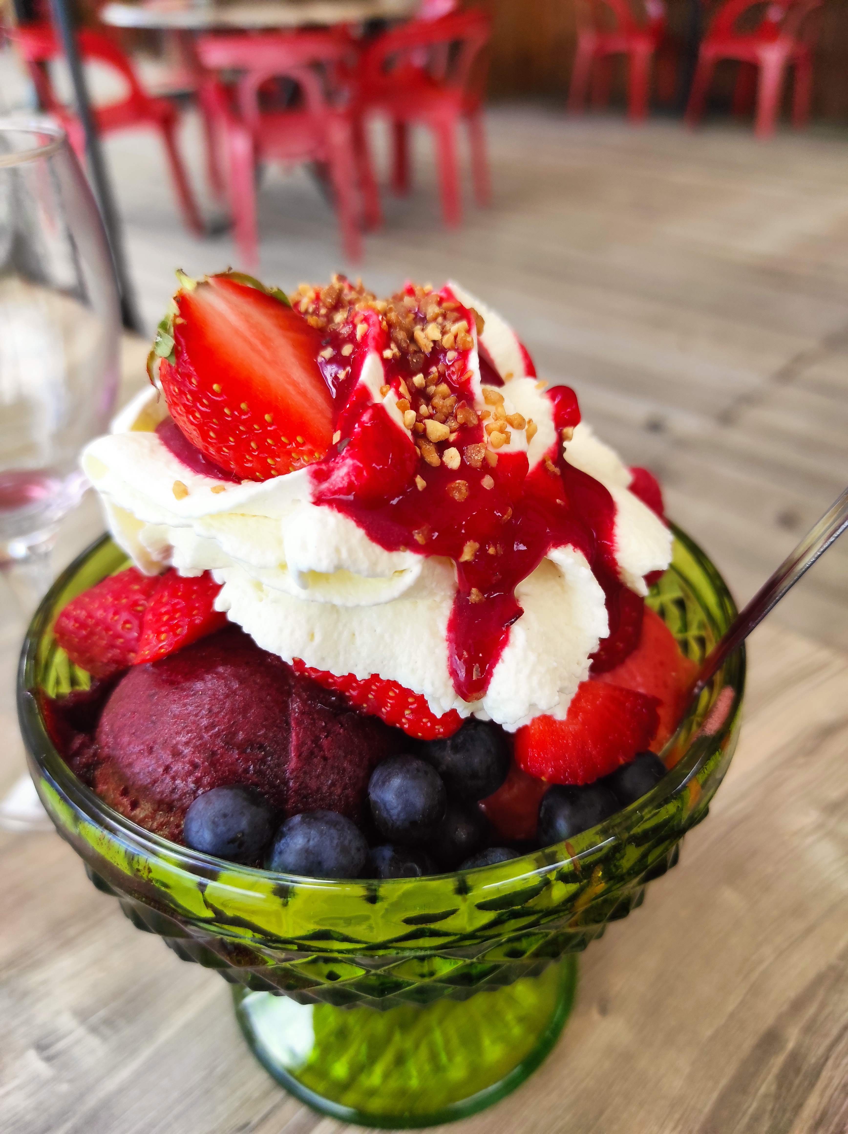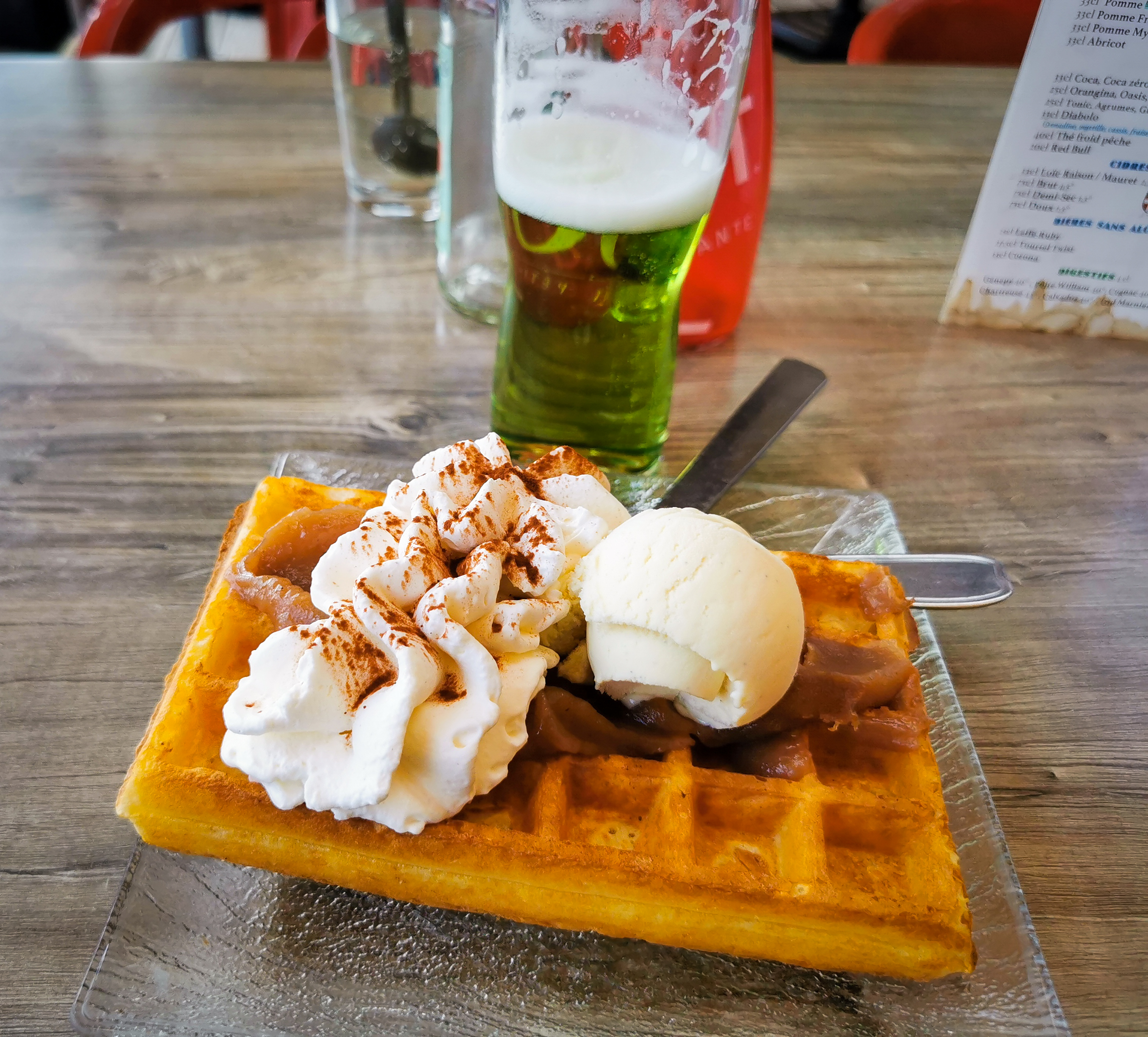Personnel très sympa Superbe terrasse Délicieux produits sauf la gaufre notée artisan belge et étant clairement industrielle Un peu cher 🤪