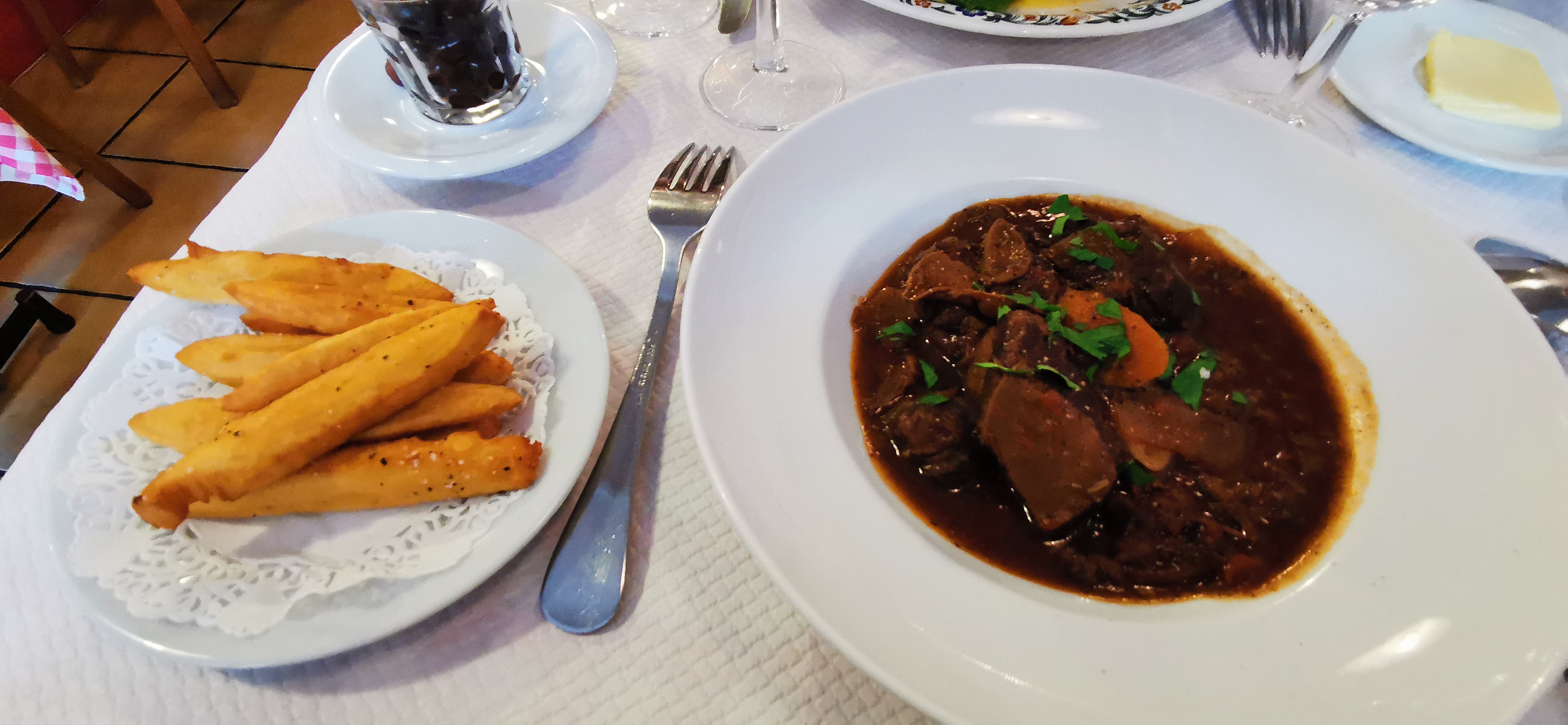C'est un vrai joyau. Merveilleux bistrot avec des assiettes onctueuses de délices de saison. Charmant duo au service de &? préparer la nourriture. Petit endroit au charme infini. Maître d'hôtel est un hôte des plus divertissants qui fait néanmoins savoir clairement lorsqu'il désapprouve vos choix. Les points forts étaient le ragoût de poulpe, le bœuf, des éloges particuliers pour les frites les plus légères et un blanc maison exceptionnel. J'aurais aimé que ce soit notre local. Malheureusement, nous n'aurons peut-être pas l'occasion de revenir avant un certain temps. Recommande fortement .