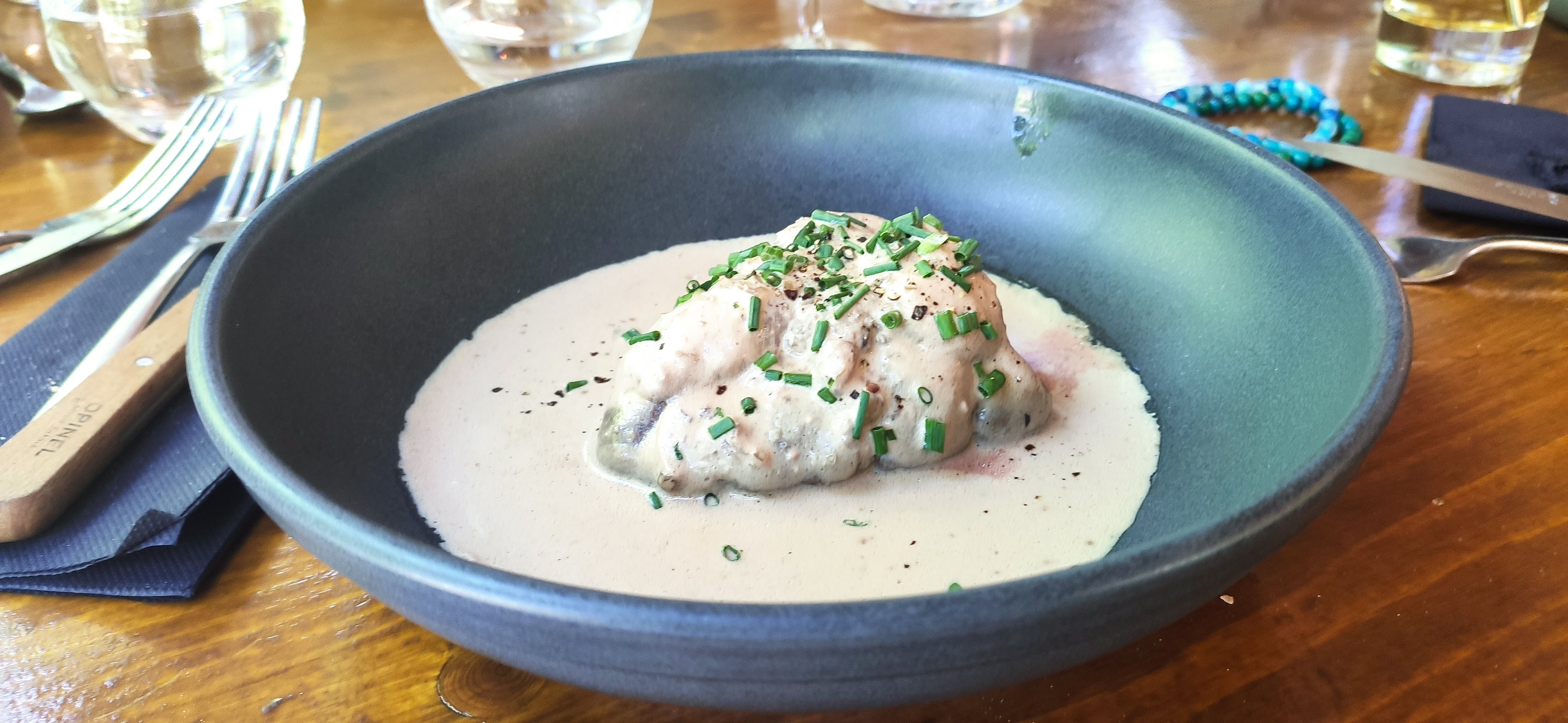 En 3 mots J'ai ADORÉ. Je ne sais pas par quoi commencer : le cadre magnifique de cette tente sous les noyers de La Roque Gageac ? L'accueil très chaleureux et juste du serveur ? Les promesses gourmandes de la carte et des suggestions du jour ? La qualité des produits, des plats et du dressage ? La générosité des portions ? La gentillesse des (très) jeunes chefs qui ont l'air de se régaler à voir les gens faire de même ? Bref, une expérience hyper agréable, que je recommande. Pour ma part, j'ai mangé un ris de veau absolument succulent et ma chérie un maki de viande de bœuf maturée, noisettes et poireaux. Une tuerie !