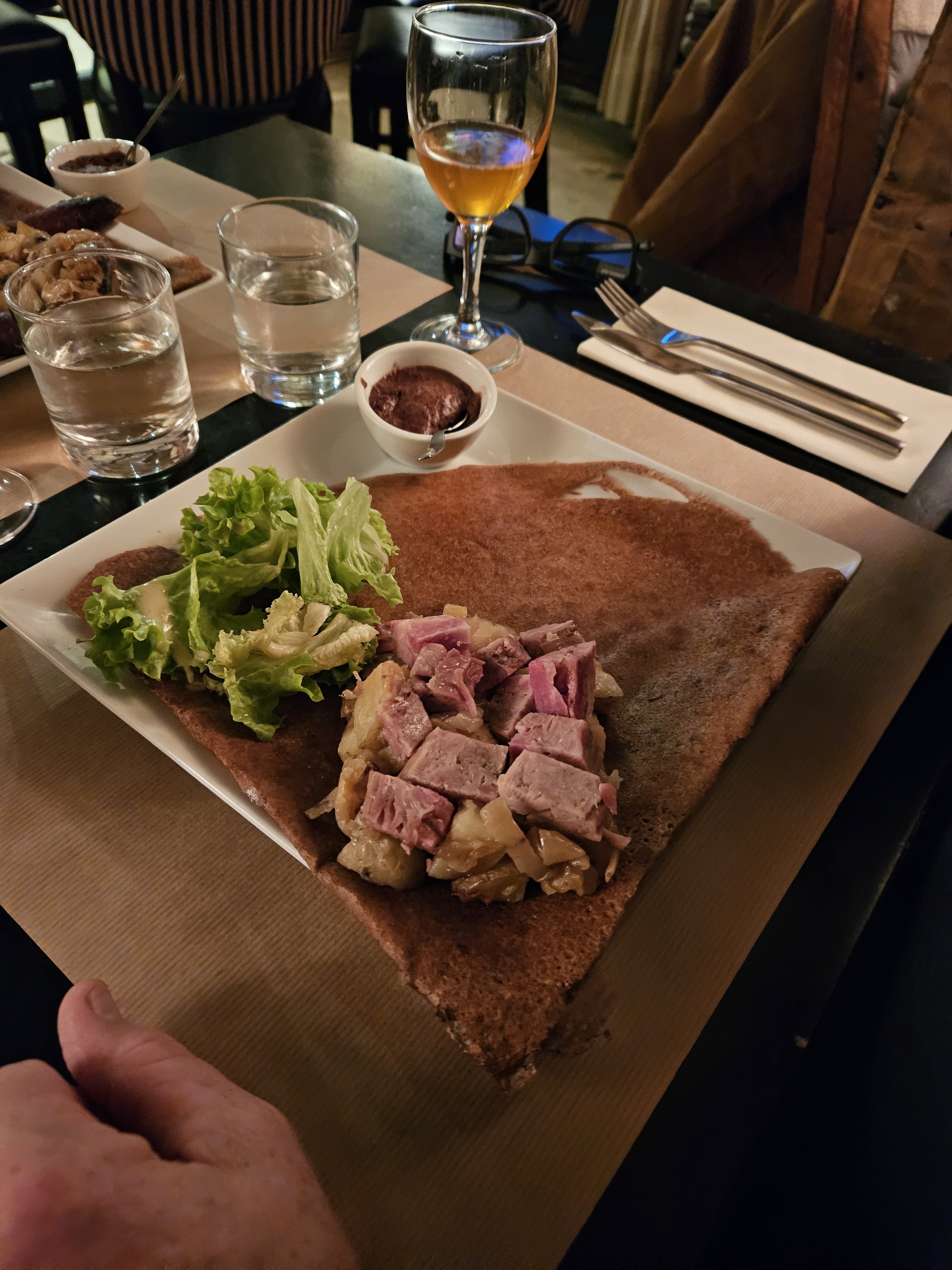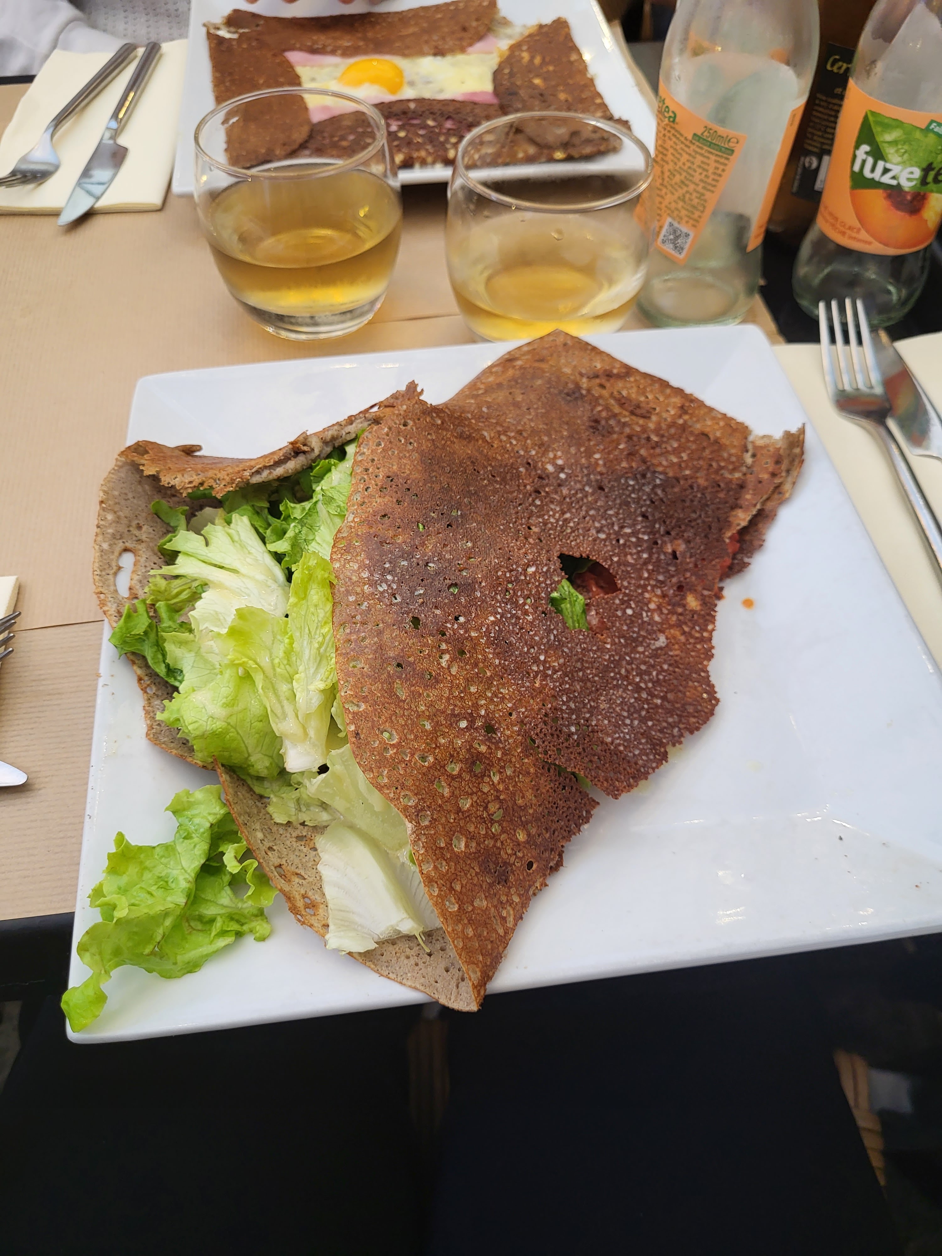 Très bon déjeuner passé. Beaucoup de monde qui n'était pas facile pour le service mais le personnel est tellement gentil qu'on ne peut pas leur en vouloir. Les galettes de blé noir sont savoureuses. Idem pour les galettes de froment. Coup de cœur de cette belle ville. Ne pas hésiter !