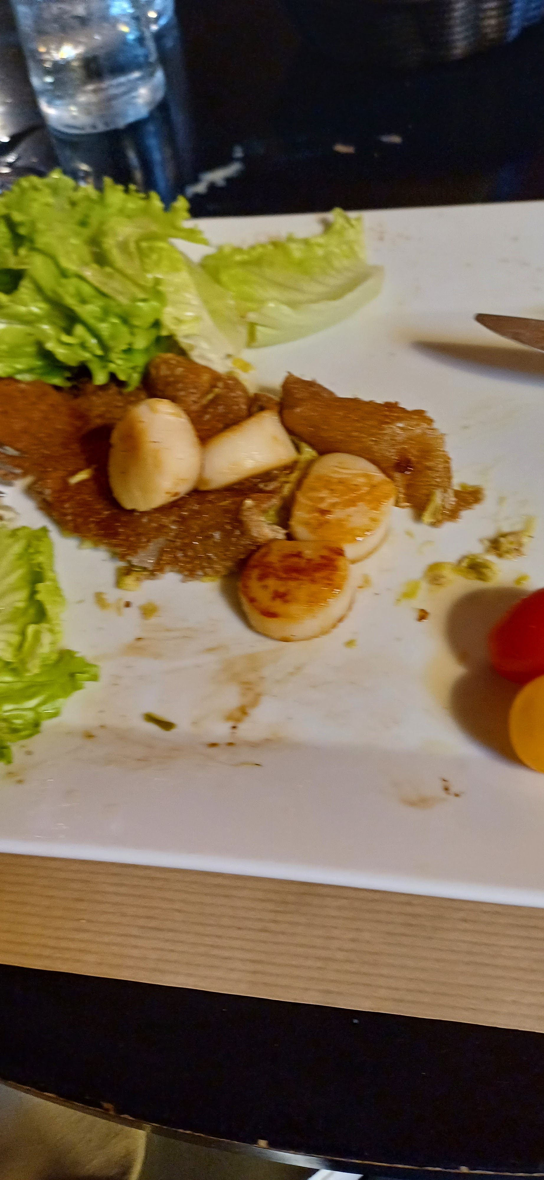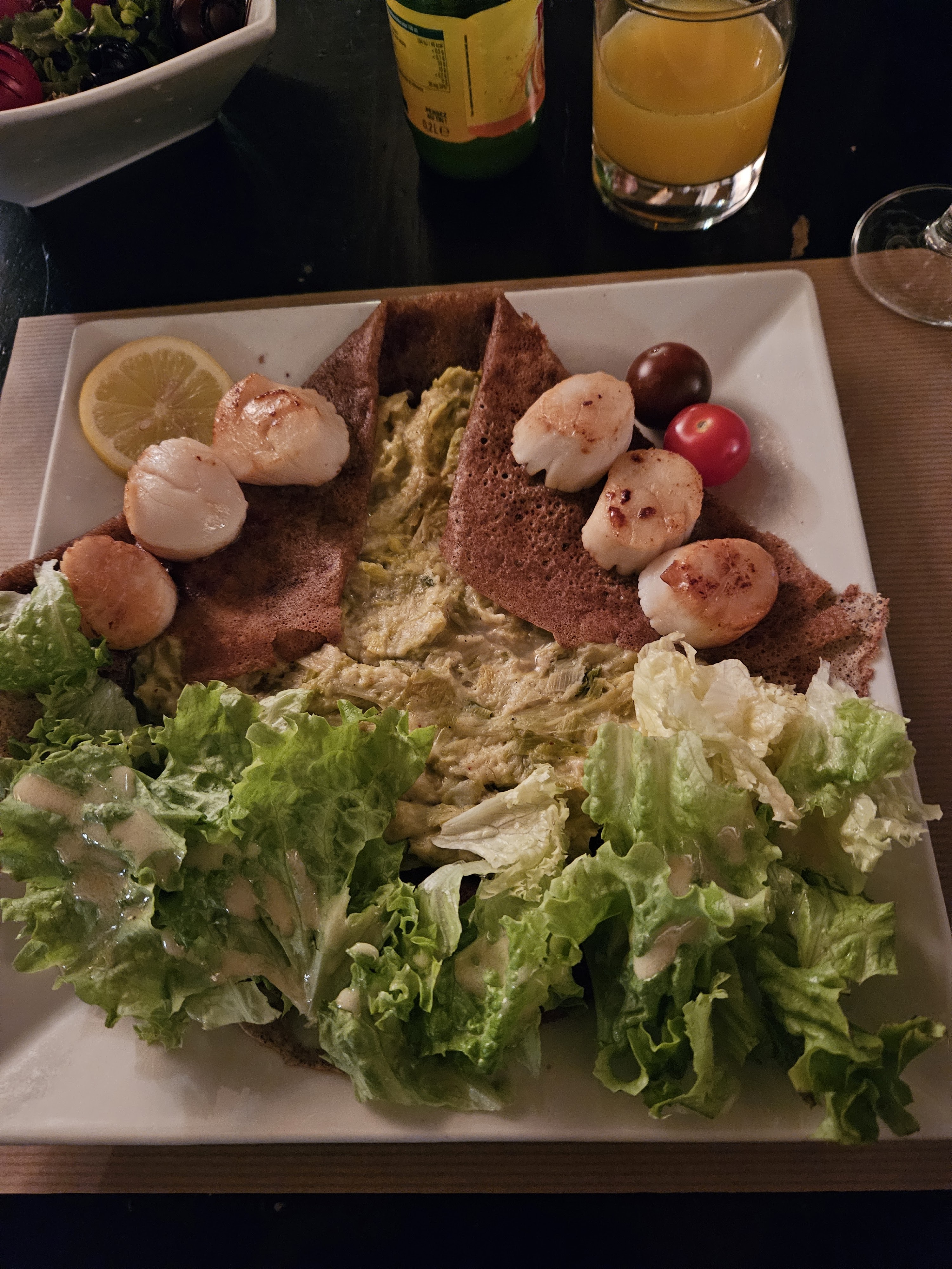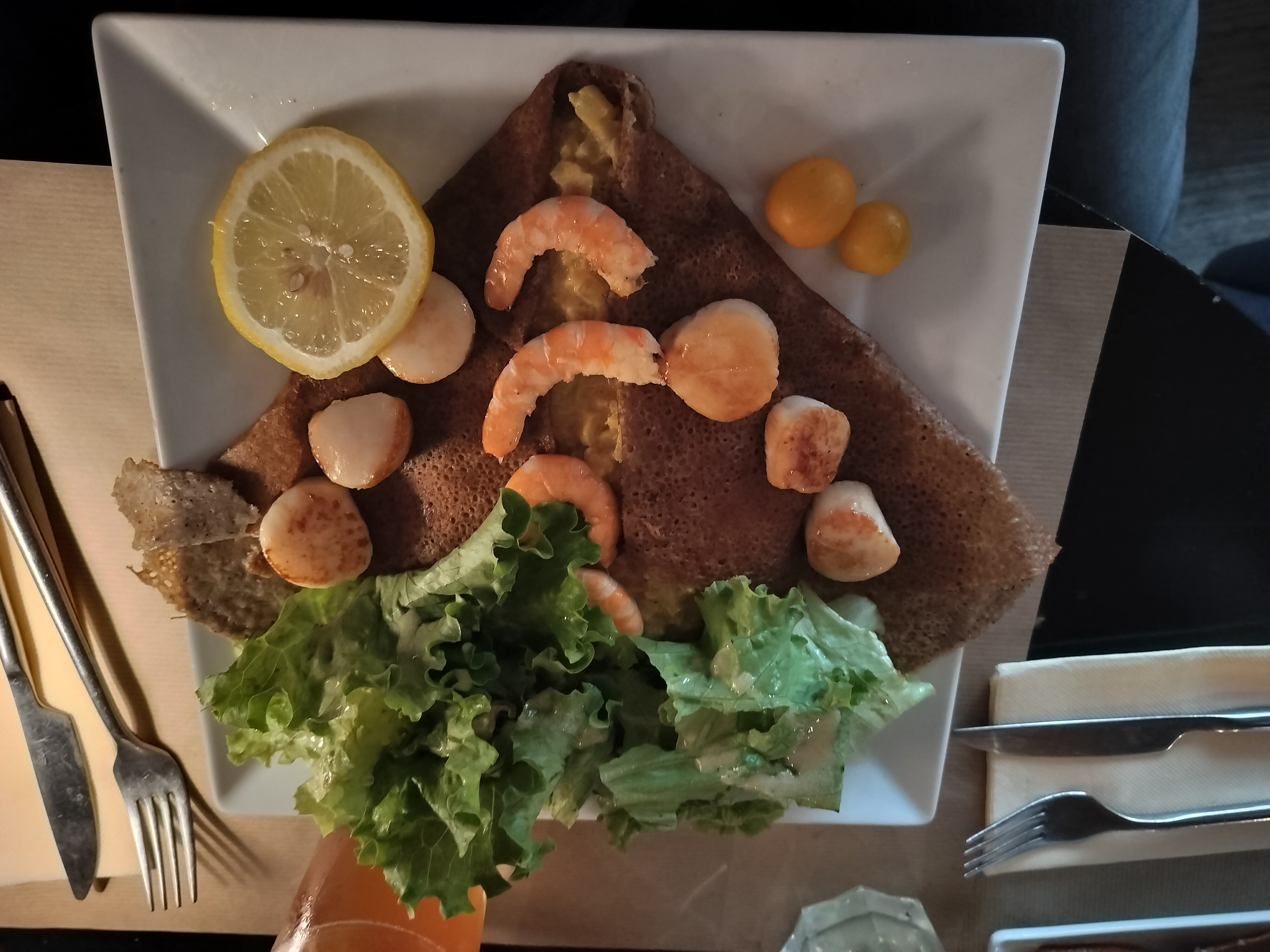 Un peu déçu de la crêpe de la mer avec quelques noix de Saint jacques et quelques petites crevettes ... La crepe dessert était très bonne !