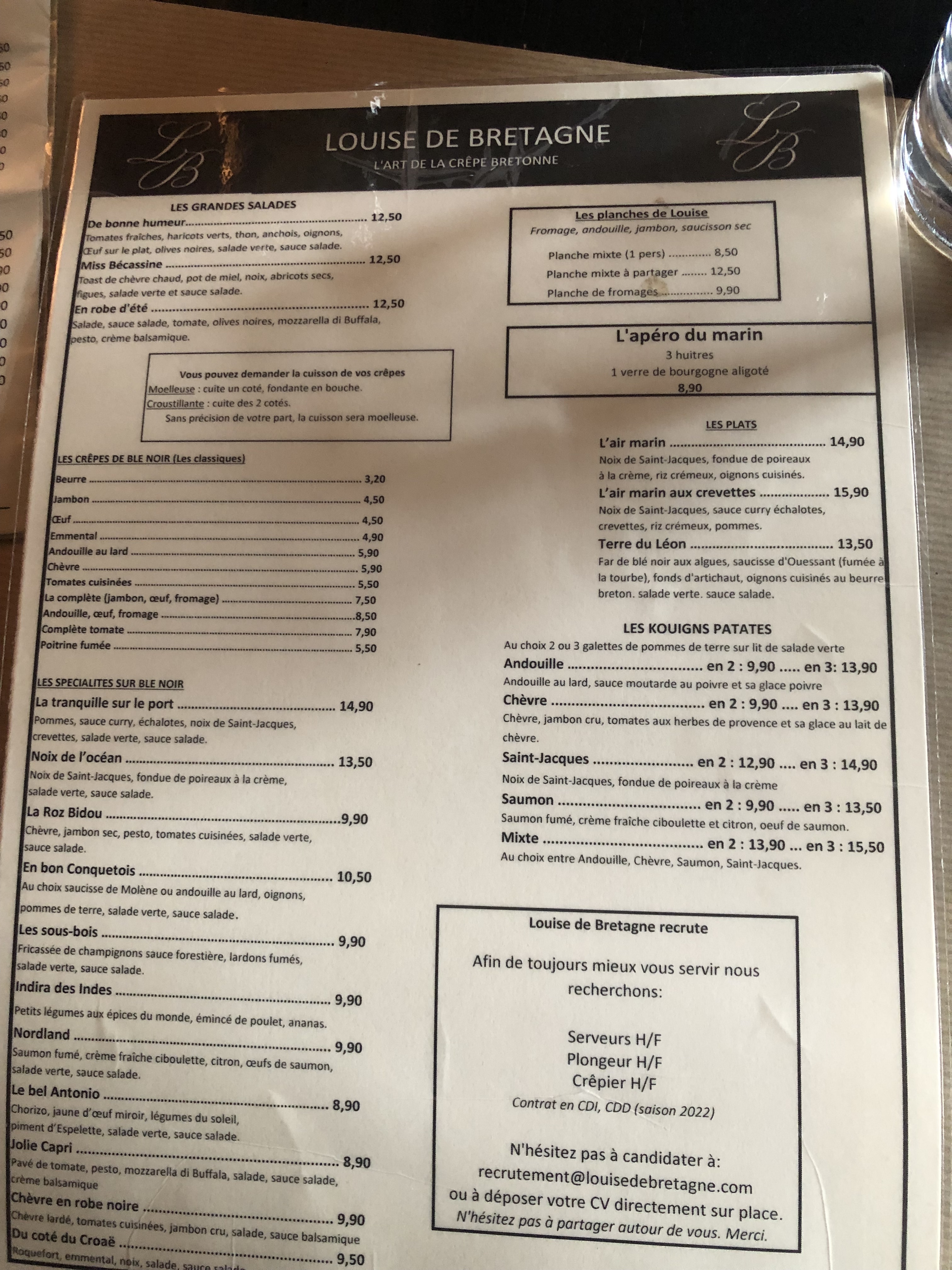 Nous y revenons avec grand plaisir chaque année ! Au coeur du conquet, la facade de Louise de Bretagne est très jolie, il y a quelques tables à l'exterieur coté rue et aussi une terrasse à laquelle vous accéder par l'intérieur, mais on préfère manger à l'interieur, avec les pierres et les poutres, on aime bien l'ambiance. La propriétaire est une pépite, avec son accent breton à sa tendance à courir dans tous les sens, ce qui ne l'empeche pas de s'arreter pour discuter un peu avec vous et parler de tout et de rien. Les serveuses sont très bien également, parfois un peu d'hésitations entre elles mais aucun problème, elles sont polies et disponibles. Lors de notre dernier passage, nous avons d'abord partagé un kouign patatez, des galettes de pomme de terre avec des accompagnements différents suivant votre choix, chevre jambon cru et tomates de mémoire pour nous. Nous avons partagé 3 galettes à 3, et c'était largement assez. En crepes, on aime la possibilité de pouvoir choisir sa cuisson, ca nous enerve quand le chef choisit pour nous au titre de l'usage, ici on choisit et c'est très bien comme ca. On a pris une roz bidou, chevre jambon cru pesto, toujours une réussite, et une tranquille sur le port, à base notamment de curry et crevettes, elle aussi toujours très bonne, quantités très honnètes, et équilibre entre gout de la crepe et gout de la garniture, pas si simple figurez vous! En dessert, la crepe choisie était à base de glace cacahuète, chocolat fondu et chantilly, le nom était la pirouette cacahuete de mémoire, délicieuse mais difficile à terminer après l'entrée et la crepe salée! Bref, toujours une expérience réussie à Louise de Bretagne, il n'y a jamais 0 chances de se tromper, mais c'est une valeur sure selon nous. Si cet avis vous a plu, n'hésitez pas à mettre un petit j'aime et à nous suivre sur les réseaux sociaux en cherchant notre pseudo. Merci! Les Amoureux Voyageux Jérémy & Claudia