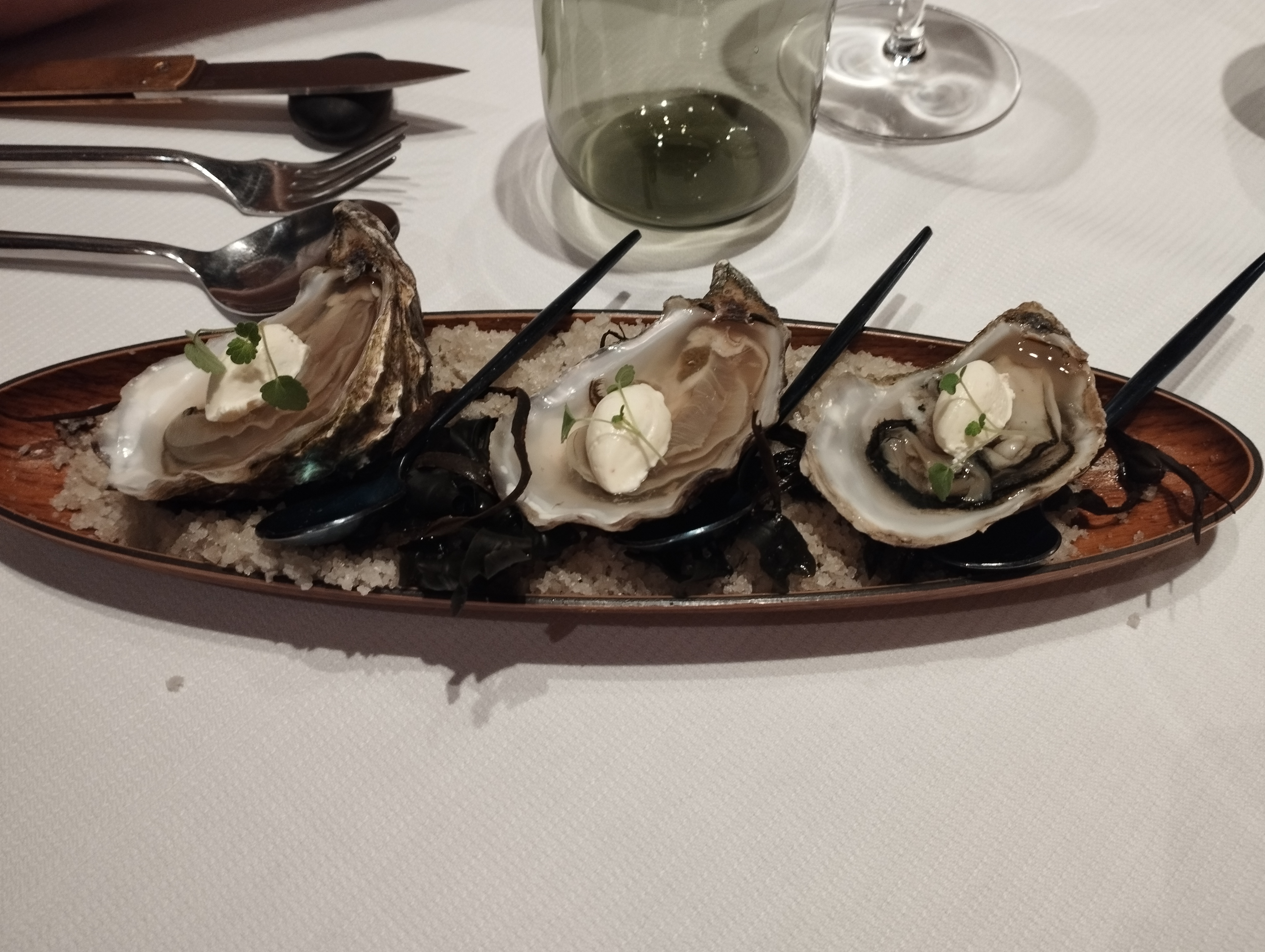 Restaurant de produits de la mer en 5 ou 8 ancrages, menu surprise. J'adore l'idée ! La salle est à l'image de la cuisine, moderne, sobre mais pleine de goût. J'aime bien le fait d'avoir vue sur la cuisine. Dans l'assiette, des saveurs du Japon avec des algues, du yuzu mais la Bretagne est également présente avec l'huître ou les artichauts. On sent que le menu a été pensé avec soin pour une expérience unique du début à la fin. Seul point négatif, la salle est un peu bruyante.