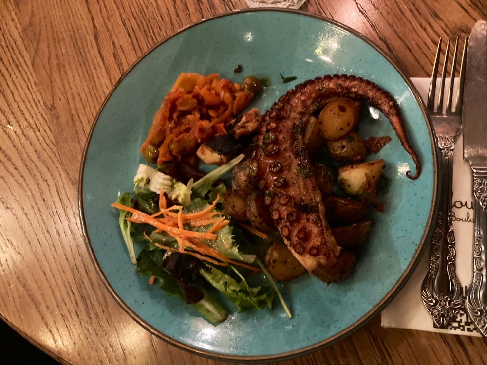 Ambiance sympa pour un 8 avril... Serveur et dîner parfait . Succombez au poulpe à la plancha.