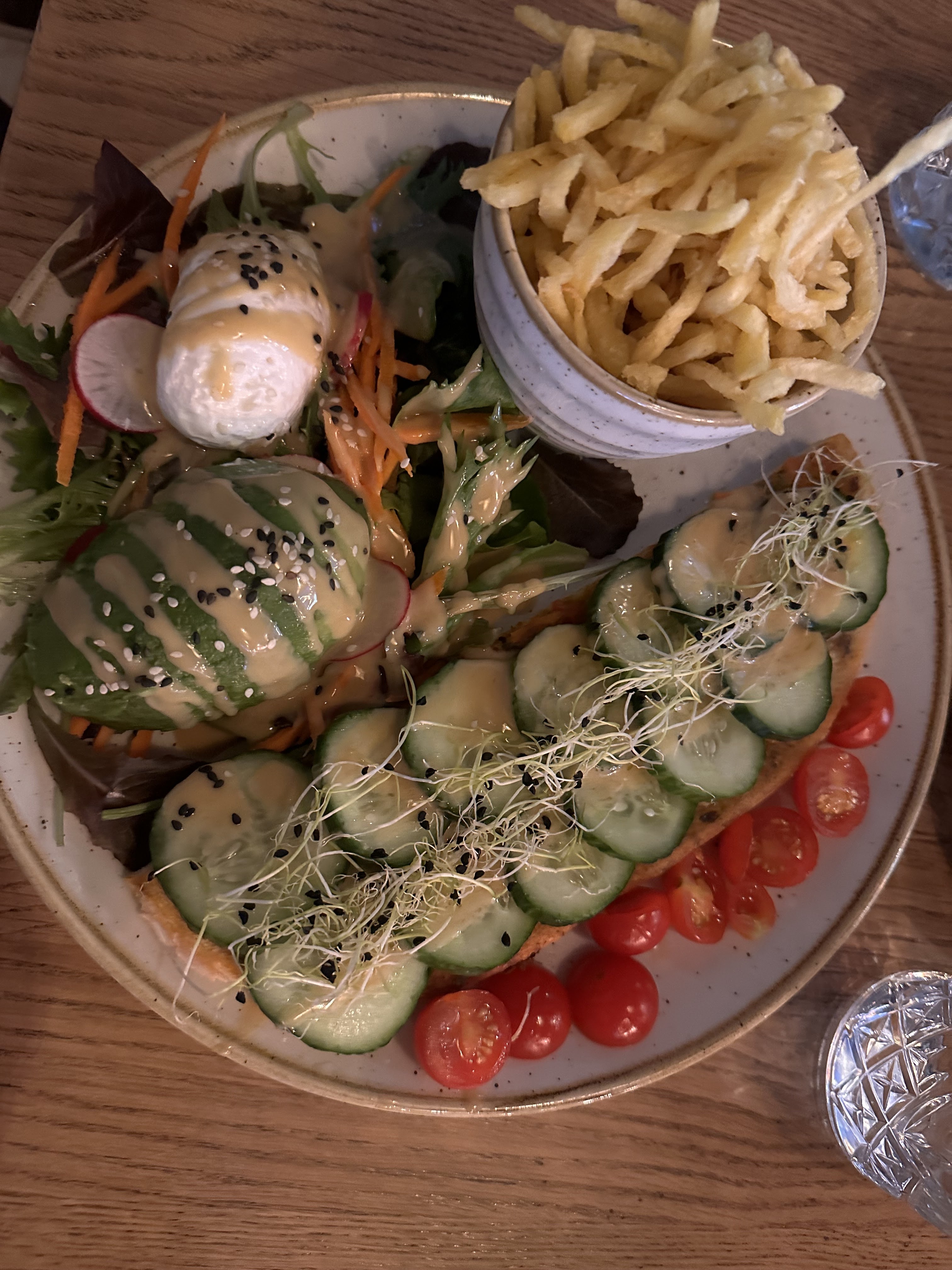 Quel délice. Repas entre copines. Nous nous sommes régalées toutes les 4. Le serveur était très sympa et bon vendeur 😉. J'ai pris une salade avocado (caviar d'aubergine sur du pain, tomates, tomates séchées, concombre, oeufs mollet, avocat, salade, frites...) et une tarte au citron restructurée.