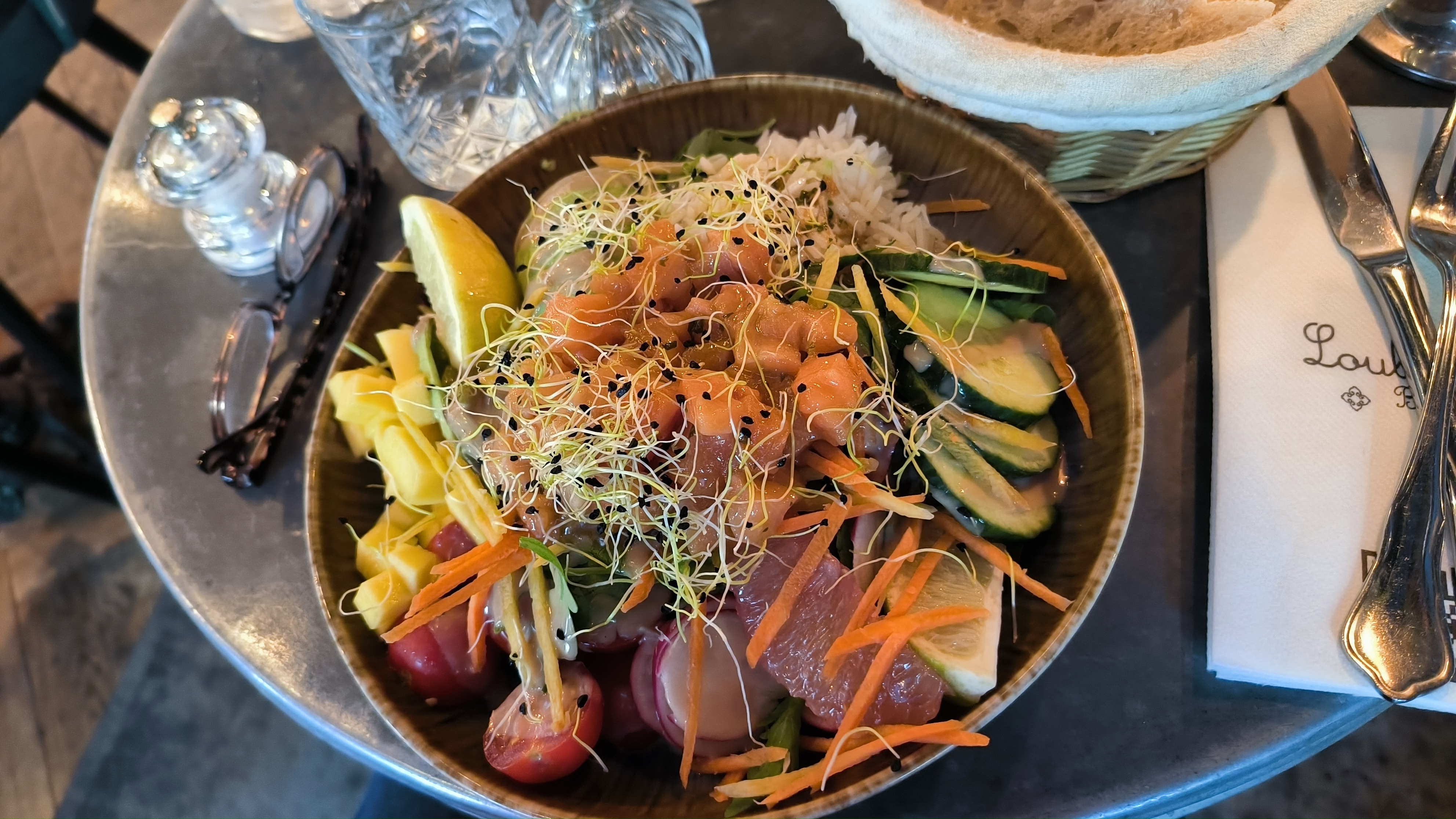 Un peu déçue, je m’attendais à mieux… malgré nos sollicitations, nous avons attendu une heure avant qu’on nous serve les boissons, qui ont heureusement été suivies rapidement par le plat. Jus d’orange pressé qui a vraiment le goût d’un jus d’orange en brique, et donc très décevant… Thon façon tataki bon, garnitures un peu décevantes qui manquent de relief. Très bon suprême de poulet à la sauce morilles, avec une viande tendre et pas sèche, et une très bonne sauce. Desserts (tarte citron déstructurée et tiramisù) très bons.