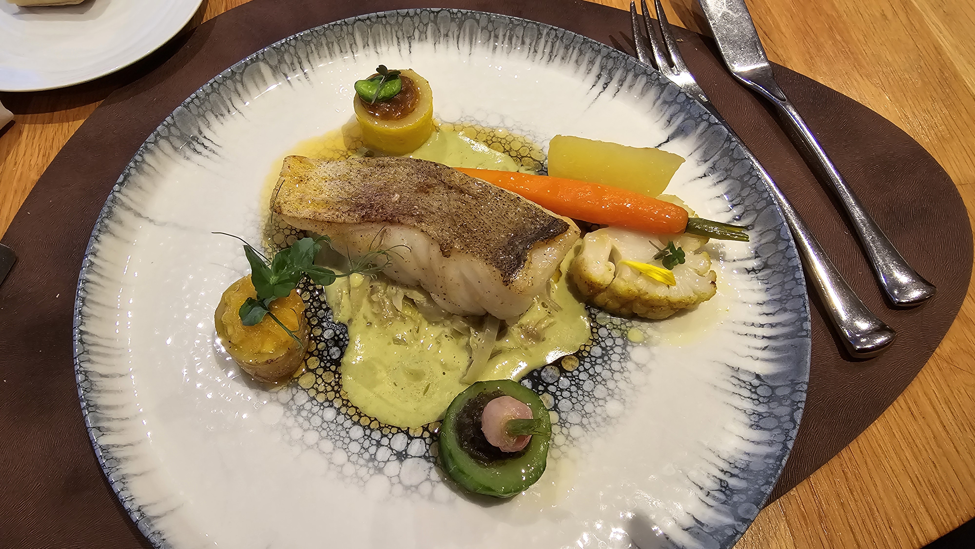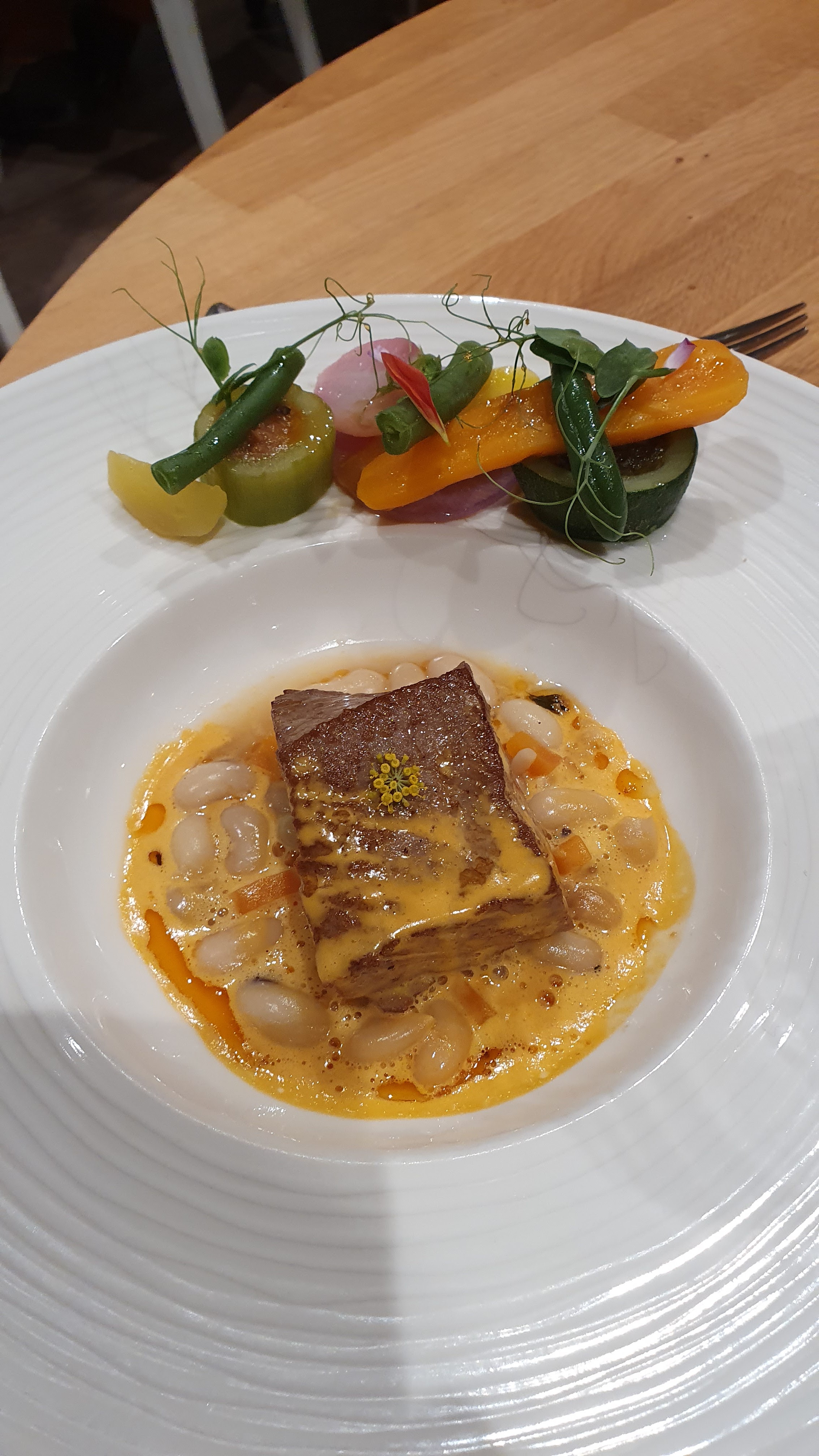 Beaucoup de potentiel. Une vue magnifique, de belles séances. Bonne nourriture, élégamment présentée. Cependant, le service était trop lent, les coquilles Saint-Jacques trop cuites et les portions trop petites. J'ai eu faim tout au long, surtout vers la fin du repas. N'oubliez pas les accompagnements s'il vous plaît.
